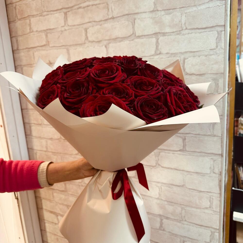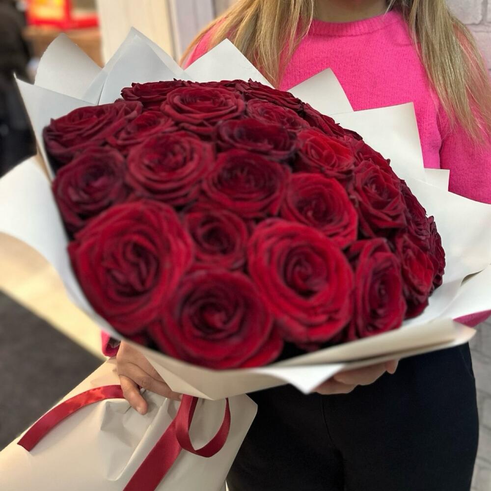 Лента атласная - 1 шт. Упаковка дизайнерская - 3 шт. Роза эквадор 50 см - 35 шт.