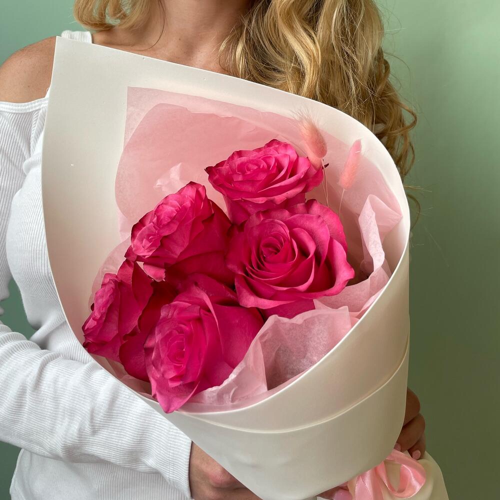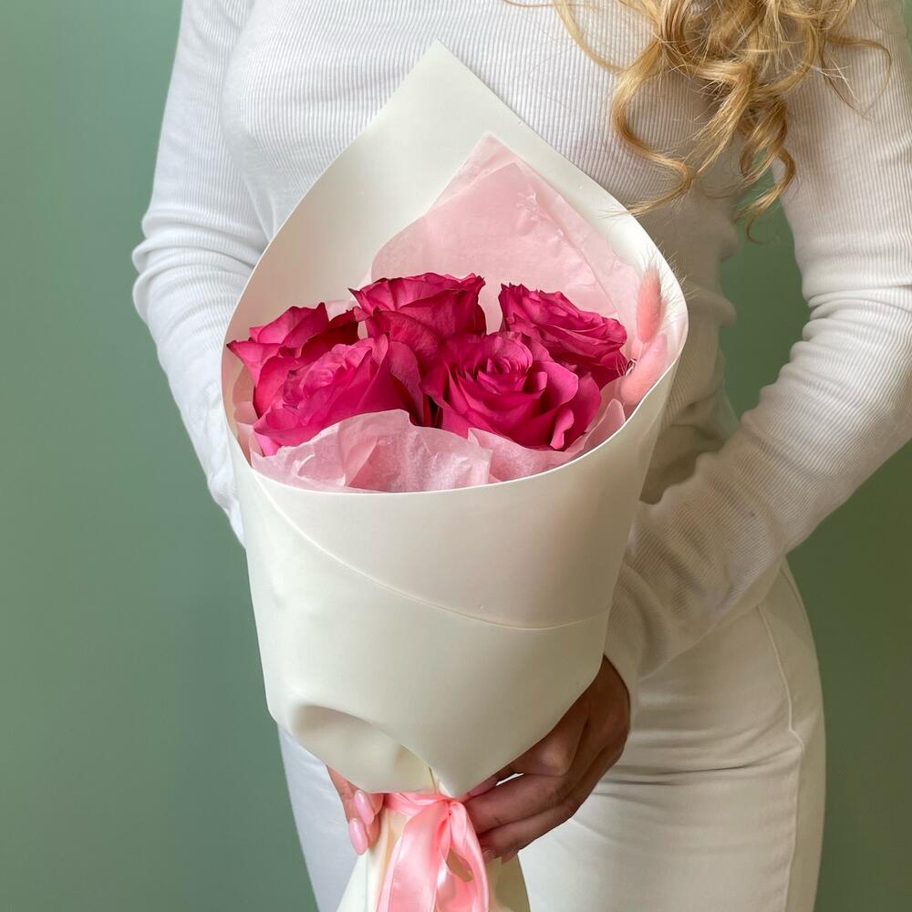 Роза Эквадор - 5 шт. Лента атласная - 1 шт. Упаковка дизайнерская - 2 шт. Лагурус (сухоцвет) - 3 шт.