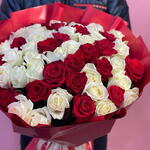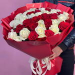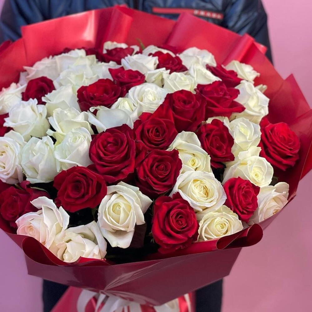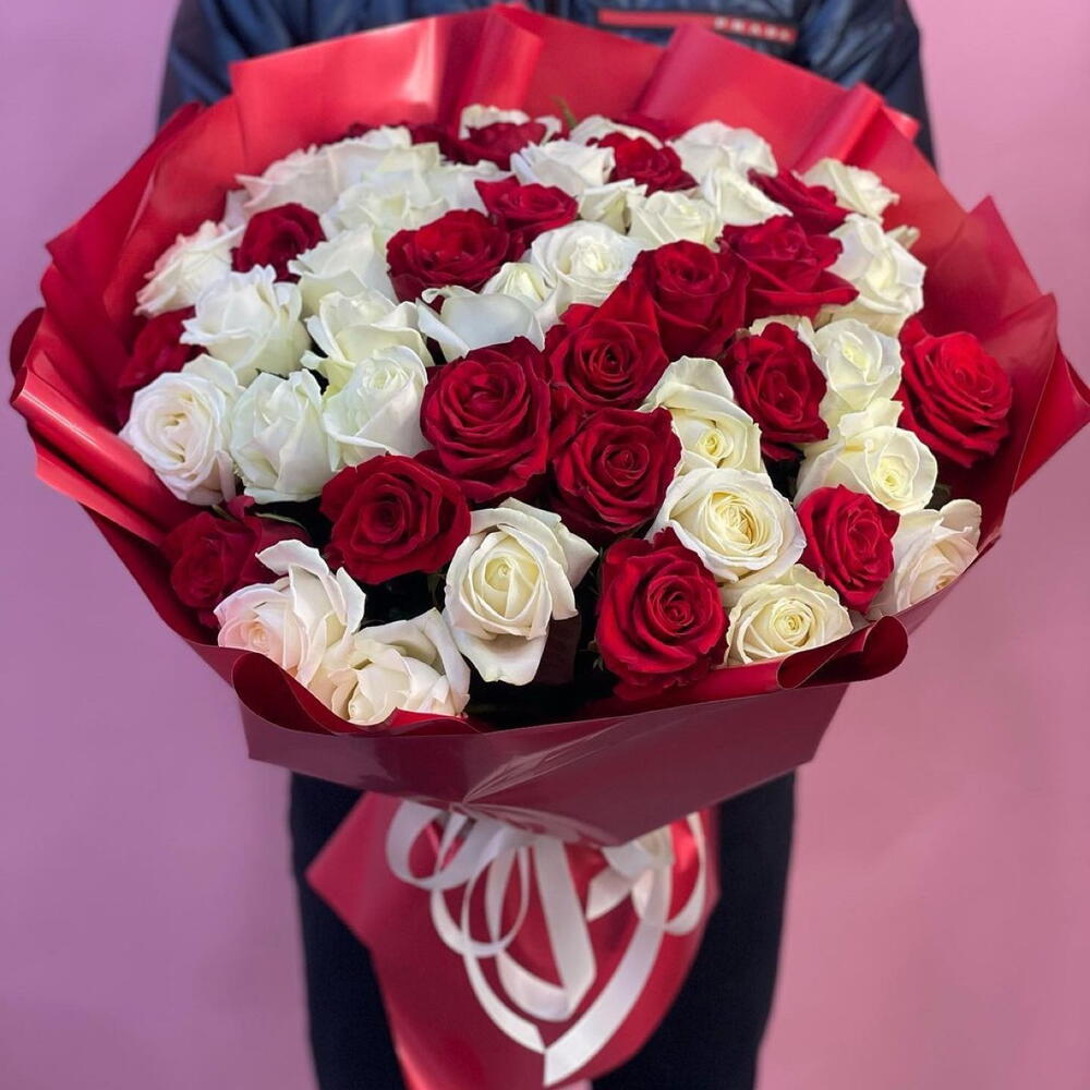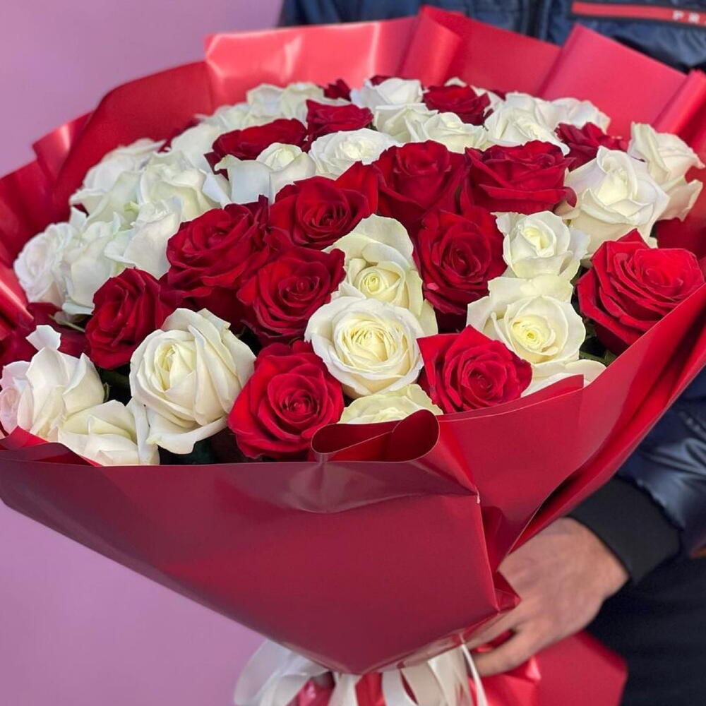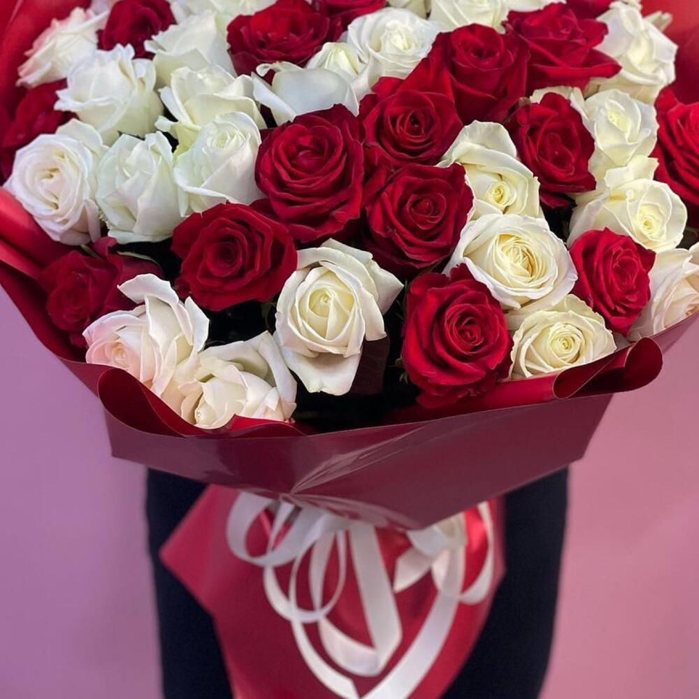 Лента атласная - 1 шт. Роза 50 см - 61 шт. Открыточка с вашими пожеланиями - 1 шт. Дизайнерское оформление - 1 шт. утеплитель для перевозки - 1 шт.