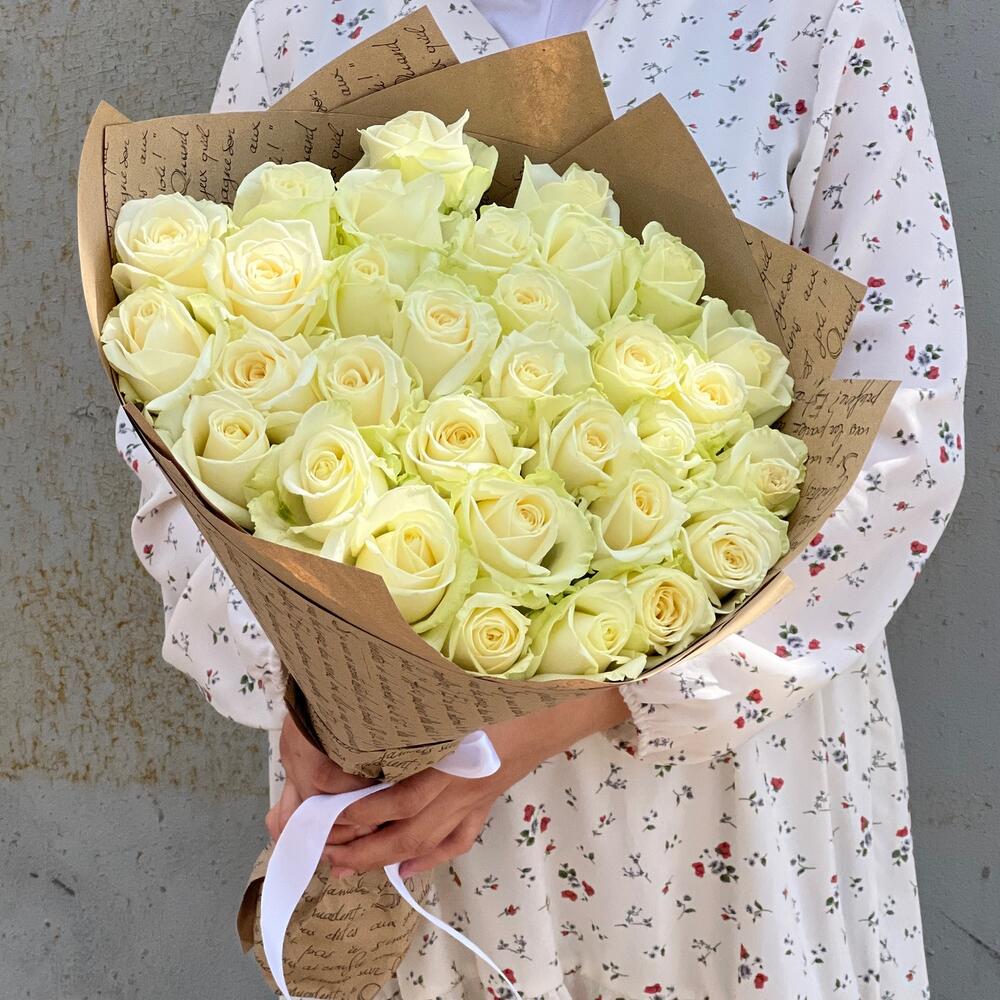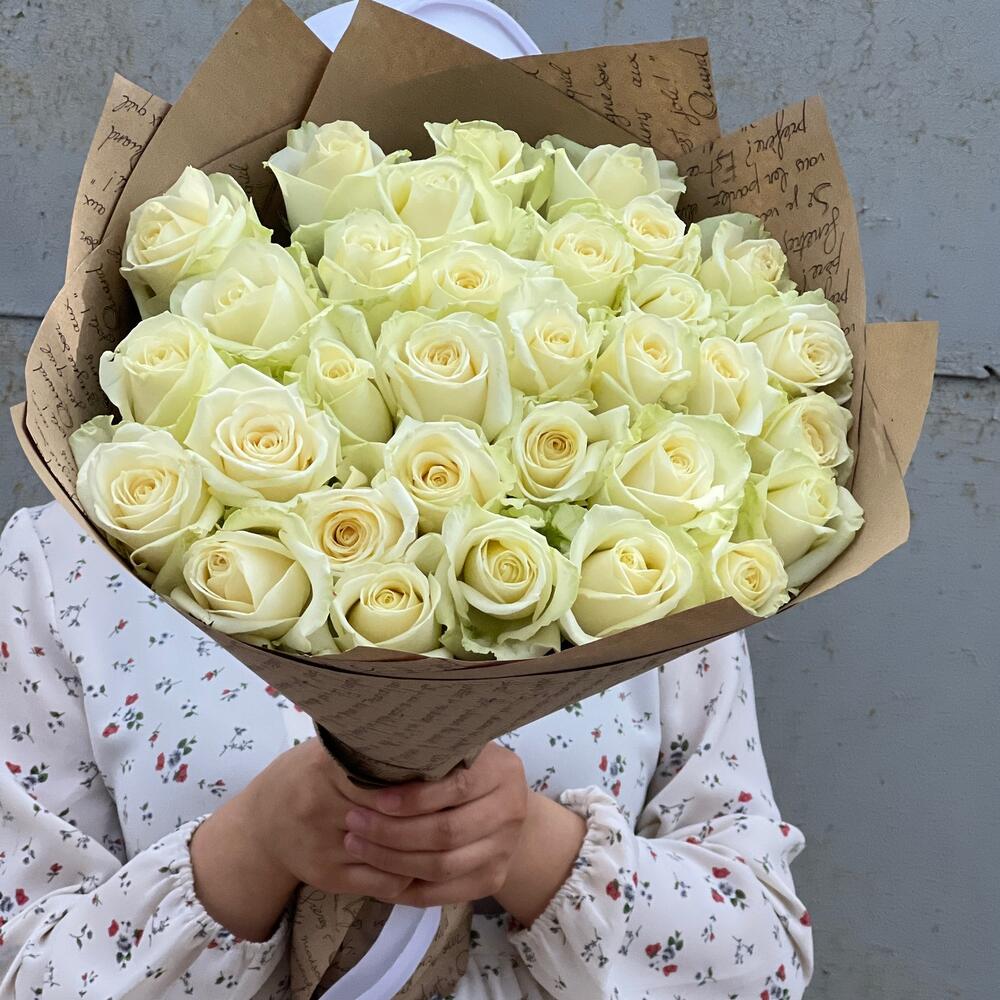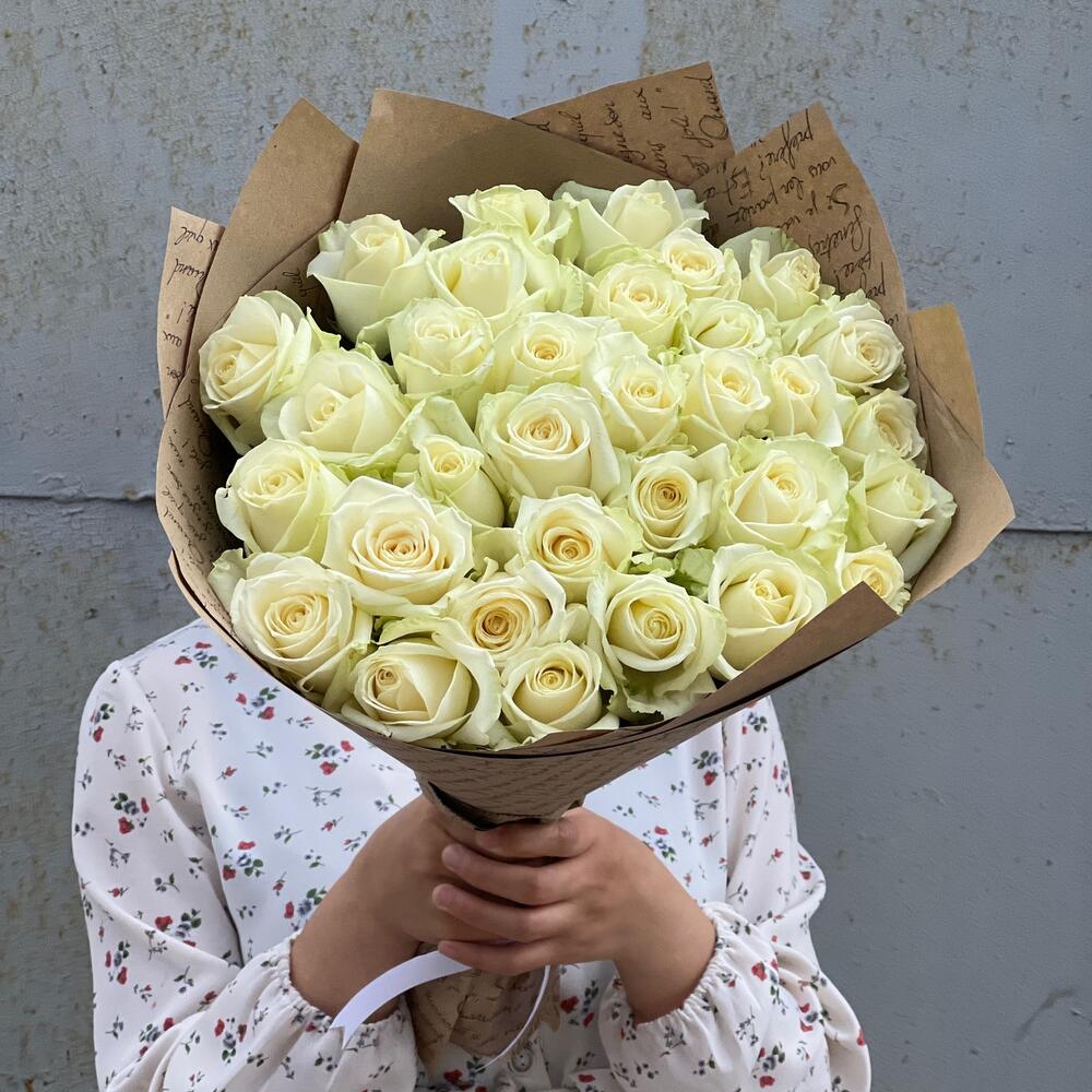 Роза Аваланж - 29 шт. Атласная лента - 1 шт. Крафт упаковка - 3 шт.