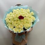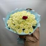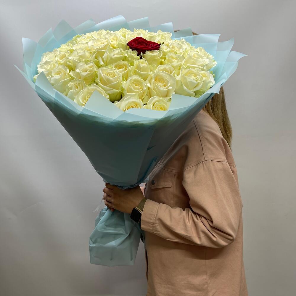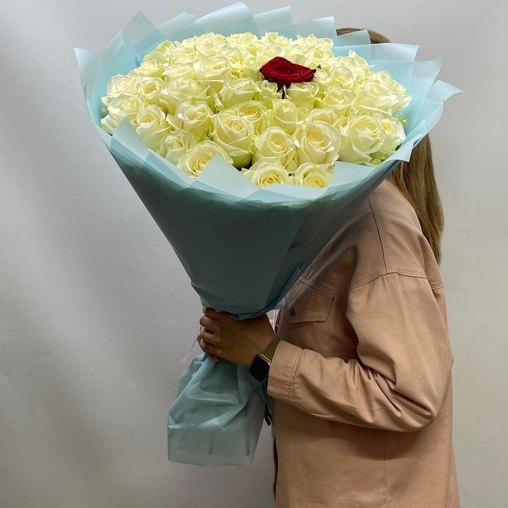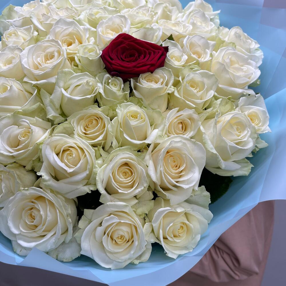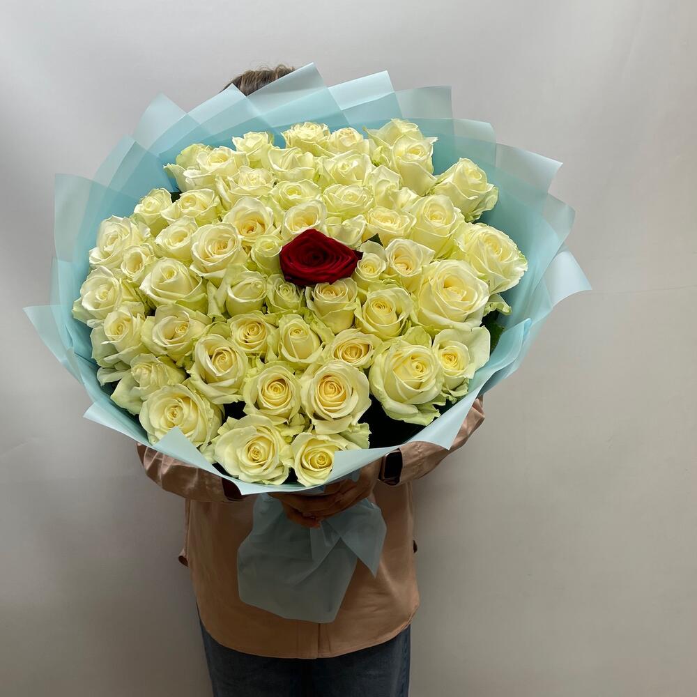 Роза красная - 1 шт. Лента атласная - 1 шт. Роза белая - 50 шт. Упаковка дизайнерская - 1 шт.