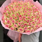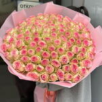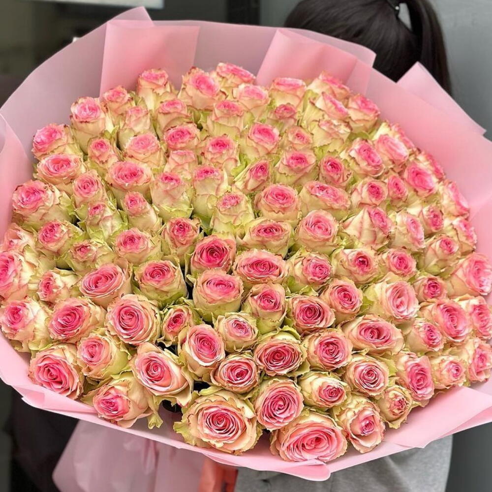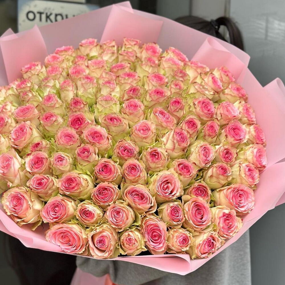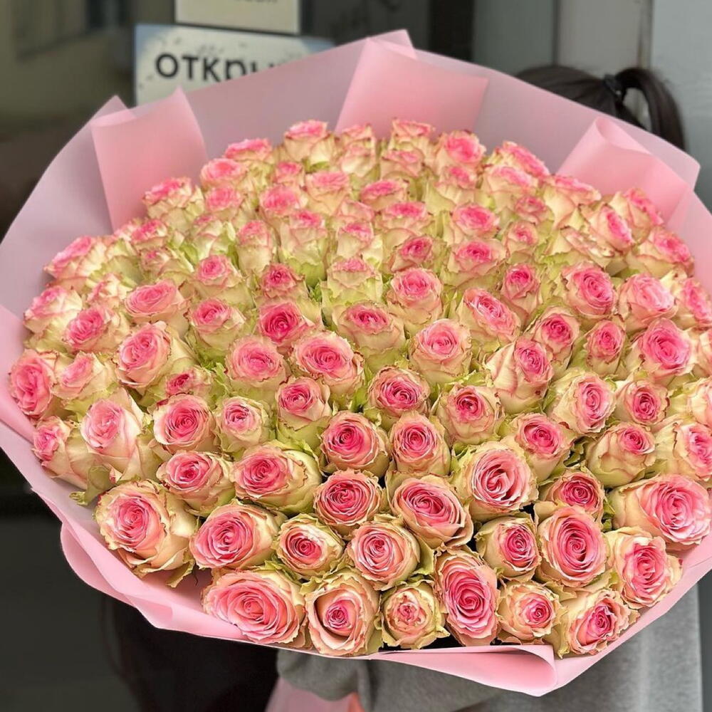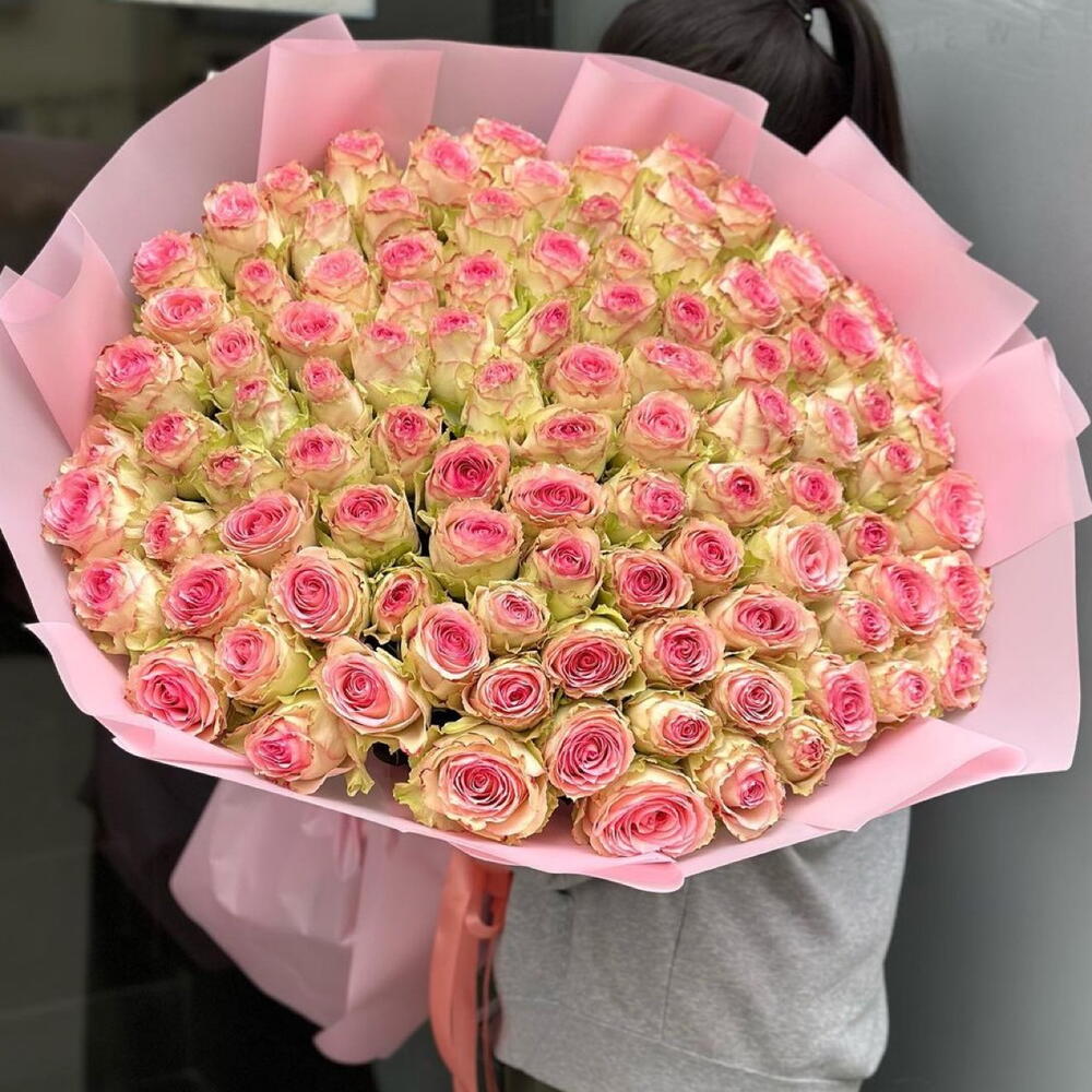 Роза - 101 шт. Лента атласная - 1 шт. Открыточка с вашими пожеланиями - 1 шт. Дизайнерское оформление - 1 шт. утеплитель - 1 шт.