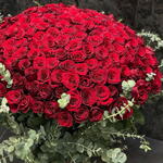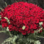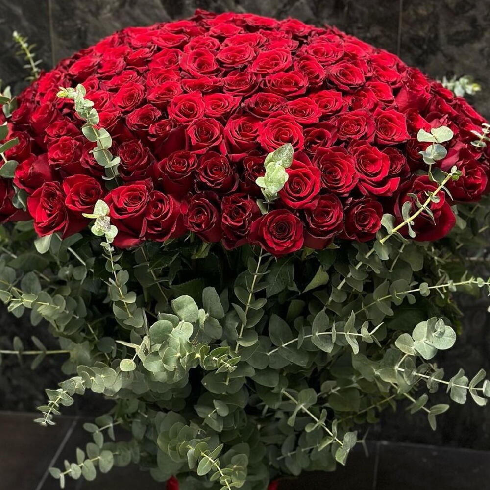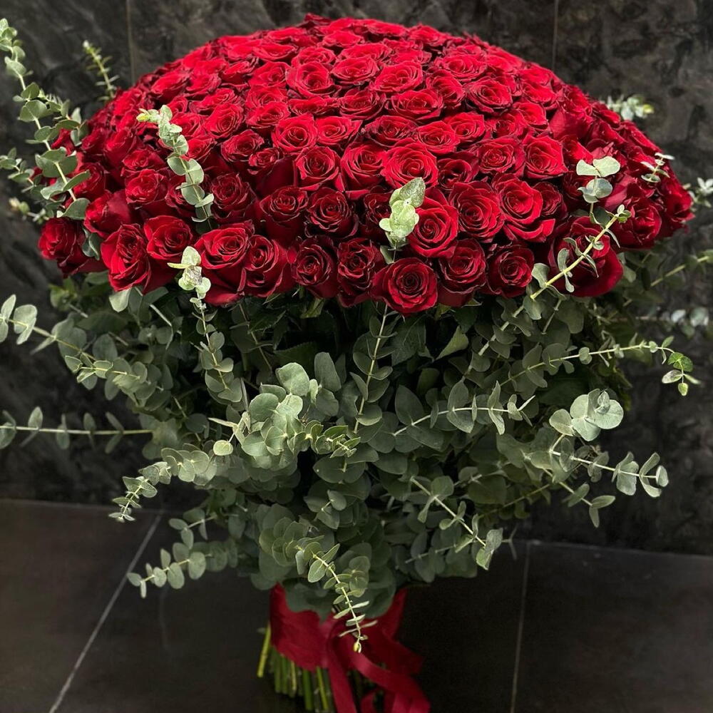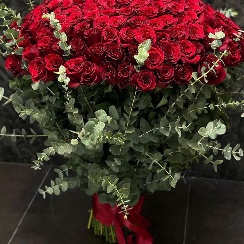 Роза красная 201 шт с эвкалиптом