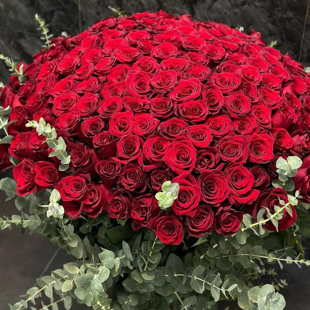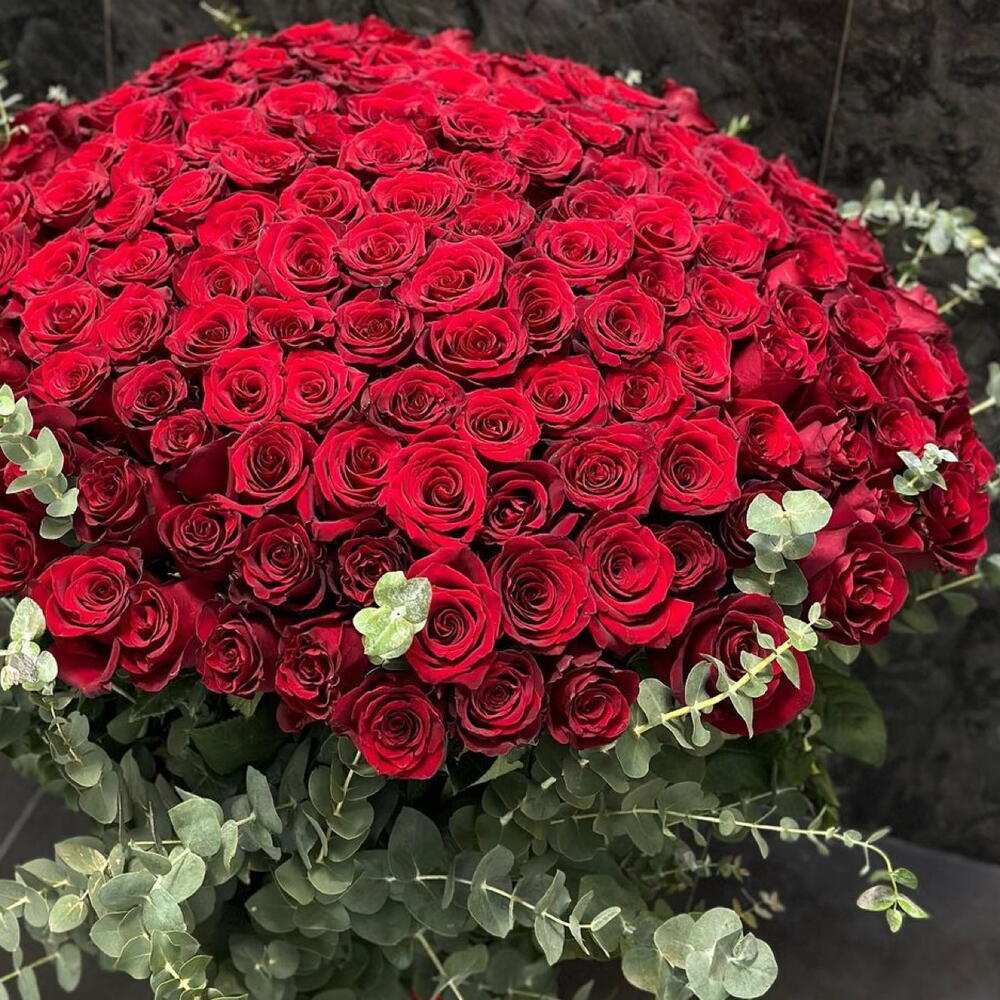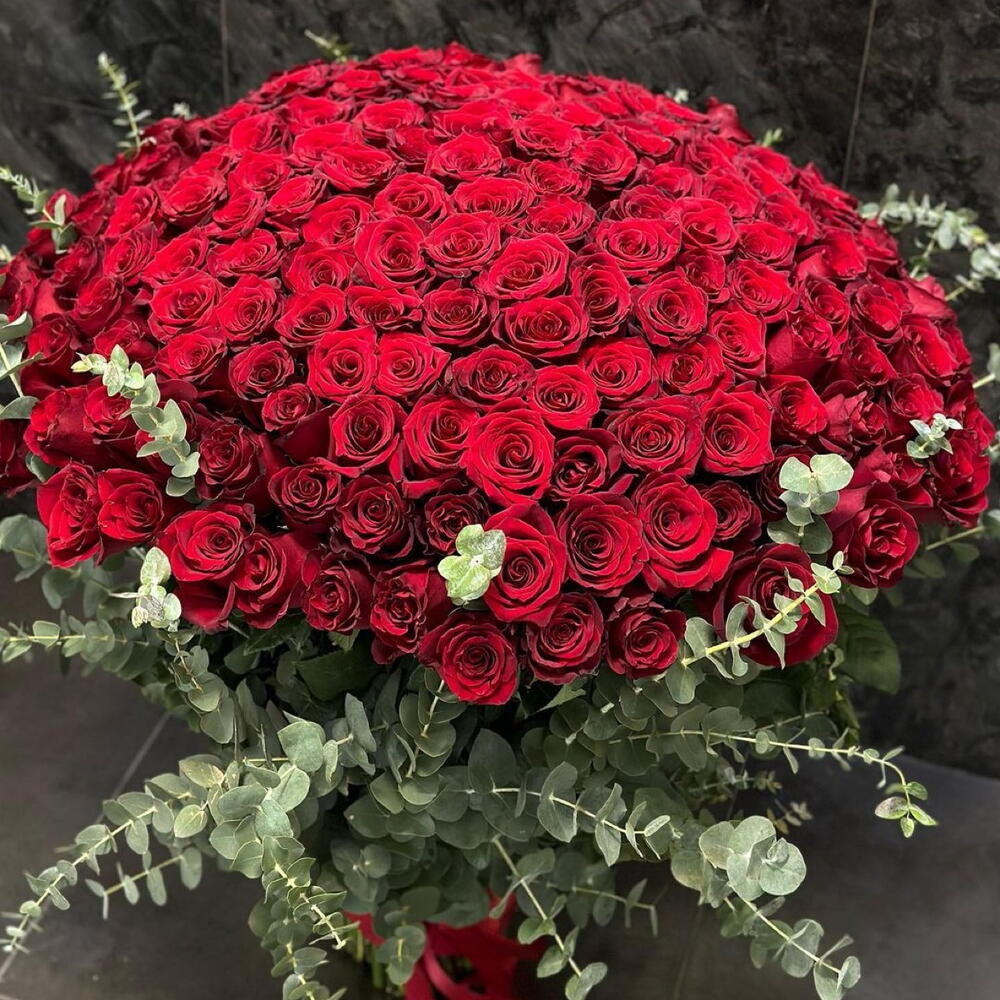 Лента атласная - 1 шт. Роза 70 см - 201 шт. Эвкалипт пучок - 3 шт. Открыточка с вашими пожеланиями - 1 шт. Дизайнерское оформление - 1 шт. утеплитель - 1 шт.