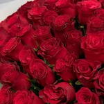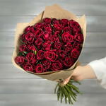 Это пышный классический букет из 25 кенийских роз глубокого бордово‑красного оттенка. Все бутоны примерно одного размера, собраны в аккуратный купол — головы роз плотно расположены, создавая ровную, полную форму. Плотные бархатистые лепестки создают эффект насыщенной, благородной текстуры, а изящные зелёные листочки между цветками добавляют живой контраст. Stems длинные и ровные, букет оформлен в простой крафтовый бумажный конверт, что подчёркивает естественность и элегантность композиции. Такой букет смотрится романтично и торжественно — идеален для юбилея, признания в любви или особого поздравления. Советы по уходу: срезать концы стеблей под углом, поставить в чистую тёплую воду, менять её каждые 1–2 дня и держать подальше от прямого солнца и сквозняков.