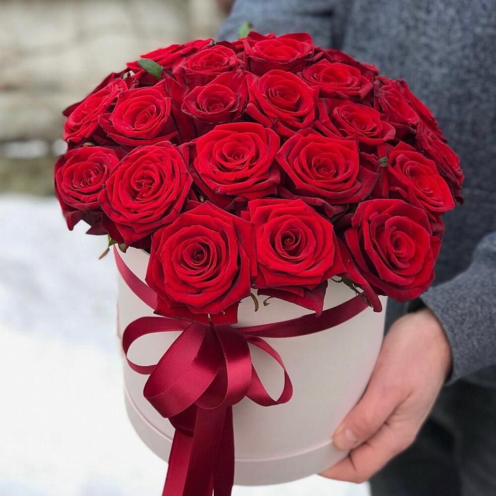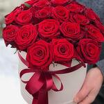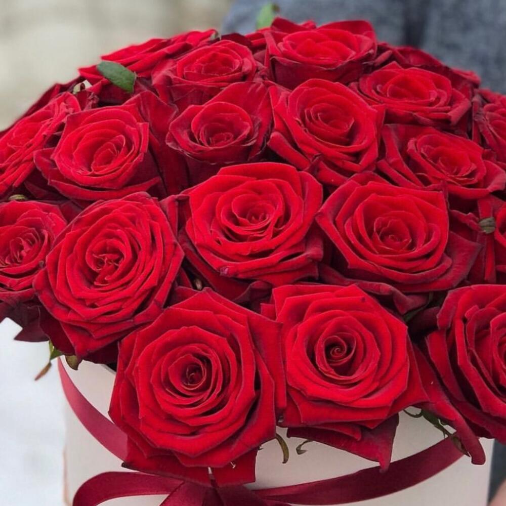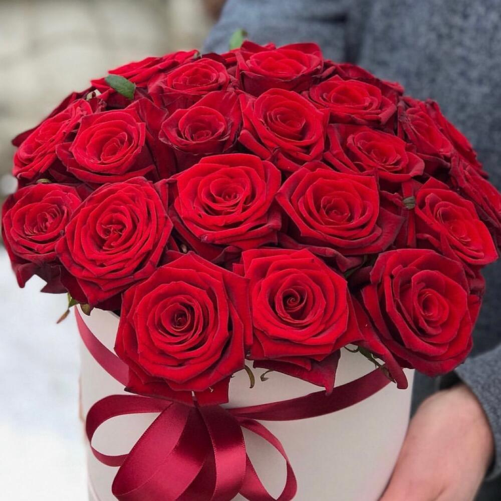 Роза красная - 29 шт. Лента атласная - 1 шт. Коробка шляпная - 1 шт. Оазис флористический - 2 шт.