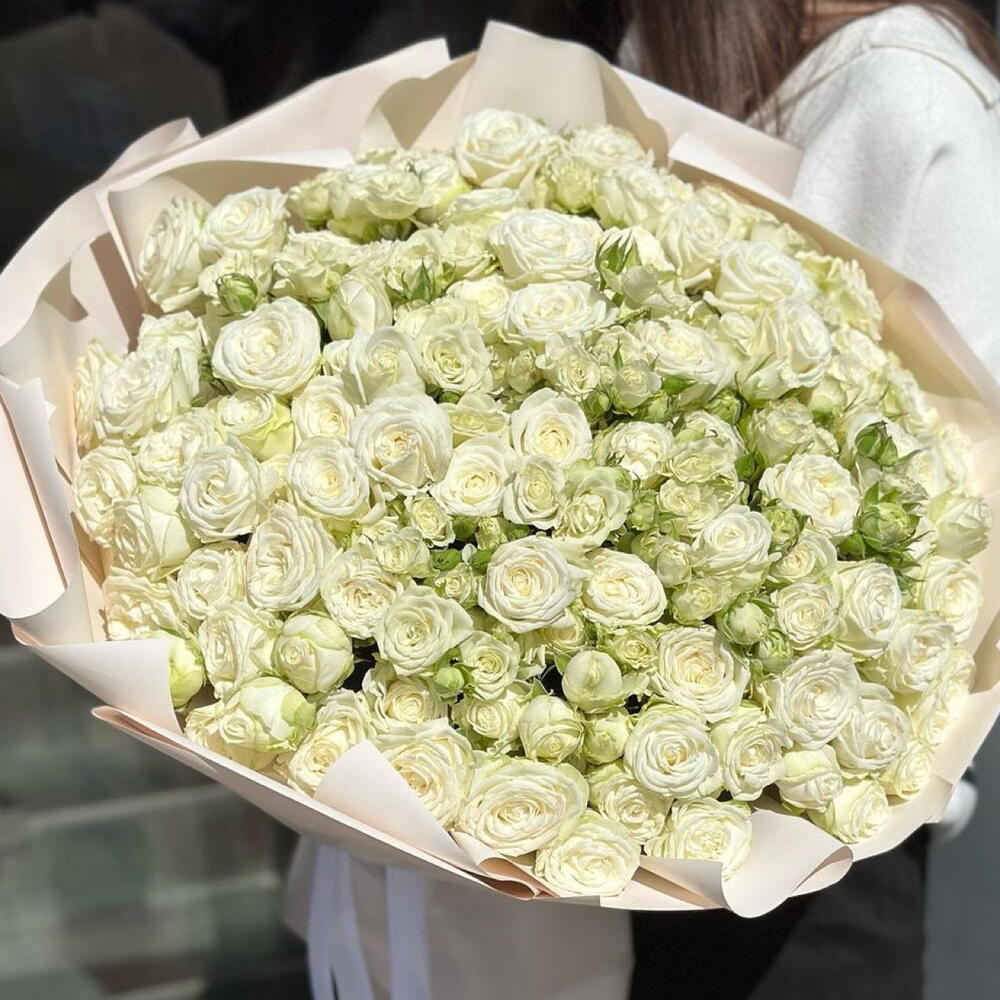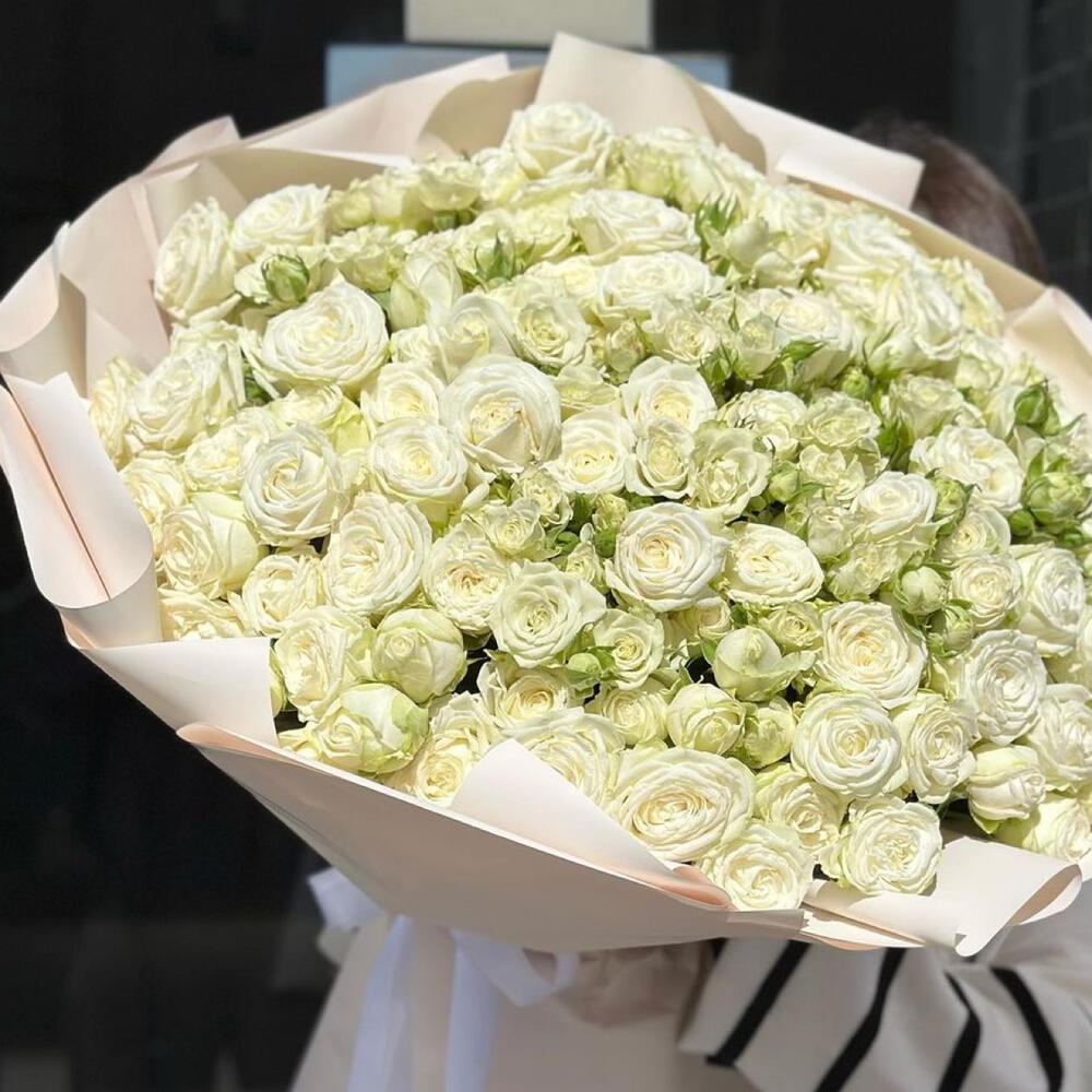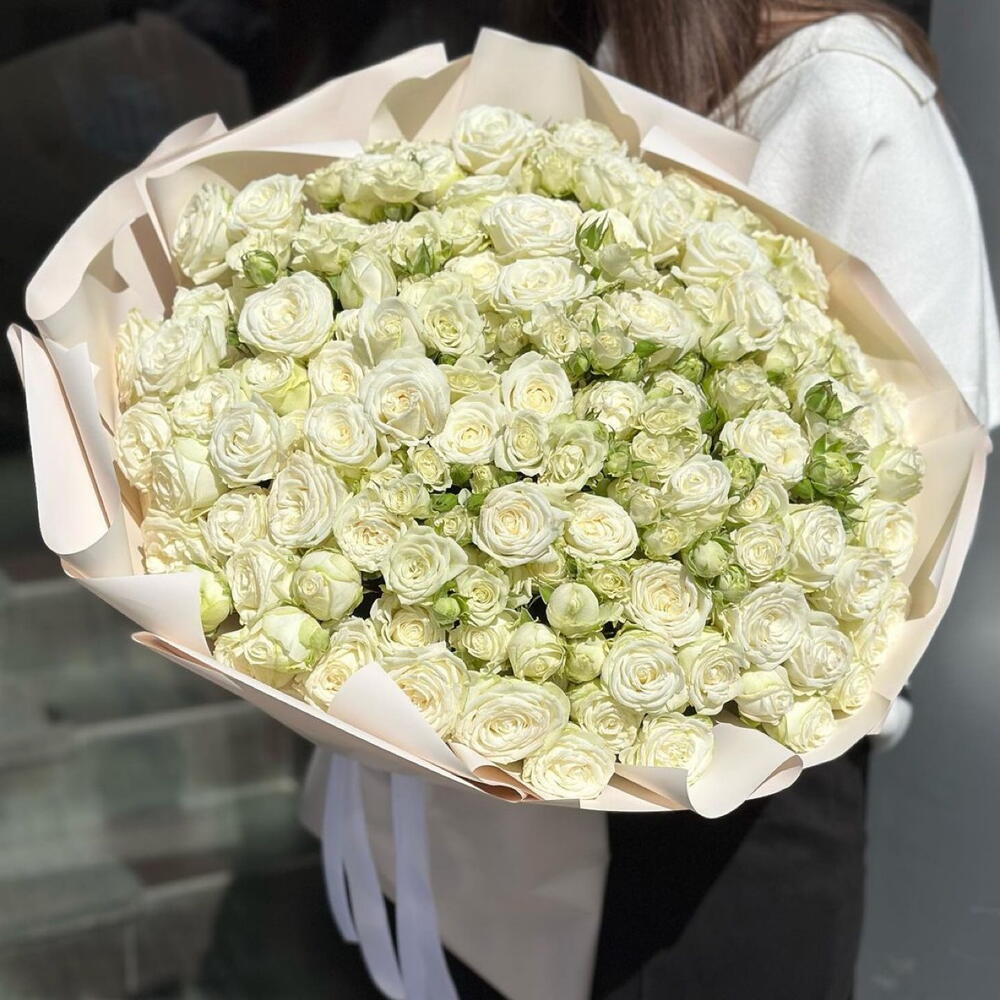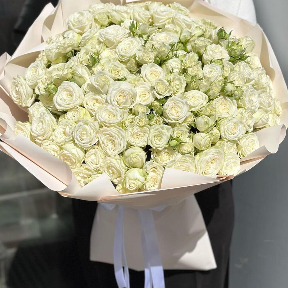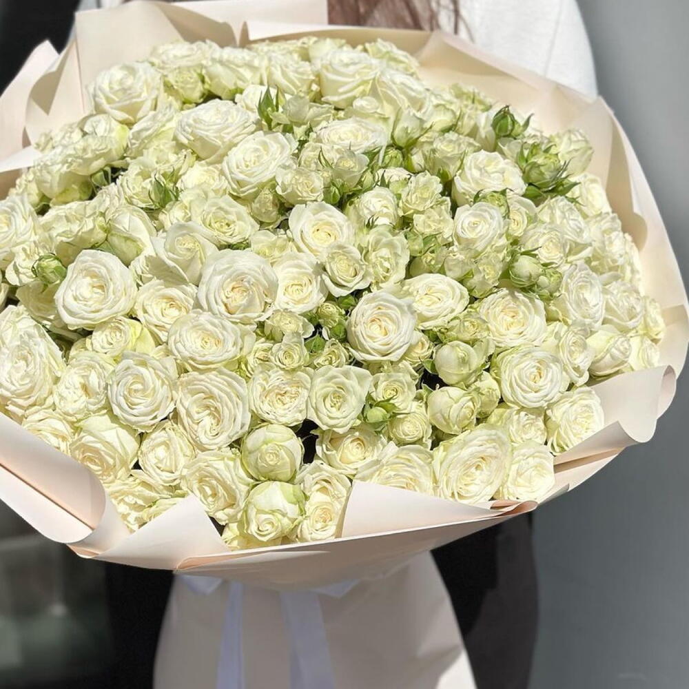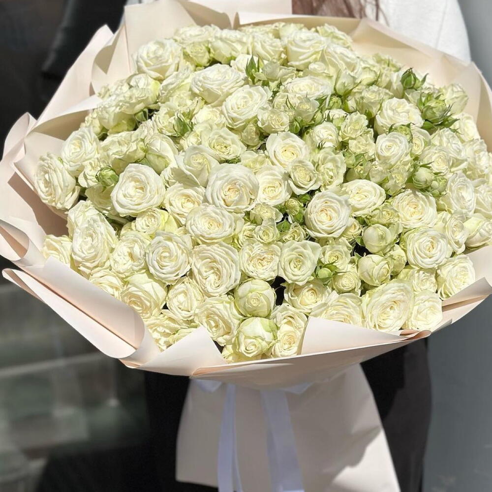 Лента атласная - 1 шт. Роза кустовая белая - 39 шт. Открыточка с вашими пожеланиями - 1 шт. Дизайнерское оформление - 1 шт.