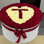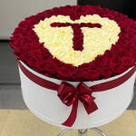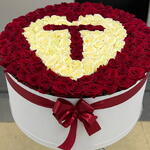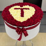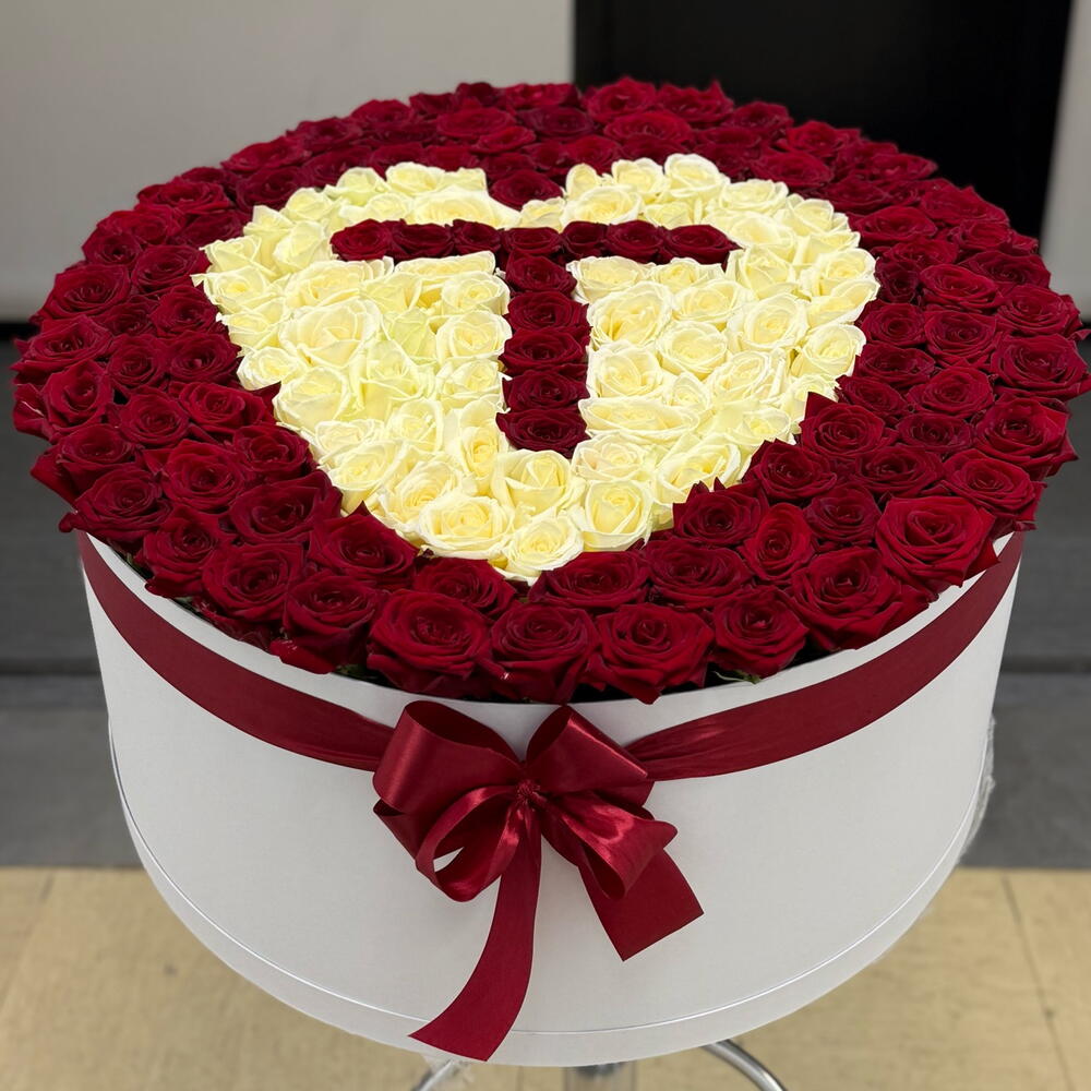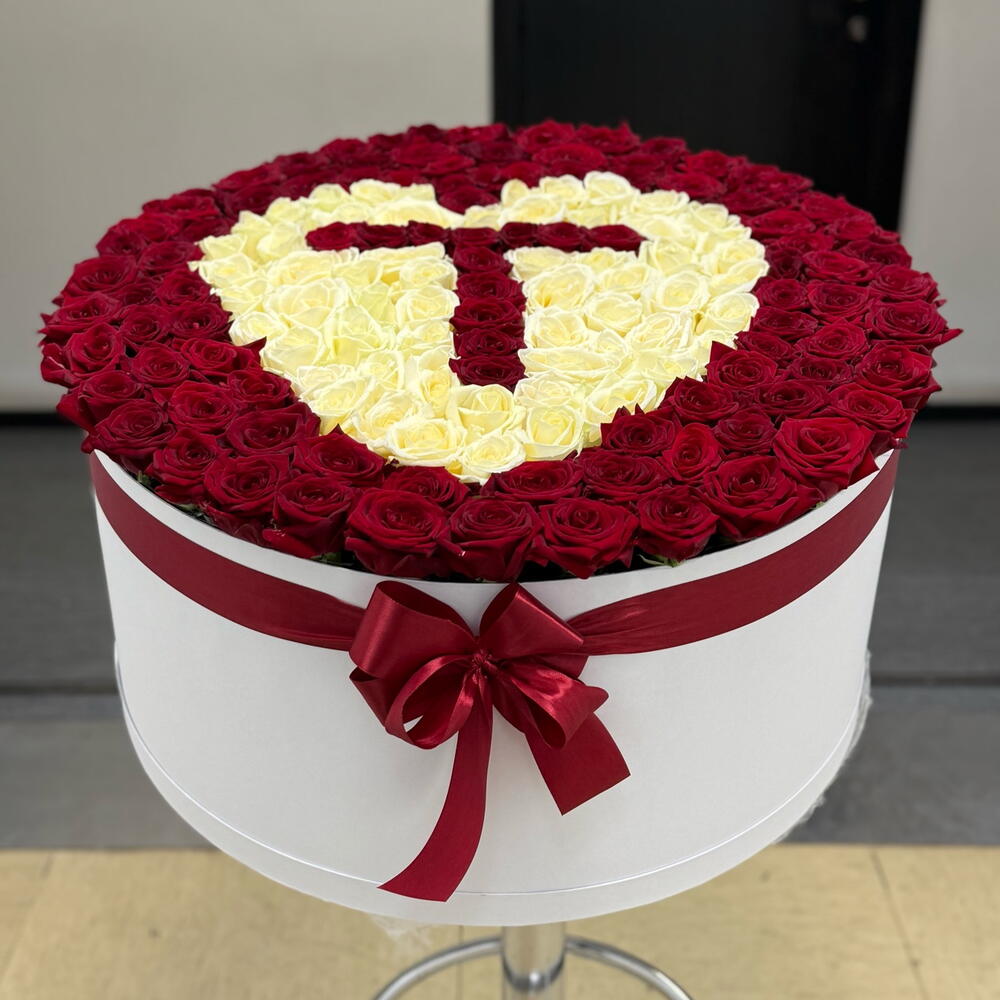 Лента атласная - 1 шт. Коробка шляпная - 1 шт. Оазис флористический - 1 шт. Дизайнерское оформление - 1 шт. роза микс - 101 шт. букетная записка - 1 шт.