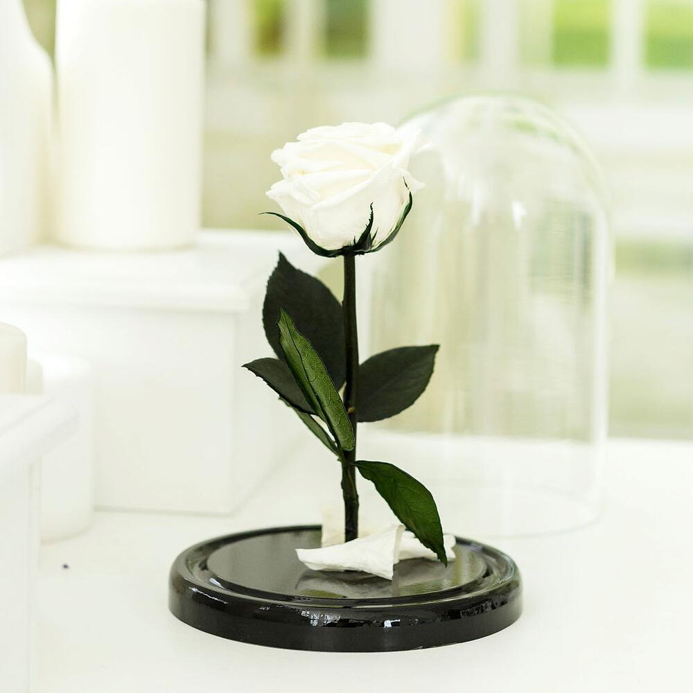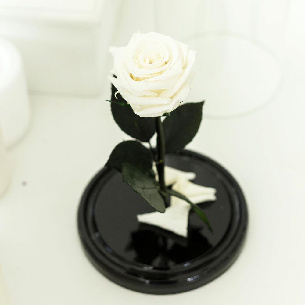 Стабилизированная роза - 1 шт. Деревянная подставка - 1 шт. Стеклянная колба - 1 шт.