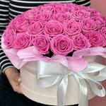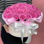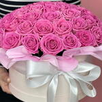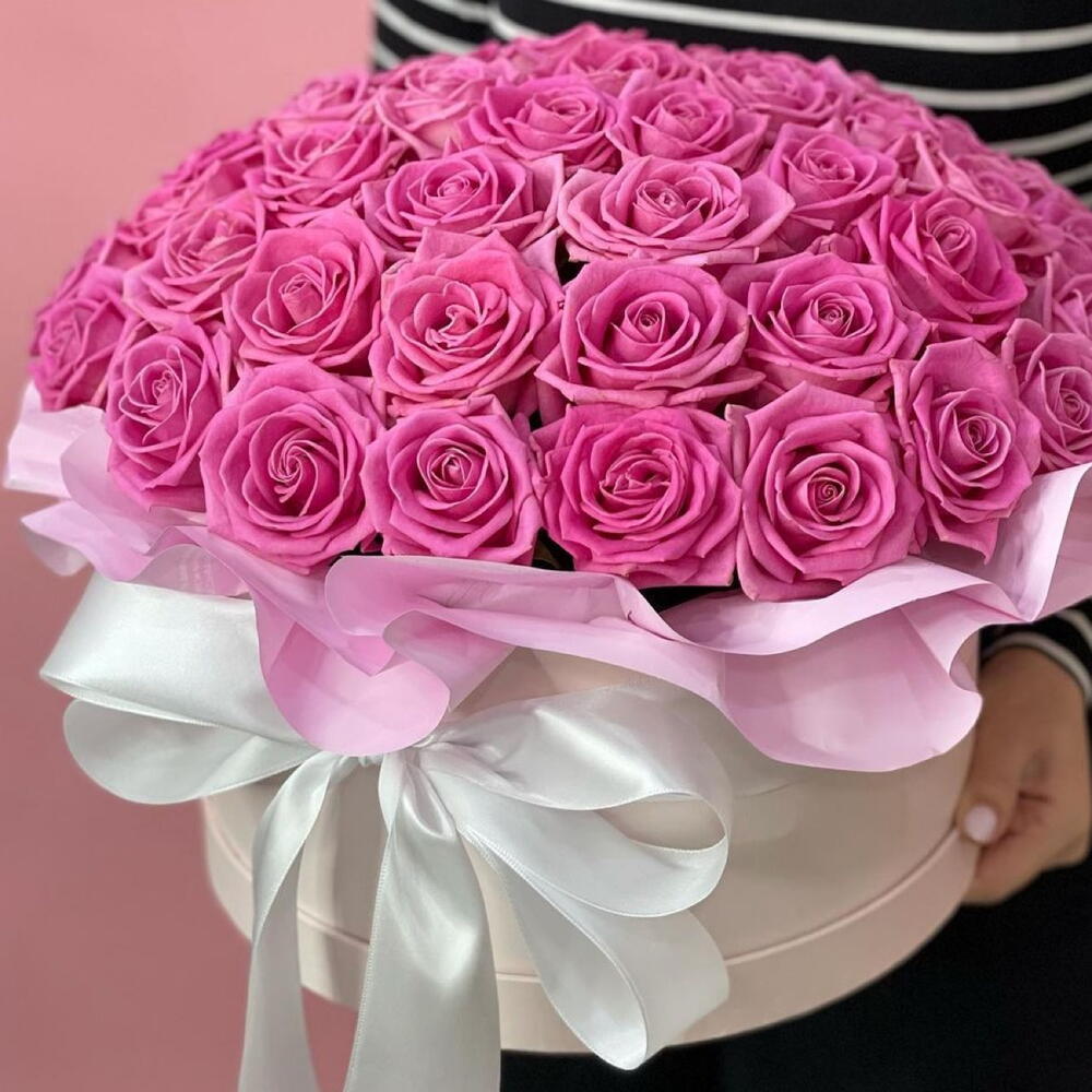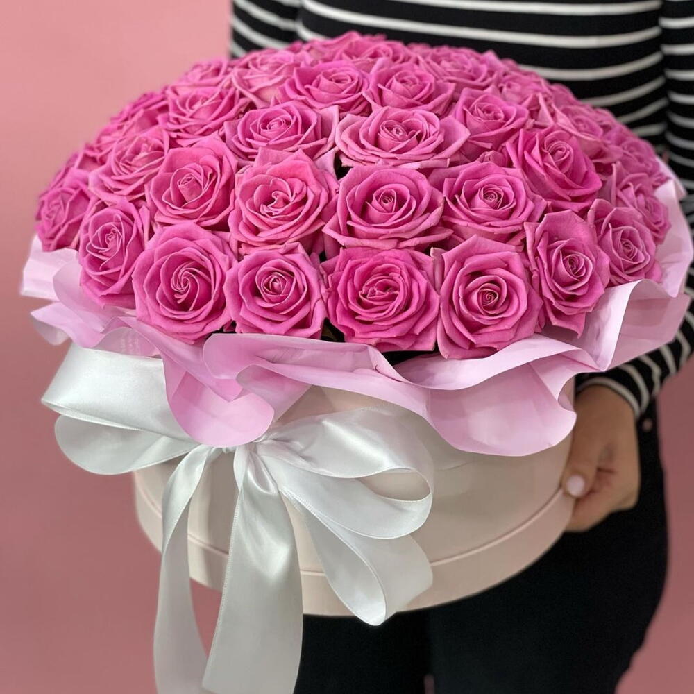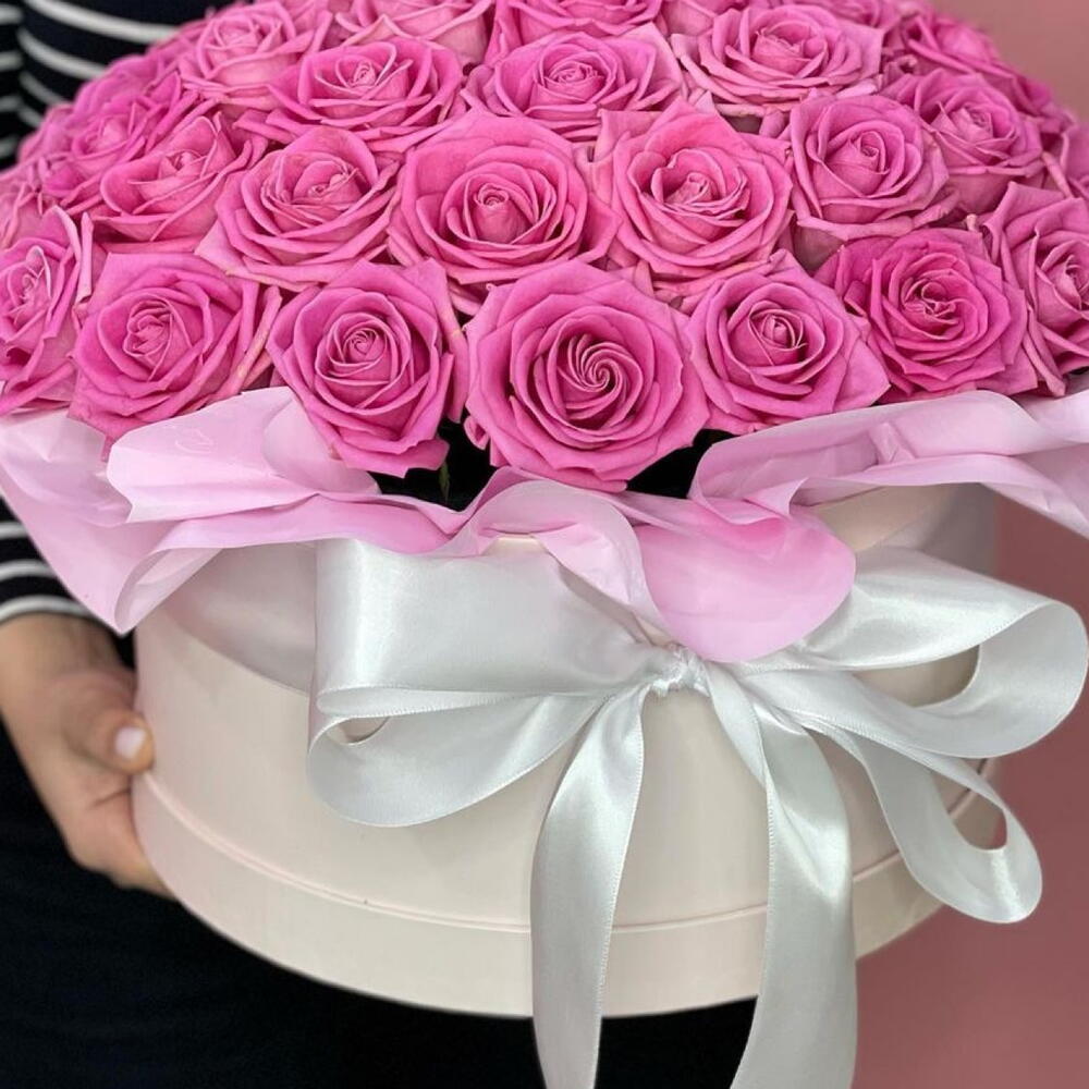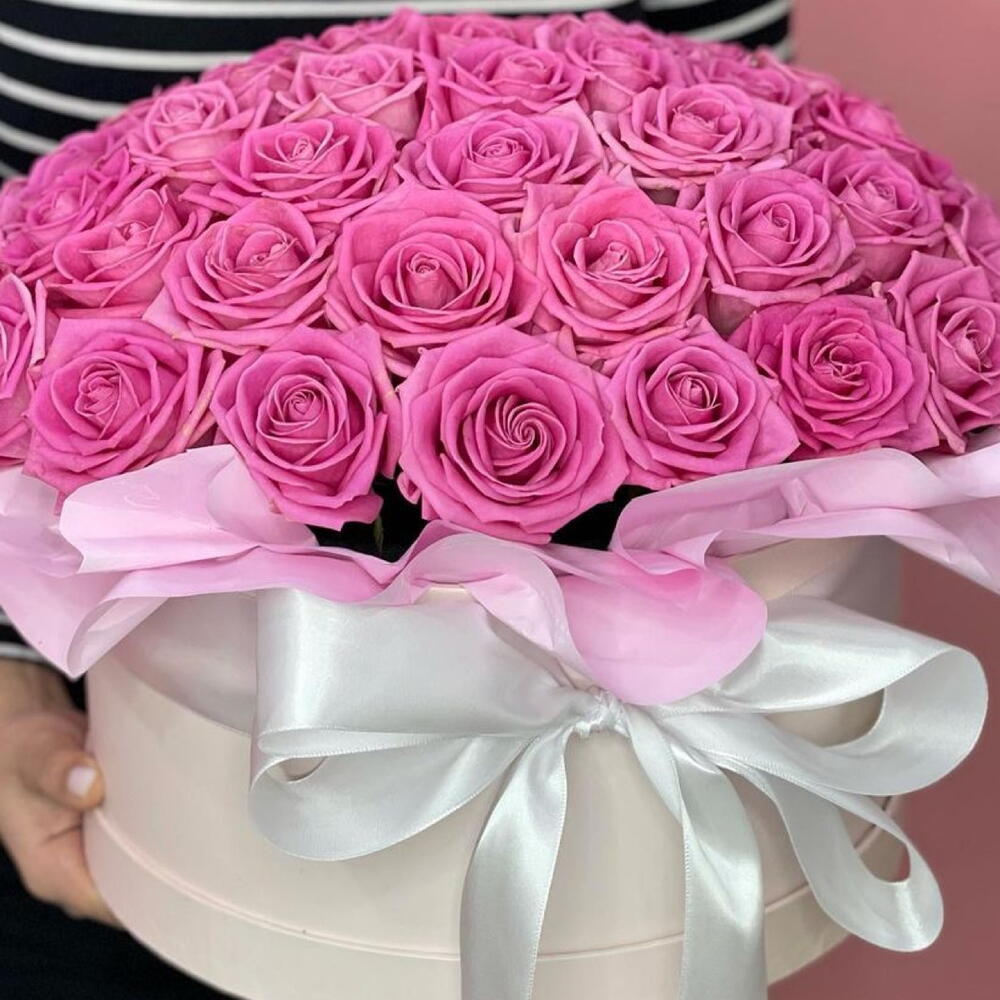 Роза аква - 61 шт. Лента атласная - 1 шт. Коробка шляпная - 1 шт. Оазис флористический - 1 шт. Дизайнерское оформление - 1 шт. открытка с вашими пожеланиями - 1 шт. утеплитель для букета - 1 шт.