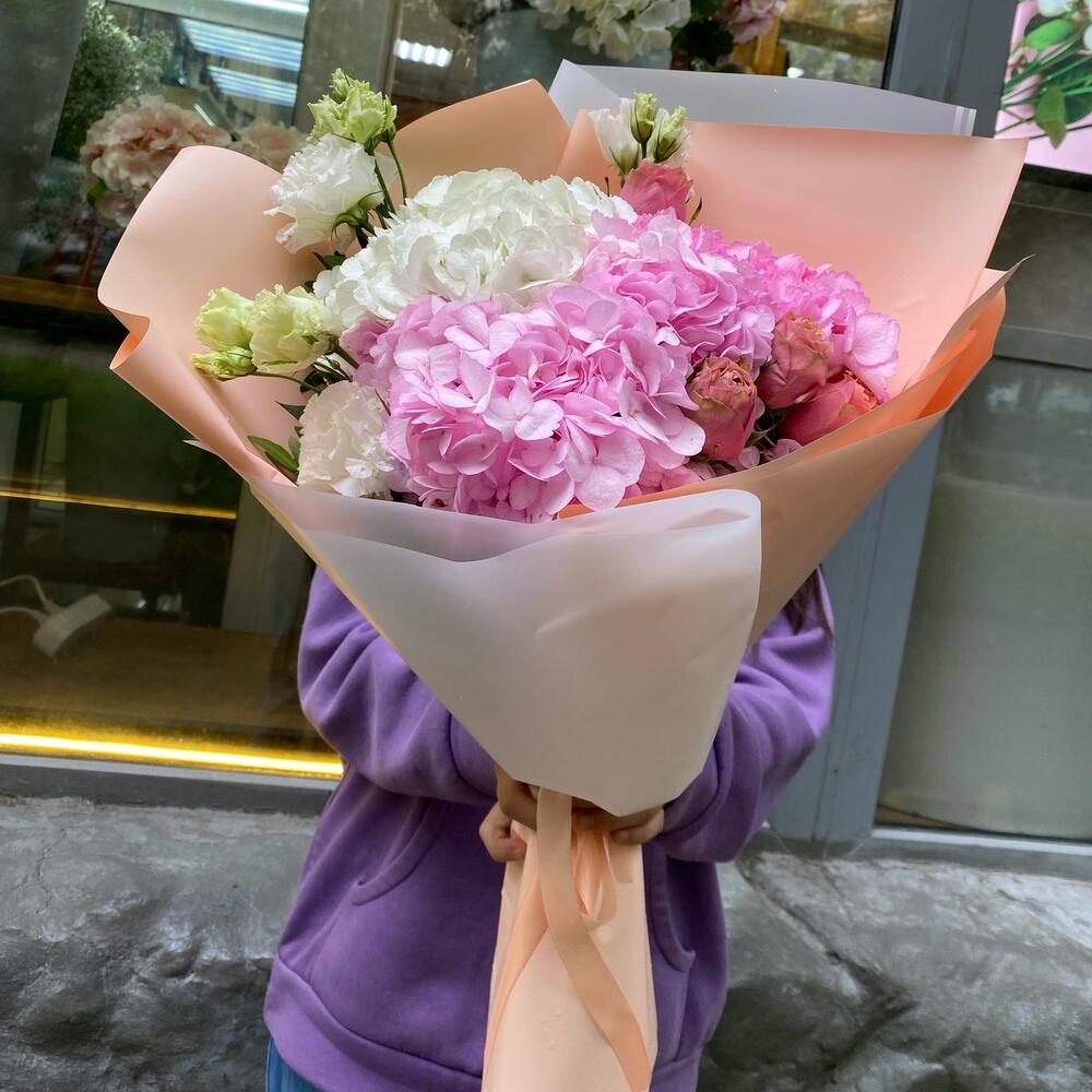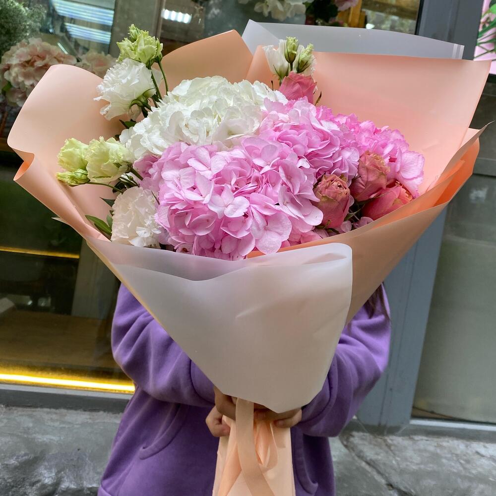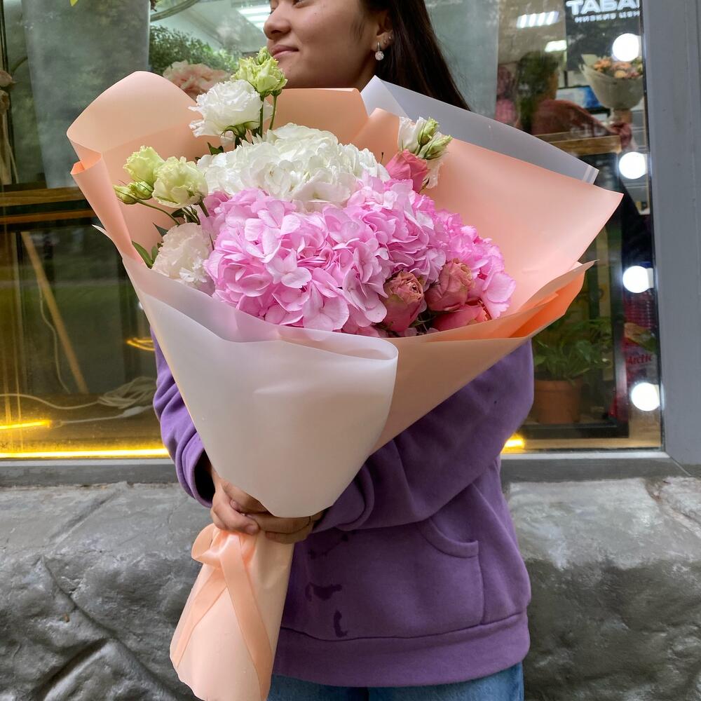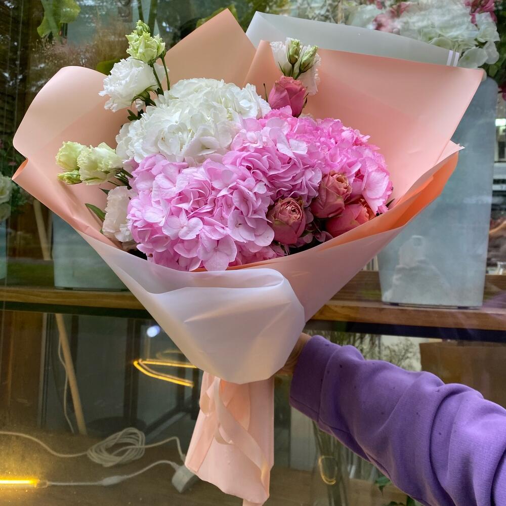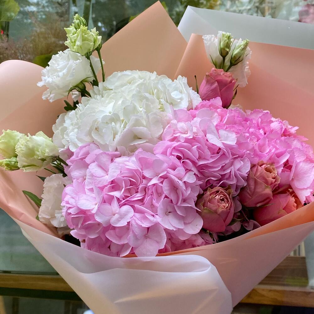 Роза - 4 шт. Гортензия белая - 1 шт. Упаковка дизайнерская - 1 шт. Гортензия розовая - 2 шт. эустома белая - 2 шт.