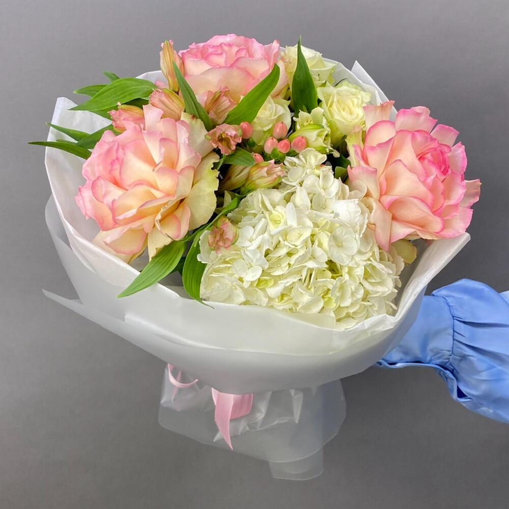 Гиперикум - 1 шт. Гортензия - 1 шт. Роза белая - 1 шт. Упаковка дизайнерская - 1 шт. Французская роза - 3 шт. альстромерия микс - 3 шт.