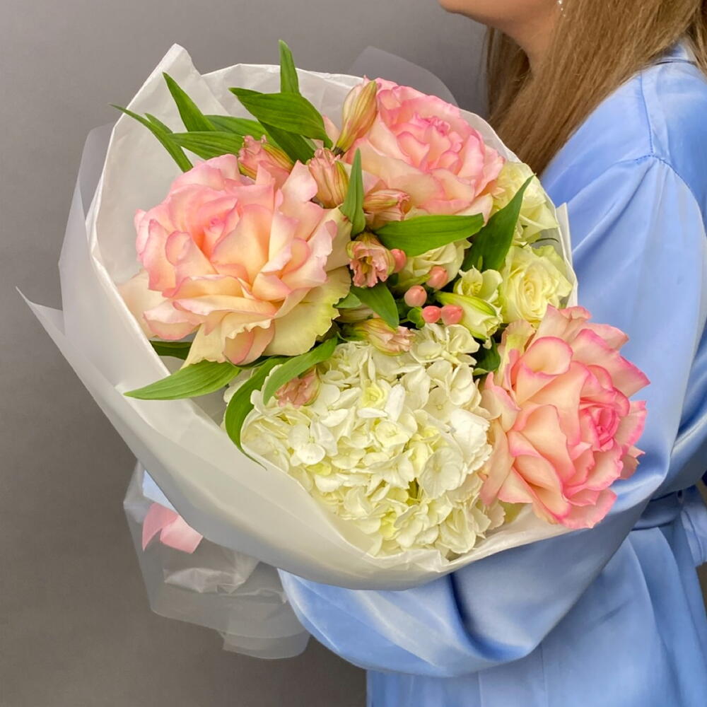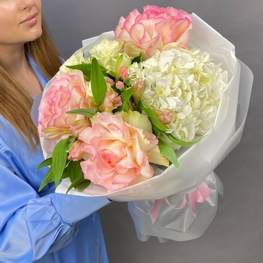 Воздушный букет в бело-розовых оттенках — это настоящее произведение искусства, составленное из самых изысканных цветов. Начнем с гортензий, которые будут играть роль объемного холста для этой картины природы. Их мягкие лепестки создадут основу для всей композиции, словно облака на небесах, придавая букету нежность и легкость. А теперь обратим внимание на французские розы Эсперанс. Их нежно-розовые лепестки напоминают о заходе солнца на розовом небе, и это придает букету изысканности и романтичности. Каждая роза словно маленький шедевр природы, который дарит нам свою красоту. Белые розы в этом букете — это как свежий ветерок после летнего дождя. Они придают композиции свет и чистоту, словно лучи утреннего солнца, пробивающиеся сквозь облака. Их изящные лепестки создают контраст и подчеркивают красоту других цветов. И, наконец, альстромерии — королевы этого букета. Их гофрированные цветки добавляют игривости и шарма, словно маленькие бабочки, парящие в воздухе. Они украшают композицию и делают ее еще более привлекательной. Все эти цветы вместе создают волшебный букет, который словно рассказывает историю о нежности, красоте и радости жизни. Он подарит вам моменты счастья и умиротворения, наполняя ваш дом ароматами и красками природы. Этот букет станет ярким акцентом любого торжества или просто прекрасным подарком для вашего близкого человека