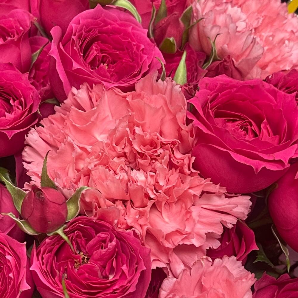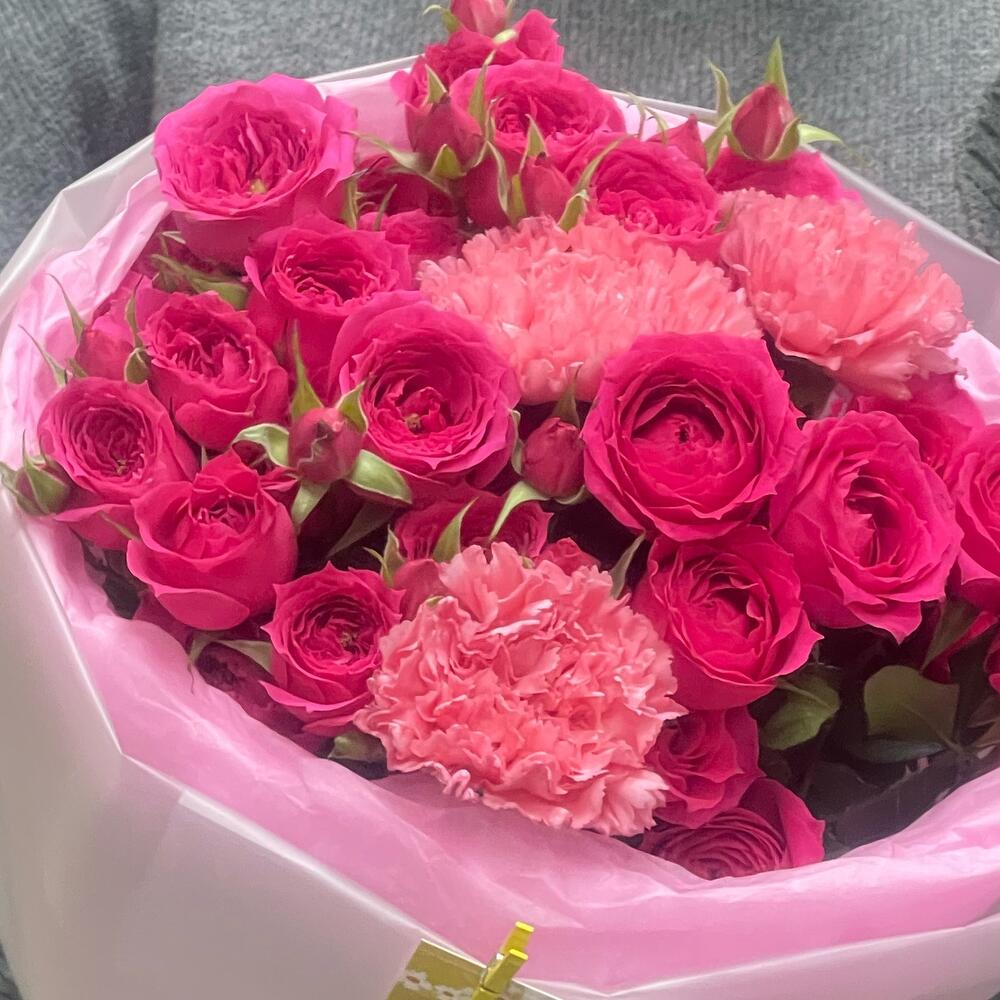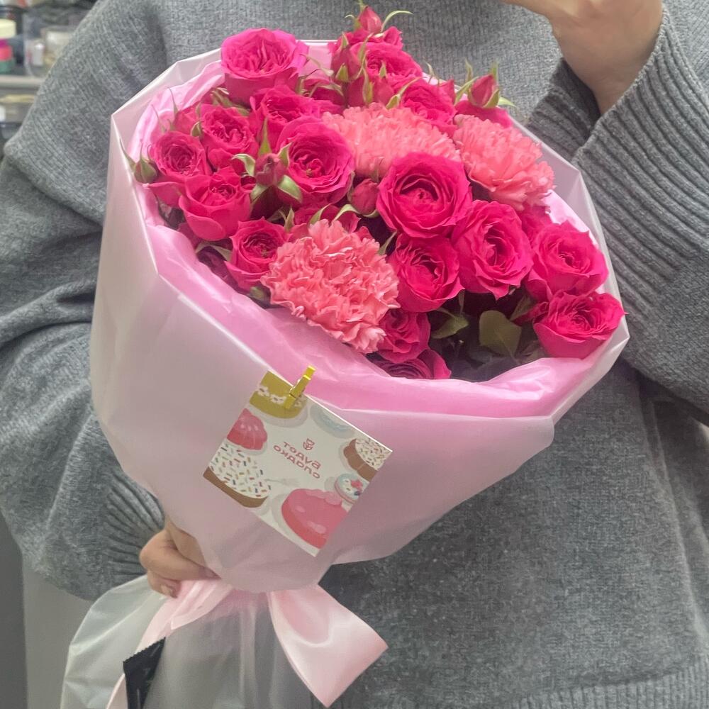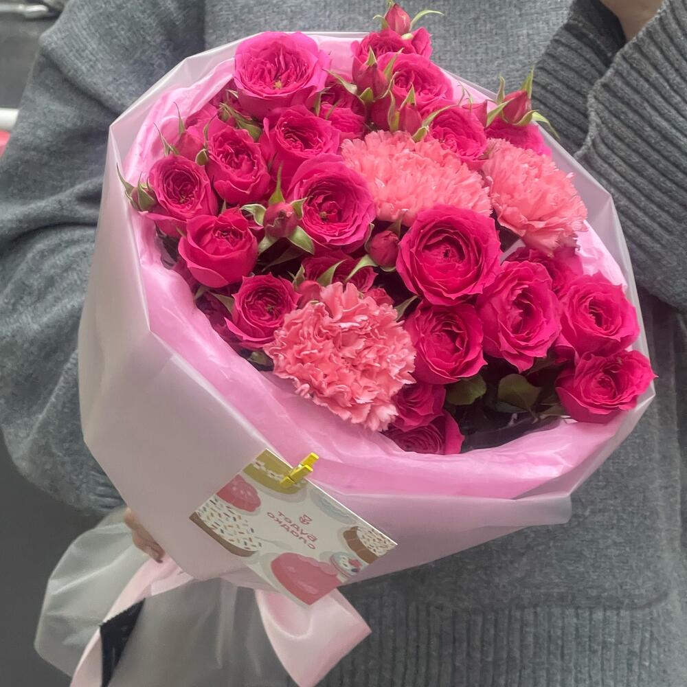 Кустовая роза - 5 шт. Лента атласная - 2 шт. Тишью - 2 шт. Диантус - 3 шт. Кризал (подкормка) - 1 шт. Пленка матовая - 2 шт.