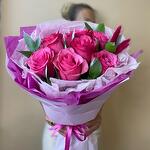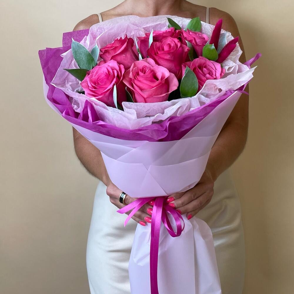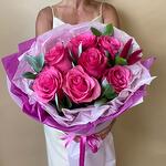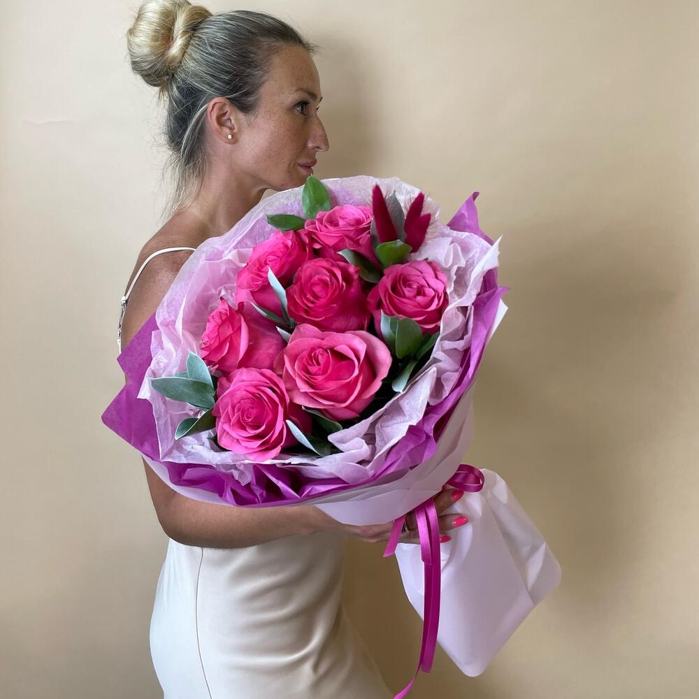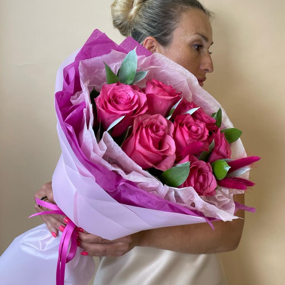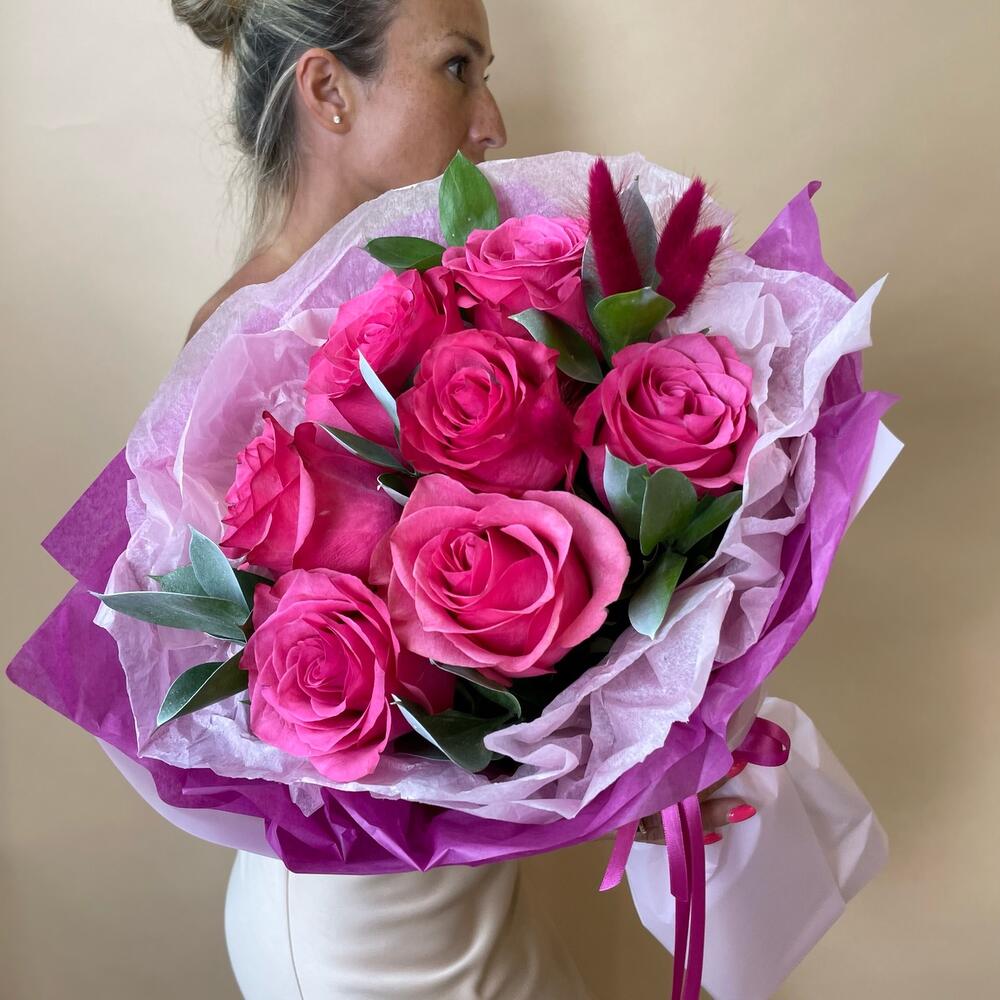 Рускус - 5 шт. Роза Эквадор - 7 шт. Лента атласная - 1 шт. Упаковка дизайнерская - 2 шт. Лагурус (сухоцвет) - 1 шт.