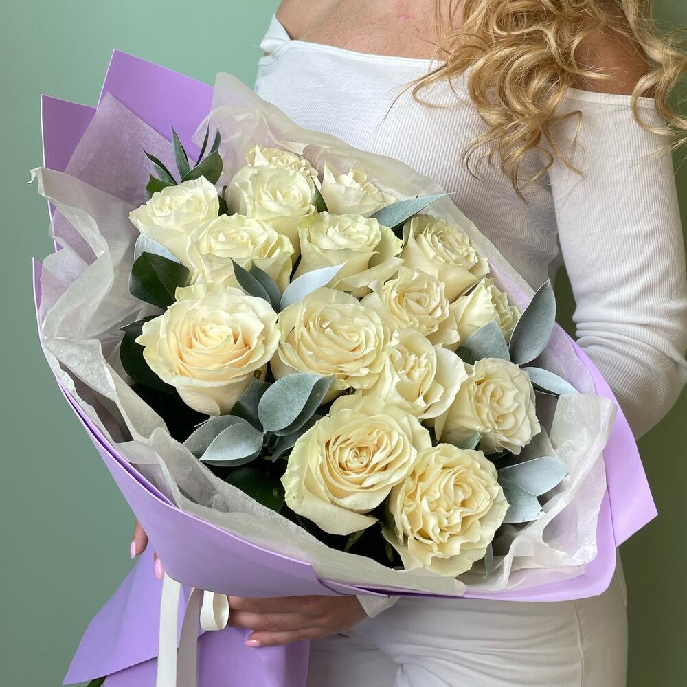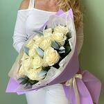 Роза - 15 шт. Лента атласная - 1 шт. Рускус Италия - 7 шт. Упаковка дизайнерская - 3 шт.