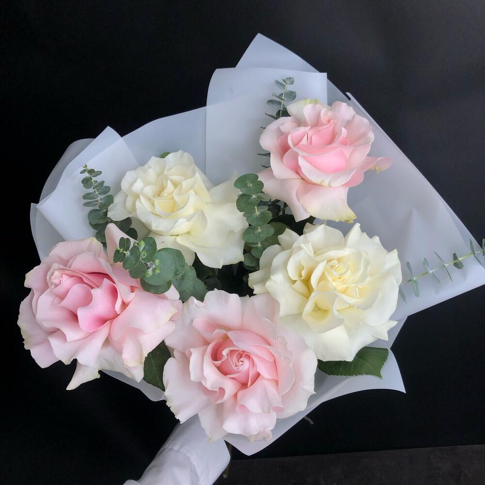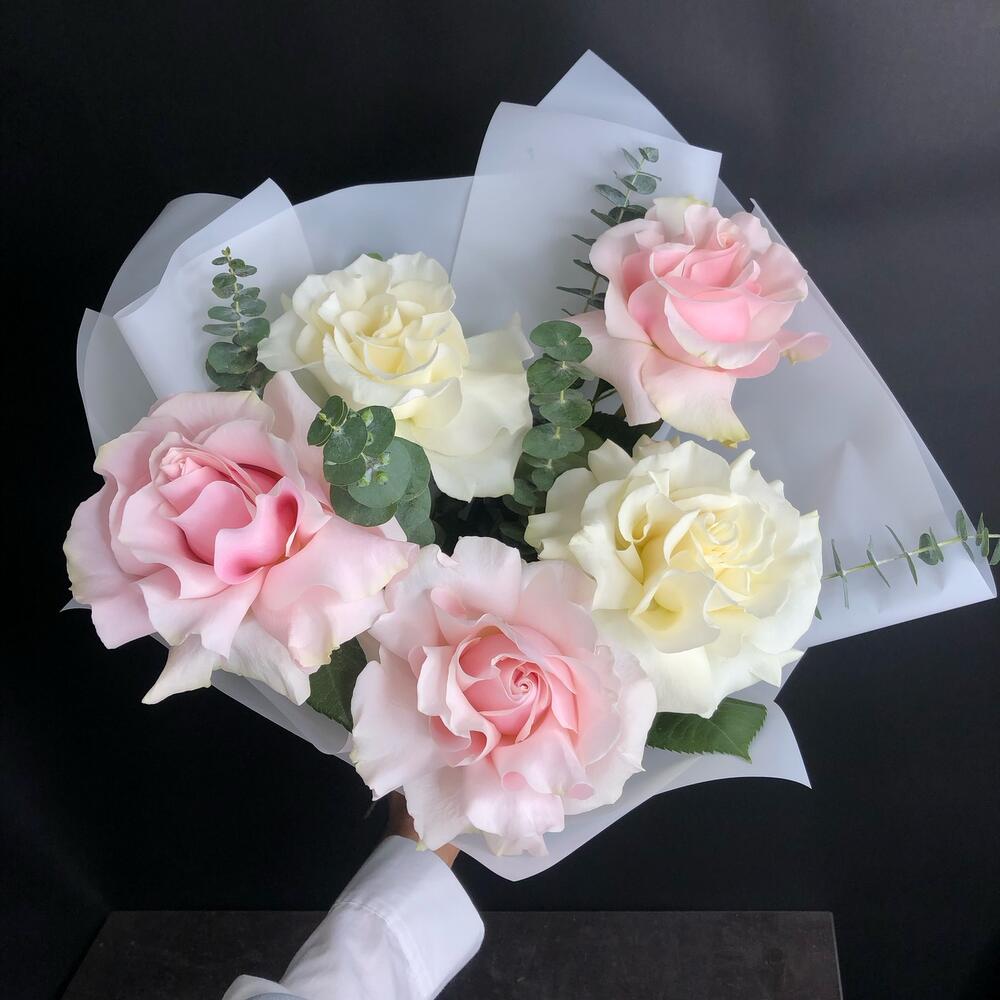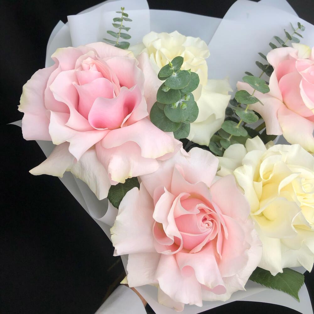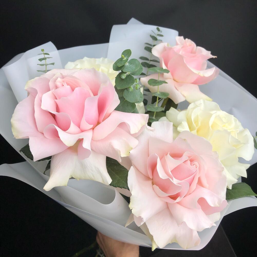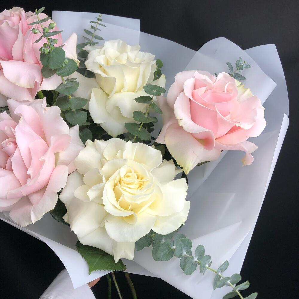 Эвкалипт - 5 шт. Лента атласная - 1 шт. Роза французская розовая - 3 шт. роза французская белая - 2 шт. упаковка белая матовая - 3 шт.
