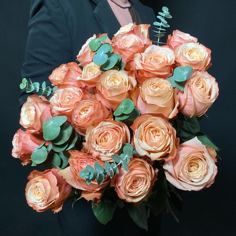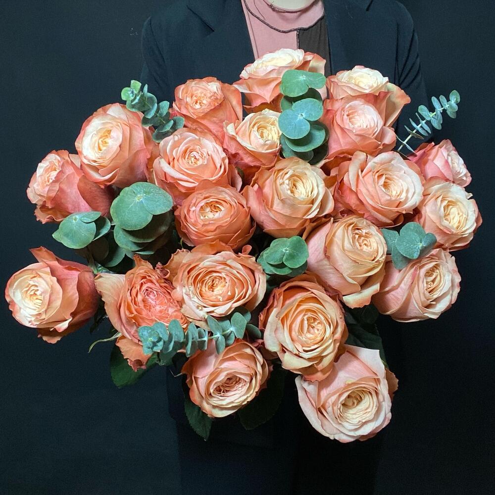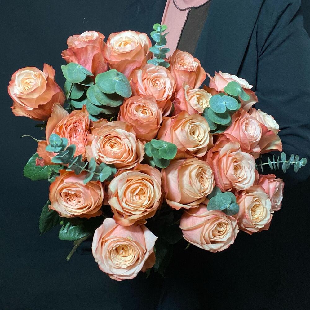 Эвкалипт - 6 шт. Лента атласная - 1 шт. Пионовидная роза - 21 шт.