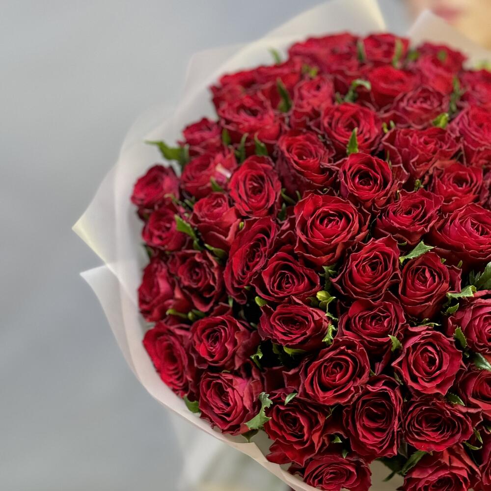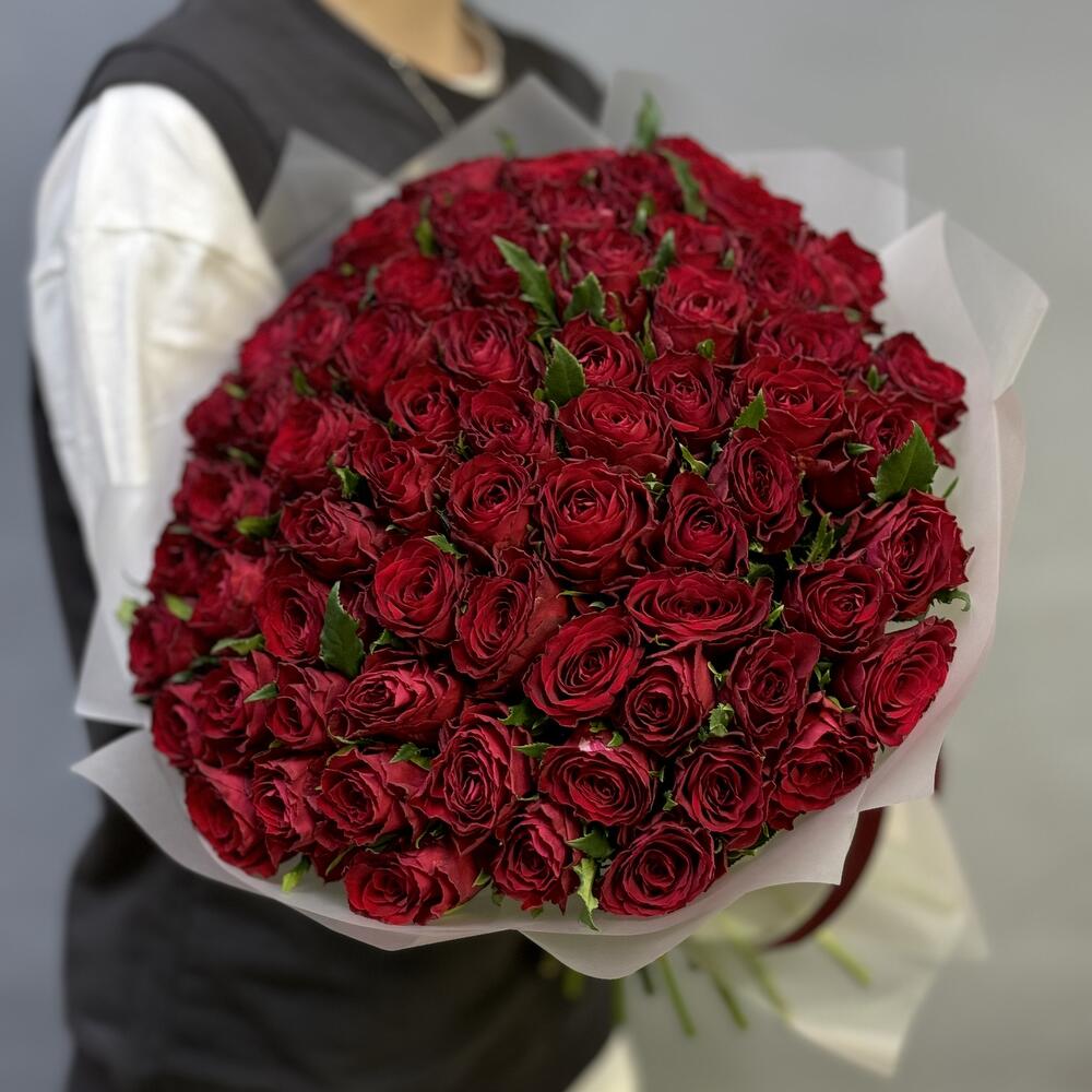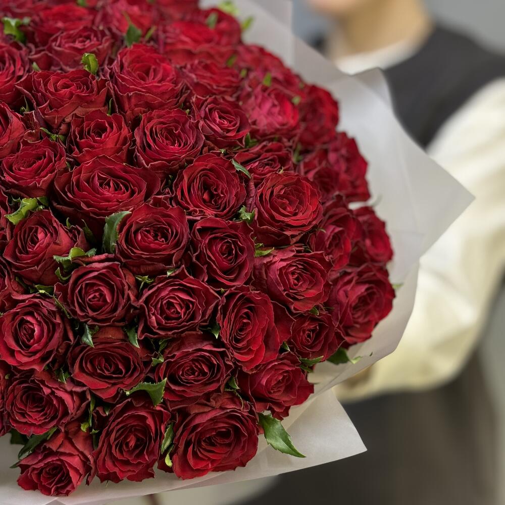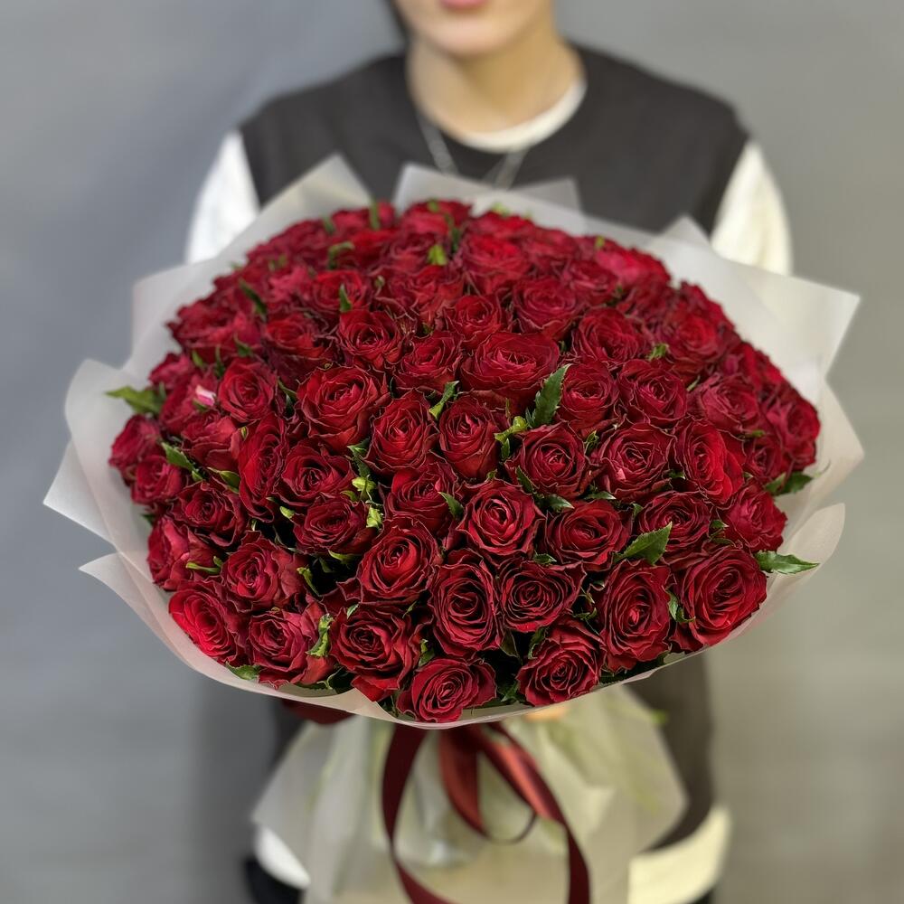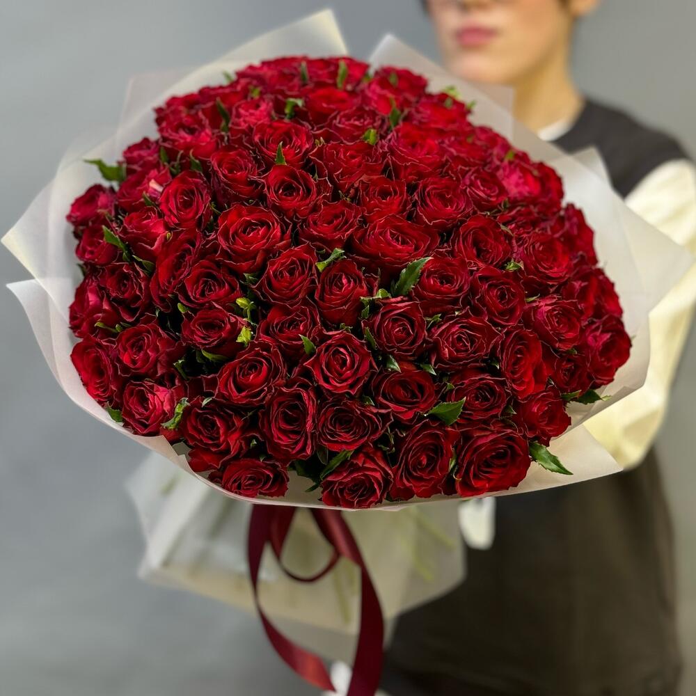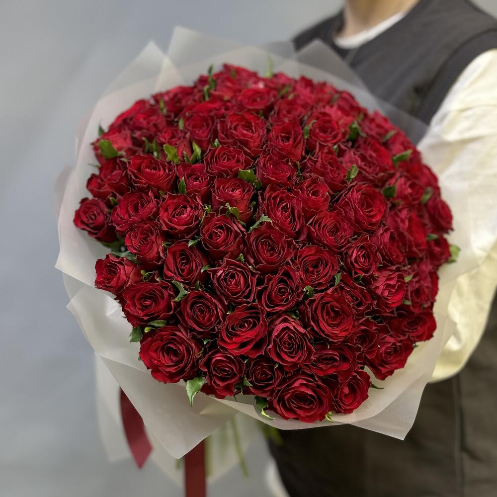 Роза Эквадор - 75 шт. Лента атласная - 1 шт. Пленка матовая - 1 шт.