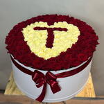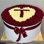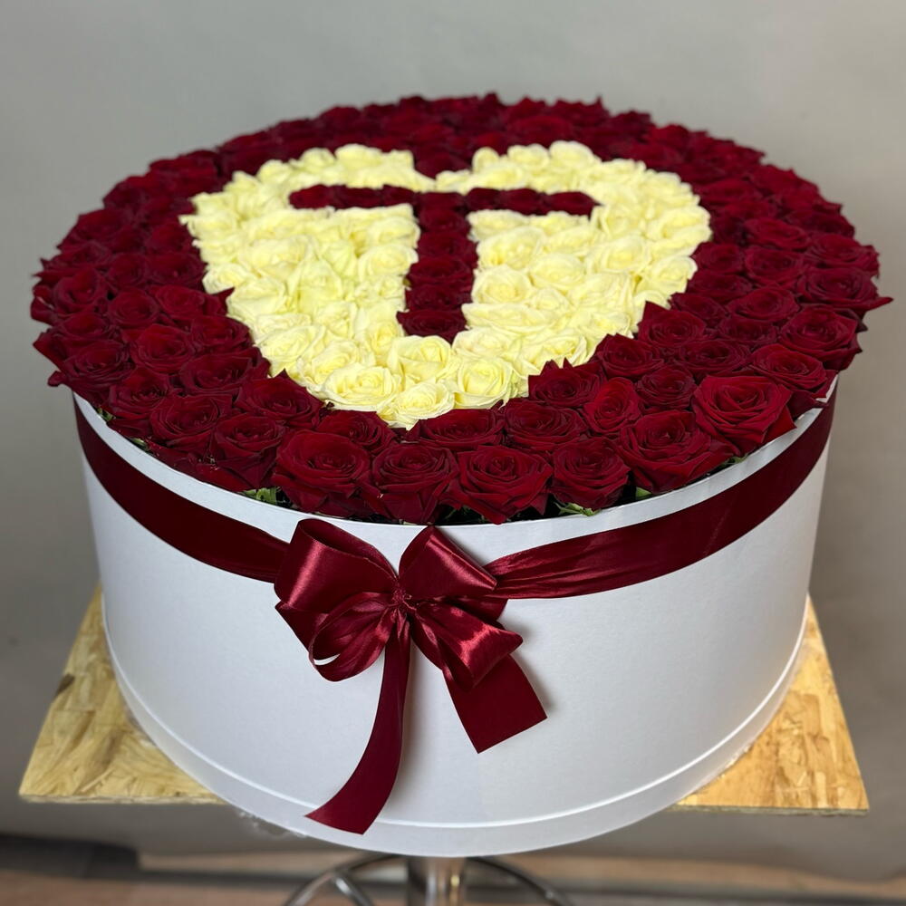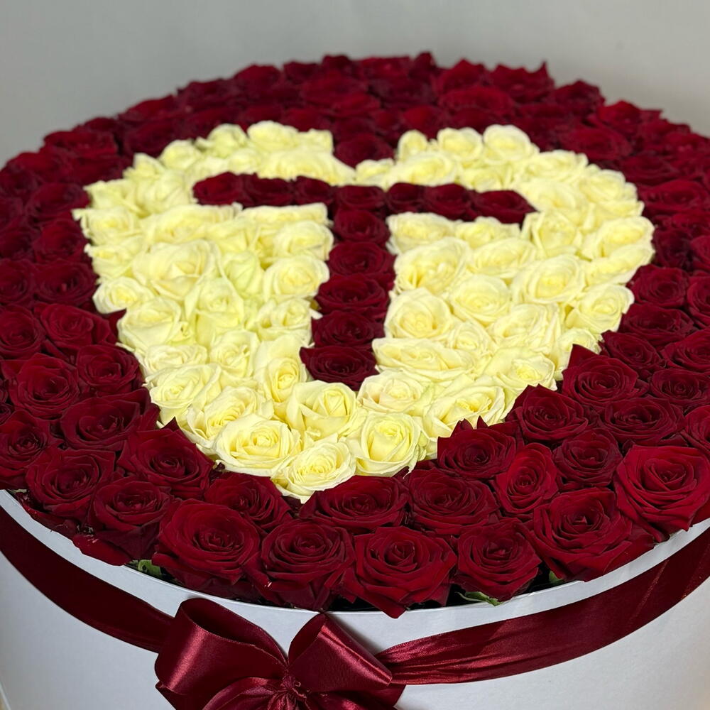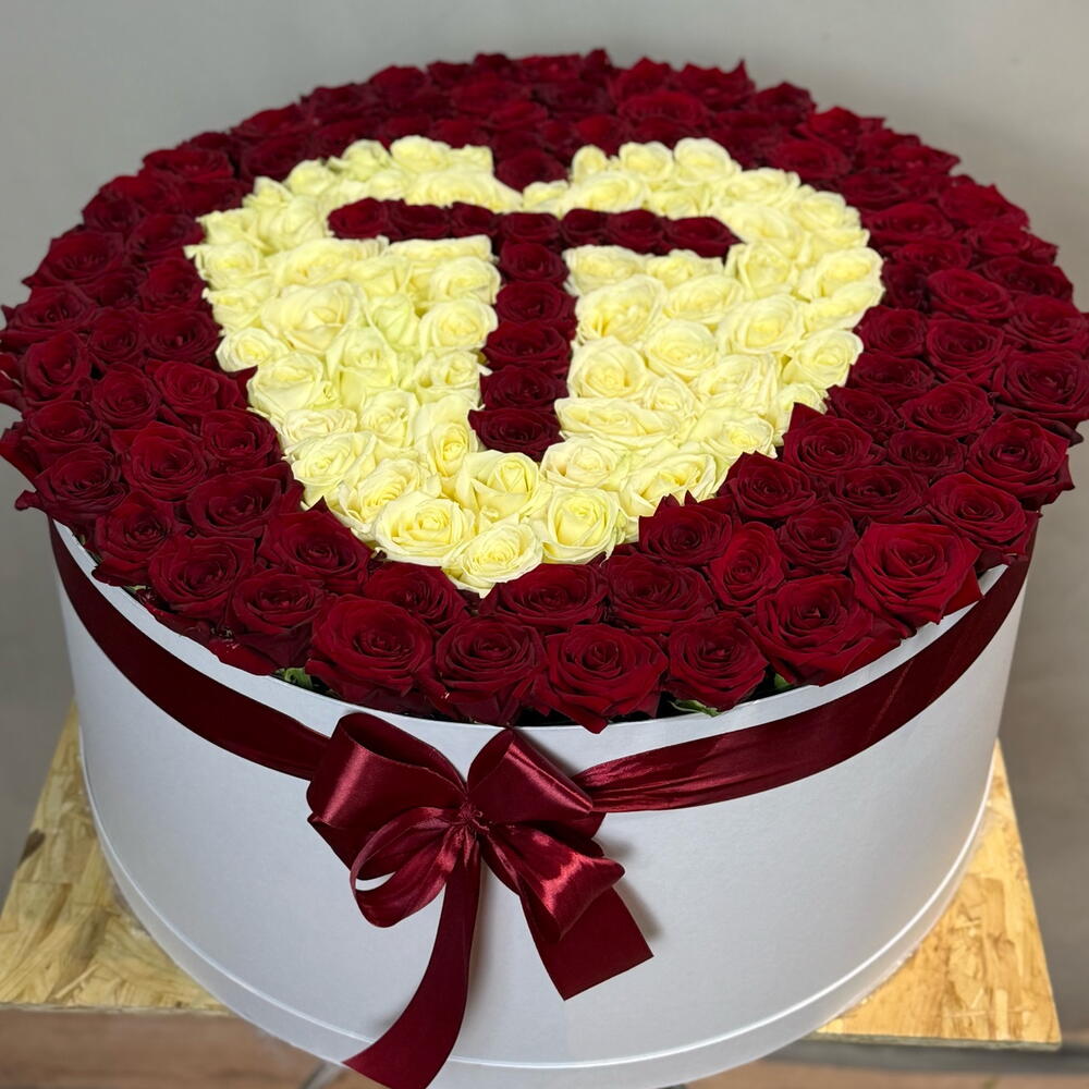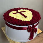 Лента атласная - 1 шт. Коробка шляпная - 1 шт. Оазис флористический - 1 шт. открыточка - 1 шт. роза микс - 101 шт.