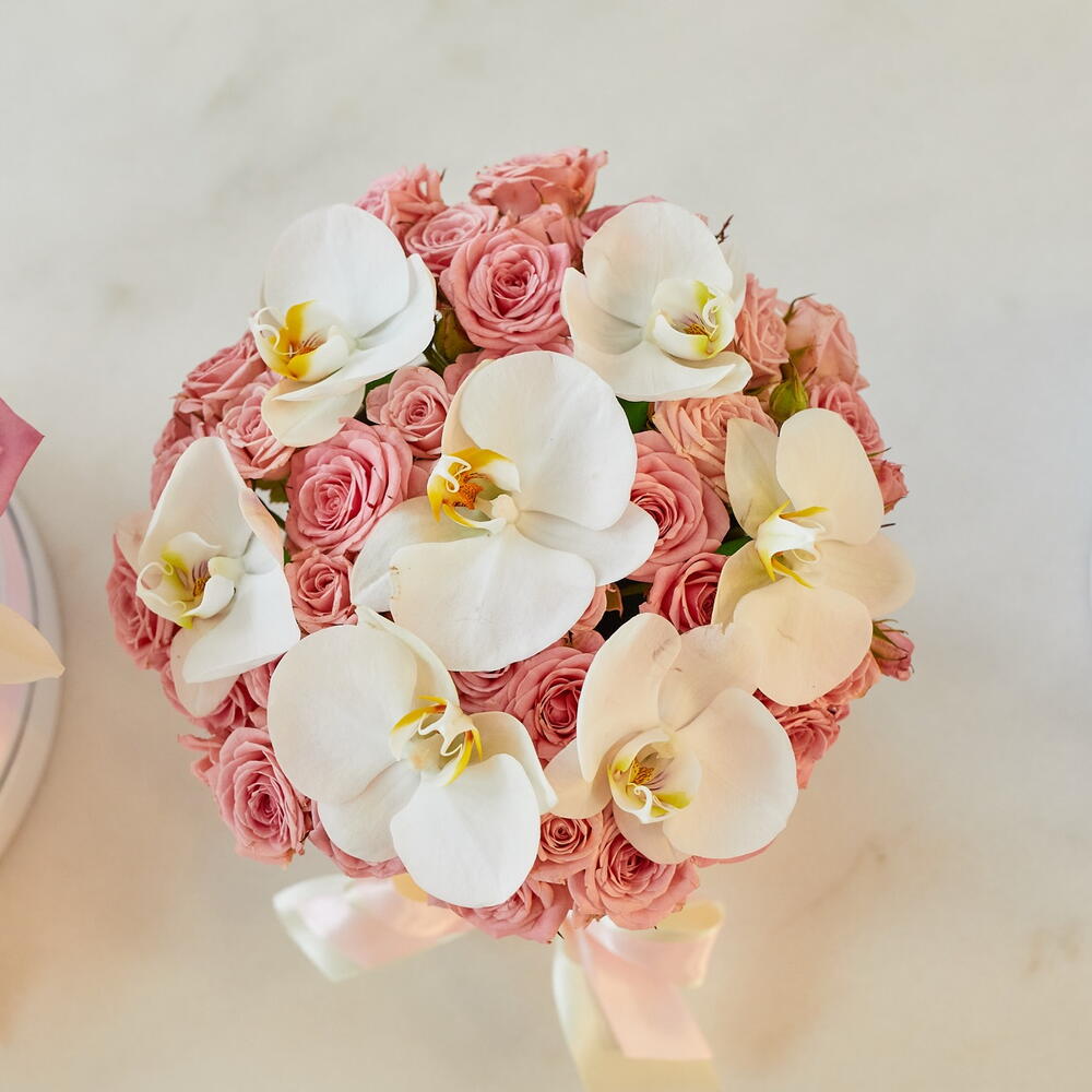 Роза кустовая - 9 шт. Лента атласная - 2 шт. Коробка - 1 шт. Орхидеи - 7 шт.