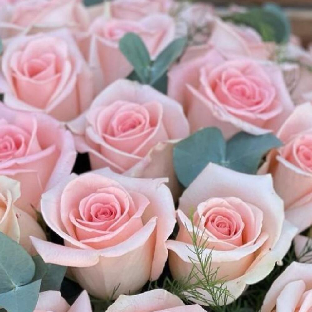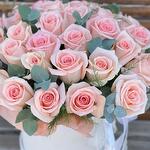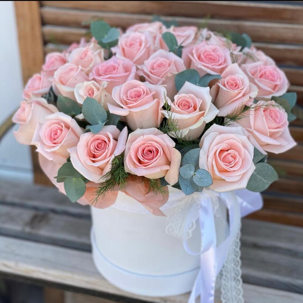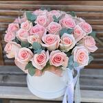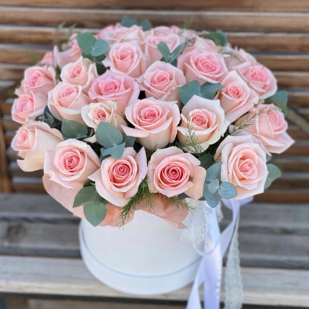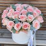 Эвкалипт - 8 шт. Роза - 29 шт. Лента атласная - 2 шт. Коробка шляпная - 1 шт. Оазис флористический - 2 шт.