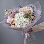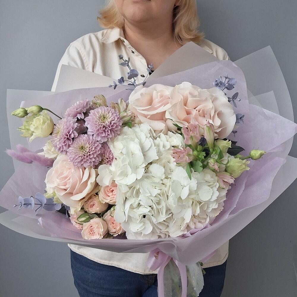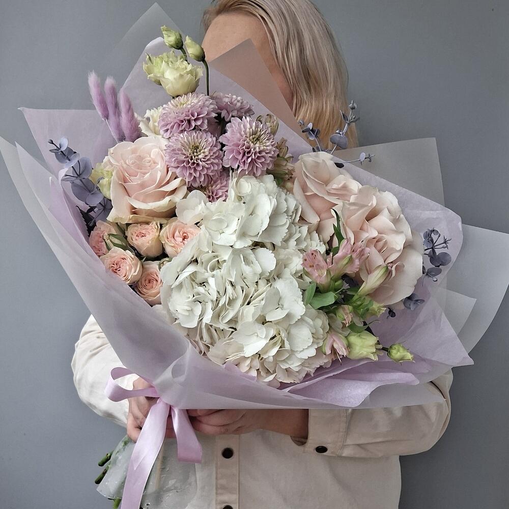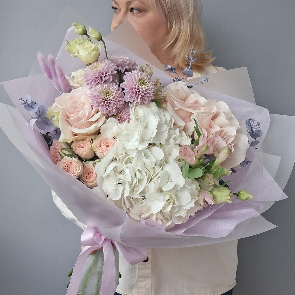 Альстромерия - 1 шт. Гортензия - 1 шт. Хризантема кустовая - 1 шт. Роза Эквадор - 3 шт. Лента атласная - 1 шт. Тишью - 2 шт. Роза кустовая пионовидная - 1 шт. Лагурус - 5 шт. Эвкалипт крашеный - 3 шт. Дизайнерская упаковка - 1 шт.