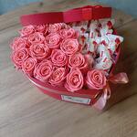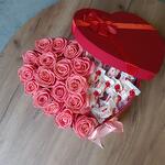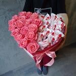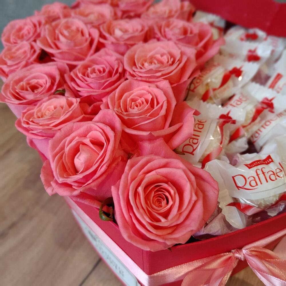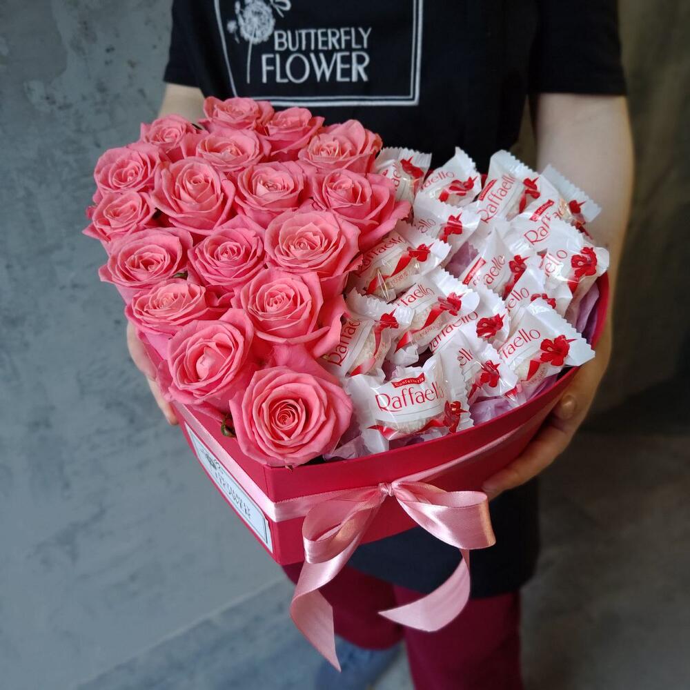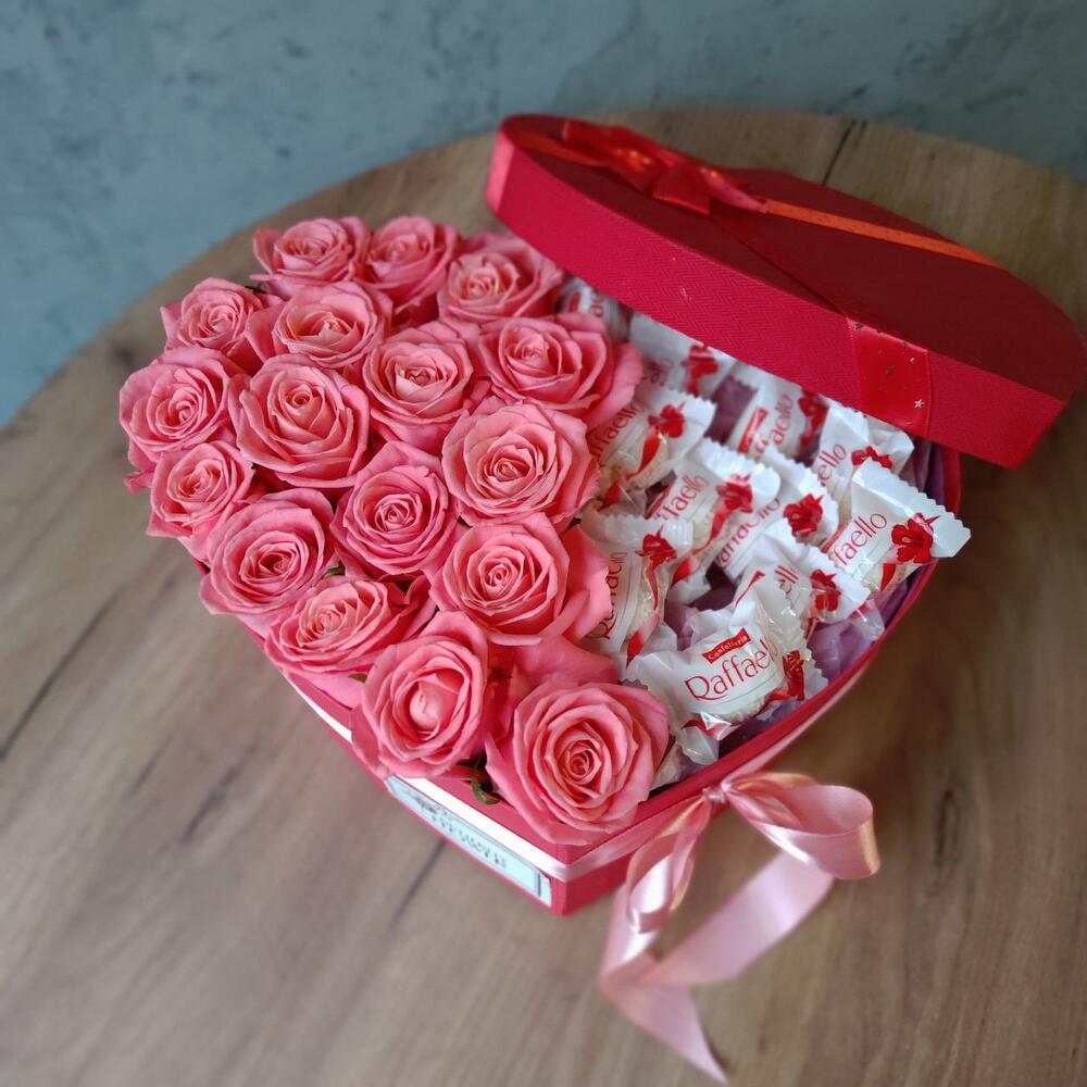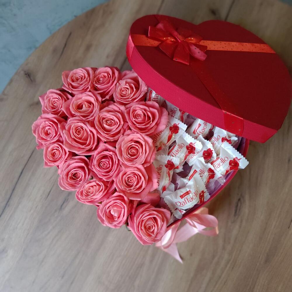 Букет из розовых роз и конфет Рафаэлло в декоративной коробке-сердце "С любовью и теплом"
