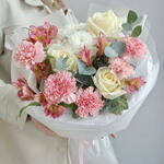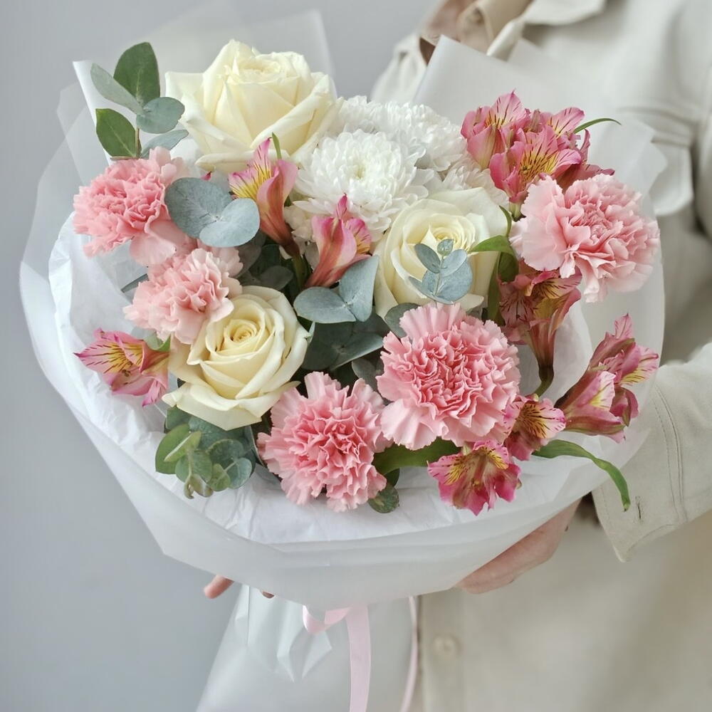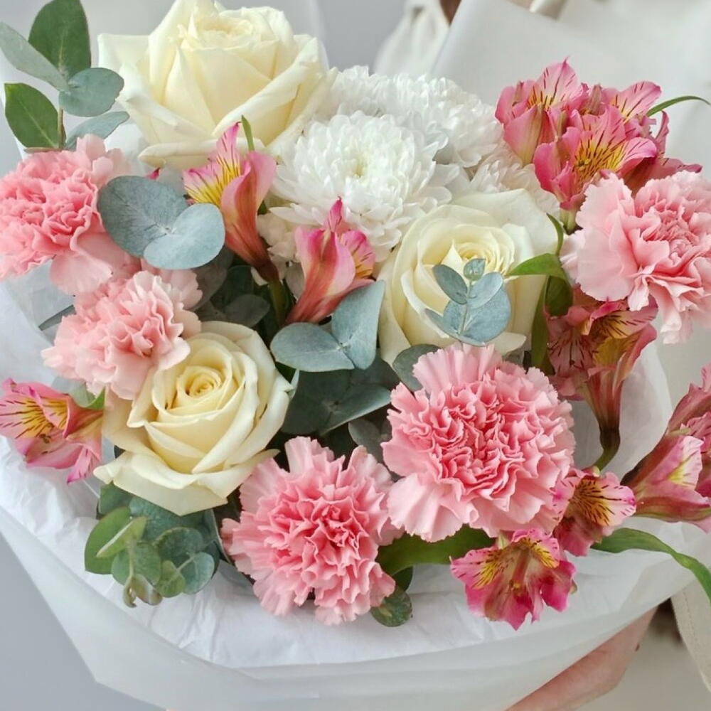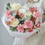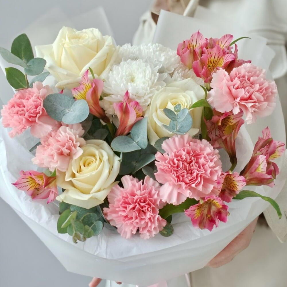 Альстромерия - 4 шт. Хризантема кустовая - 1 шт. Эвкалипт - 3 шт. Диантус - 5 шт. Роза белая - 3 шт. Упаковка дизайнерская - 4 шт. лента атлансная - 2 шт.