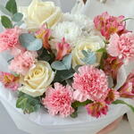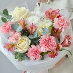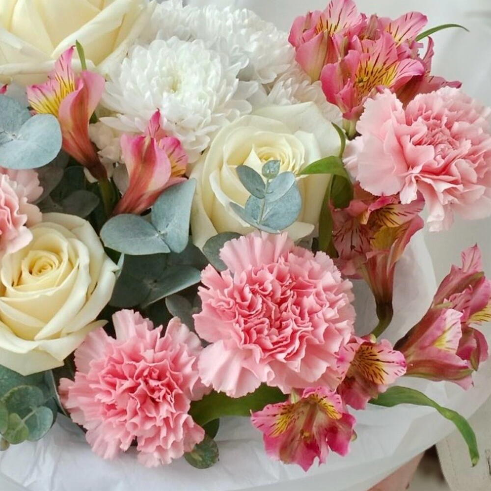 Букет из белых роз, диантусов (гвоздик) и альстромерий - это идеальный выбор для тех, кто ищет элегантный и романтичный подарок для своей второй половинки. Эти цветы символизируют чистоту, нежность и любовь, а их яркие оттенки добавят яркости и свежести в любой интерьер. Букет из этих цветов станет прекрасным подарком на любое торжество, будь то день рождения, свадьба или просто знак внимания для любимого человека.
