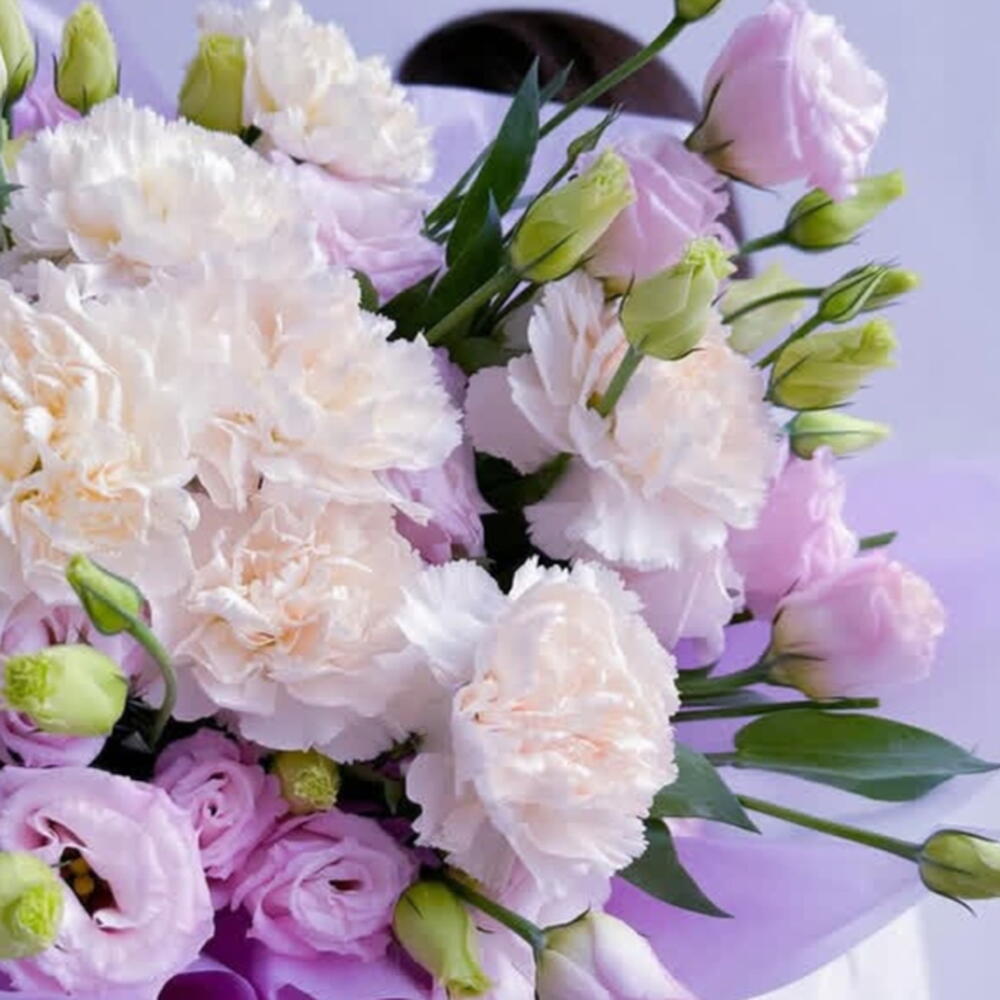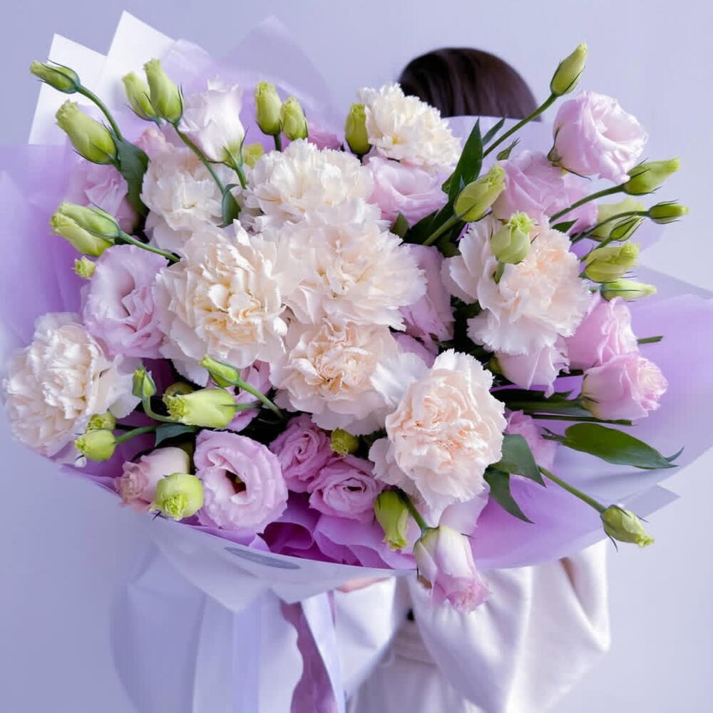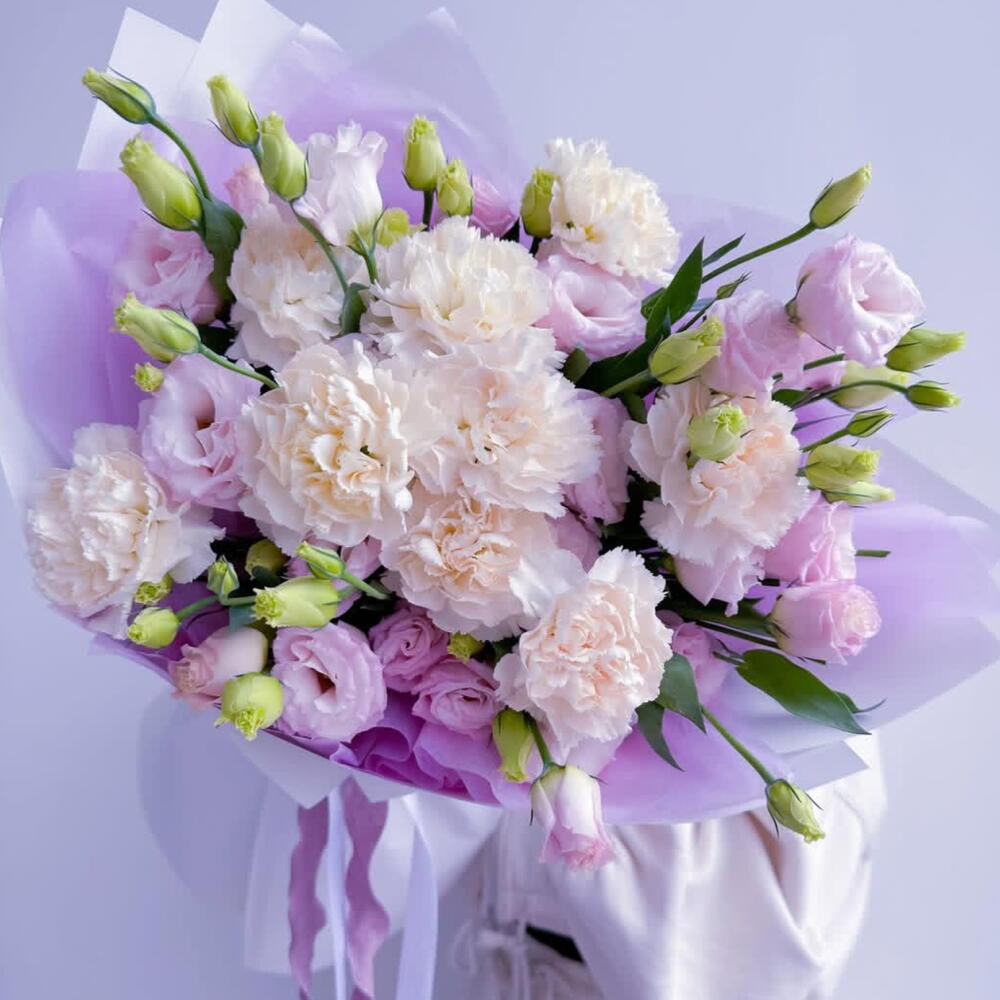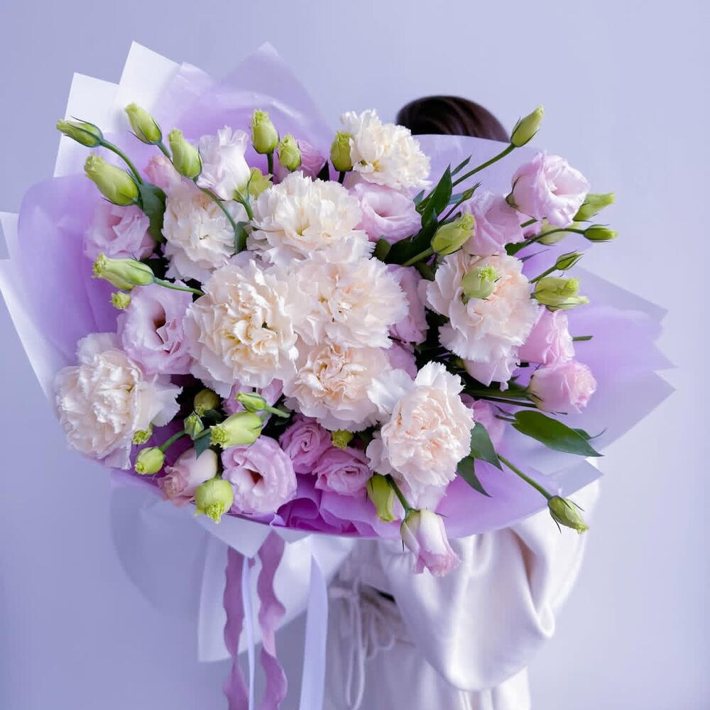 Лента атласная - 1 шт. Диантус - 9 шт. Пленка дизайнерская - 2 шт. лизиантус эустома - 10 шт. тишью лиловый - 2 шт.