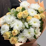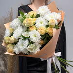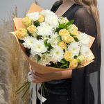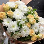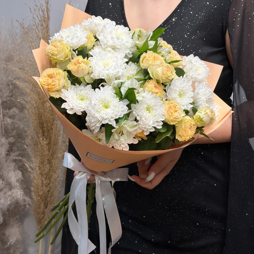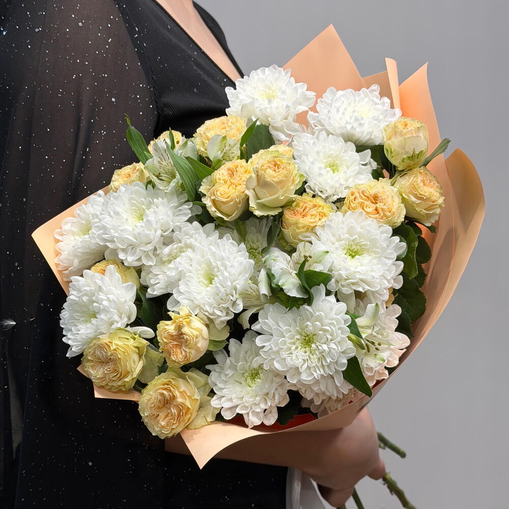 Сборный букет из кустовой хризантемы, абрикосовой розы и белой альстромерии — нежная и элегантная композиция в светлых оттенках. Идеальный выбор для подарка на любой повод: от романтического жеста до искреннего комплимента. Свежие цветы и аккуратное оформление с доставкой.