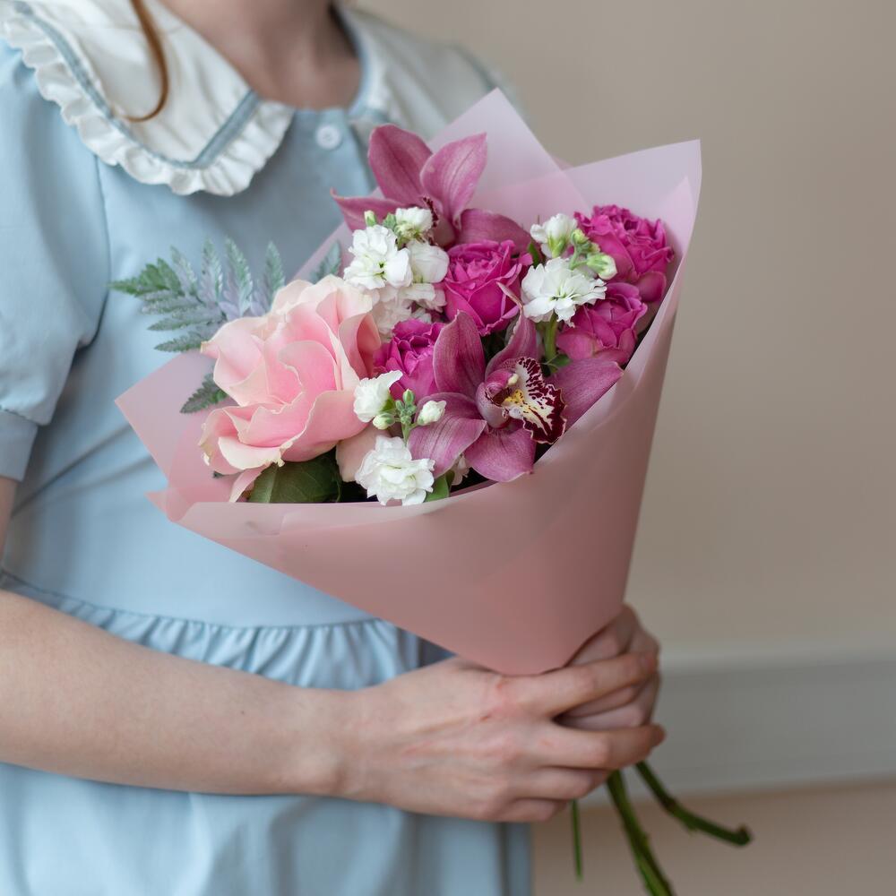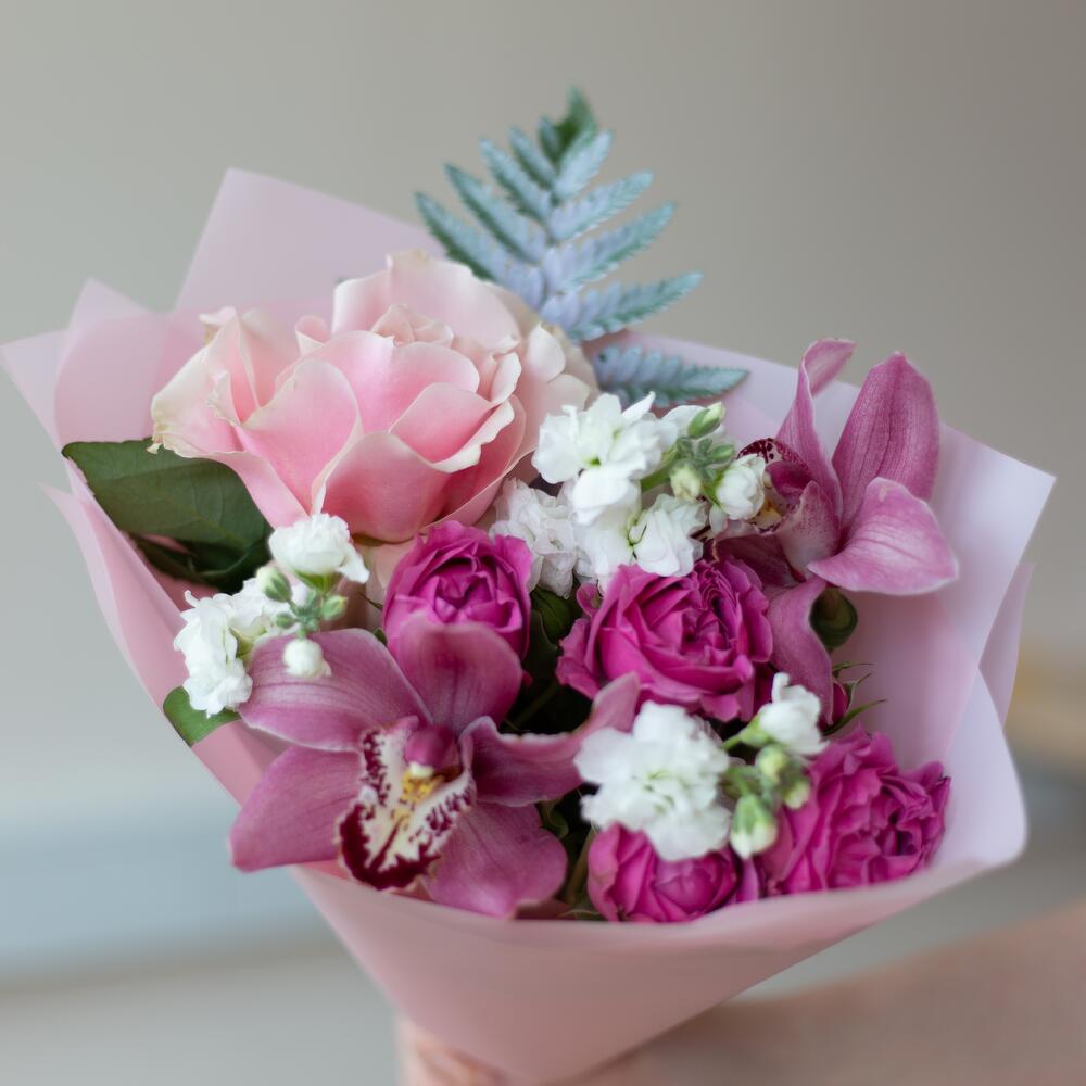 Орхидея Цимбидиум - 2 шт. Папоротник - 1 шт. Пленка - 1 шт. Французская роза - 1 шт. Пионовидная кустовая роза - 1 шт. маттиола кустовая - 1 шт.