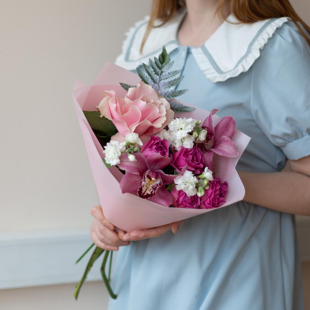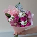 Сборный небольшой букет с французской розой и орхидеями "Прекрасного настроения"