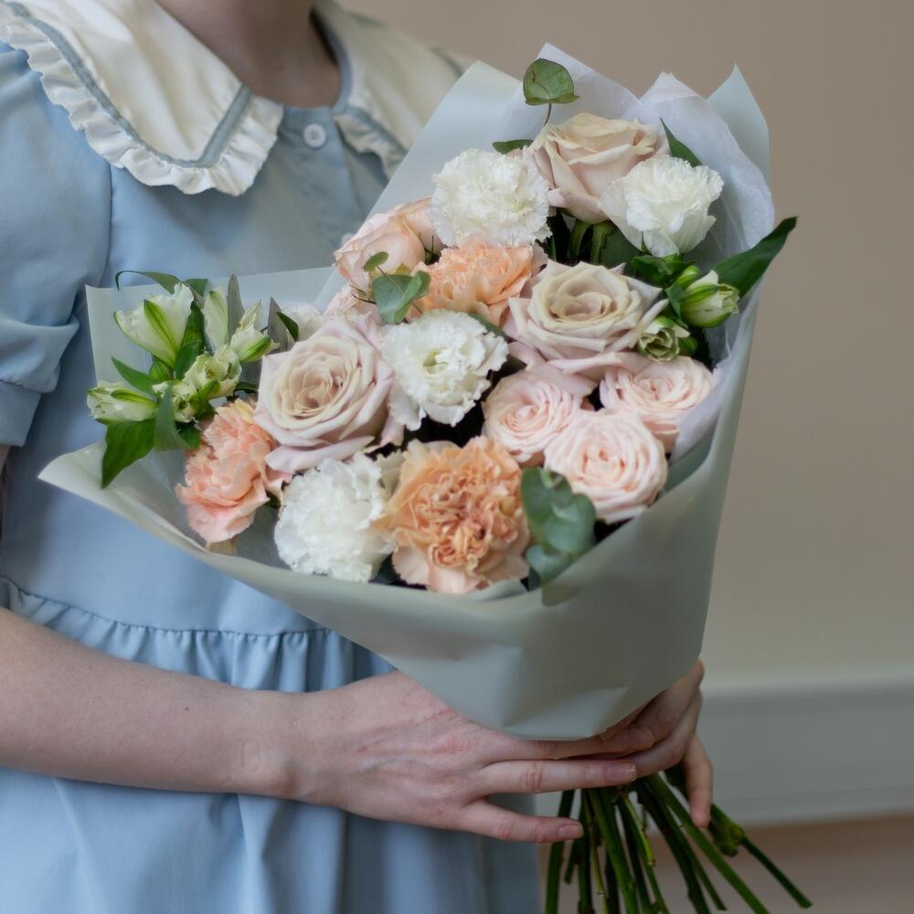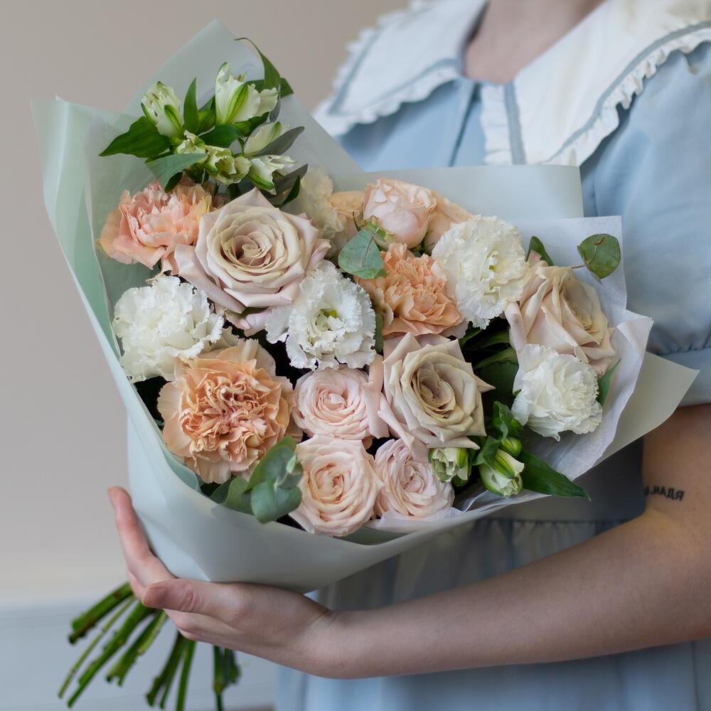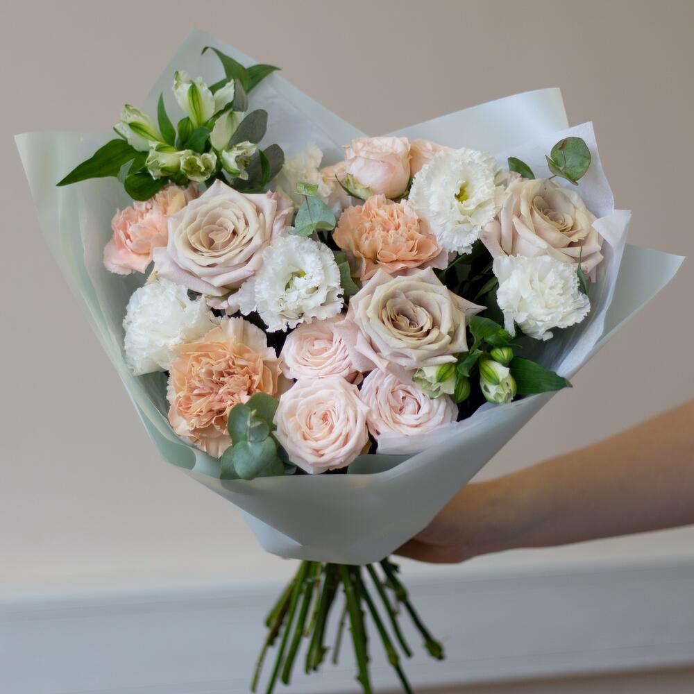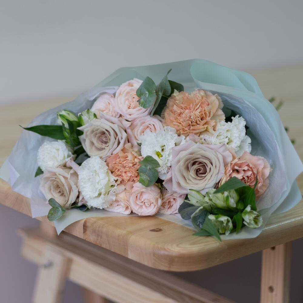 Эвкалипт - 4 шт. Упаковка дизайнерская - 1 шт. эустома белая - 2 шт. бомбастик роза кустовая - 2 шт. диантус сортовой карамель - 3 шт. роза премиум мента - 3 шт. альстромерия белая - 2 шт.