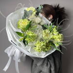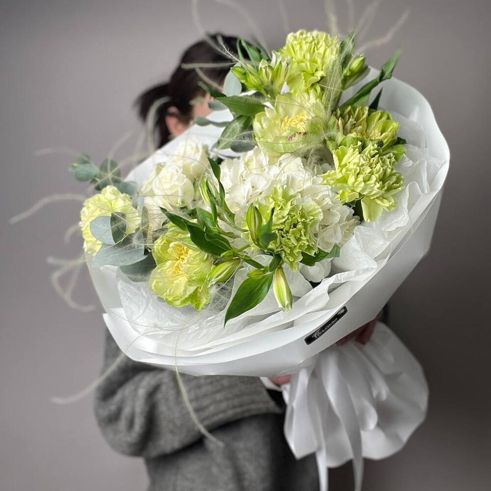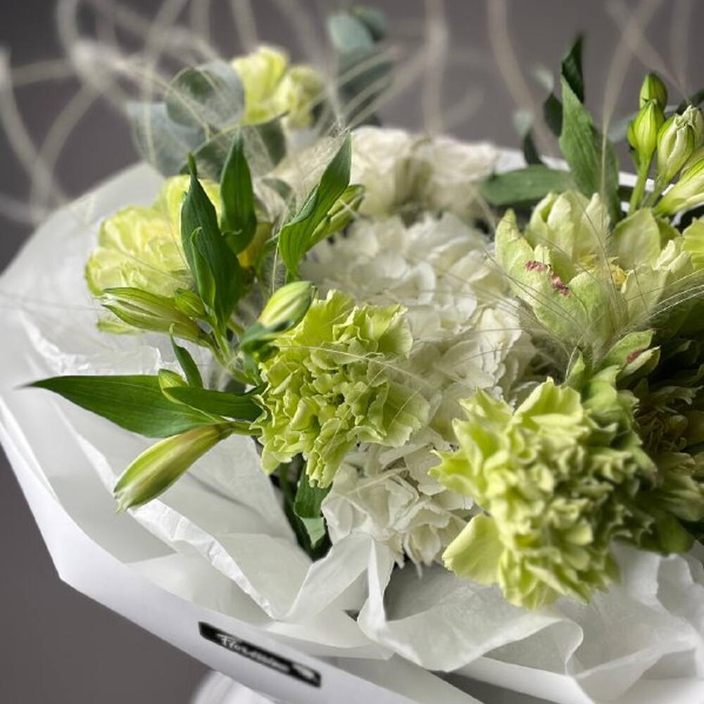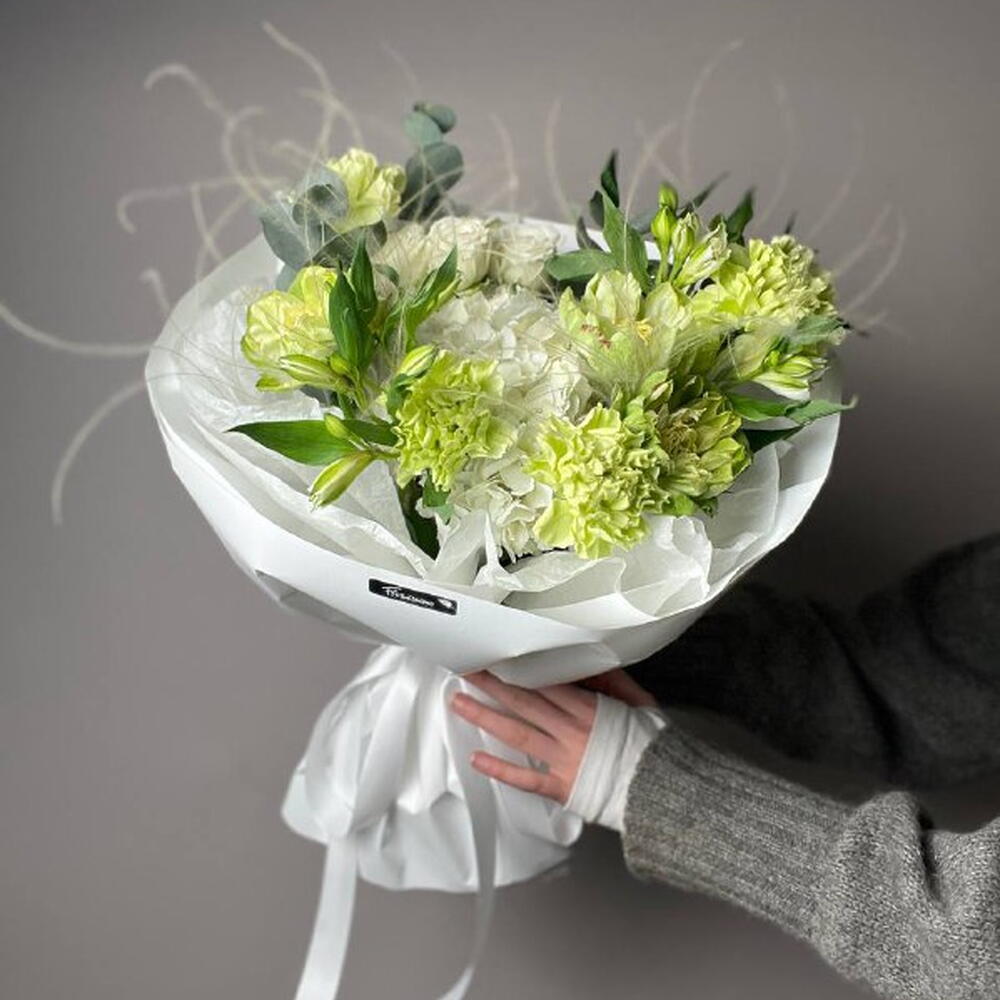 Альстромерия - 2 шт. Гортензия - 1 шт. Эвкалипт - 1 шт. Гвоздика - 3 шт. Упаковка дизайнерская - 1 шт. Ковыль - 2 шт. роза вегги - 3 шт. кустовая роза айвори - 1 шт.