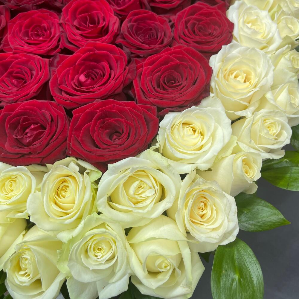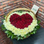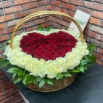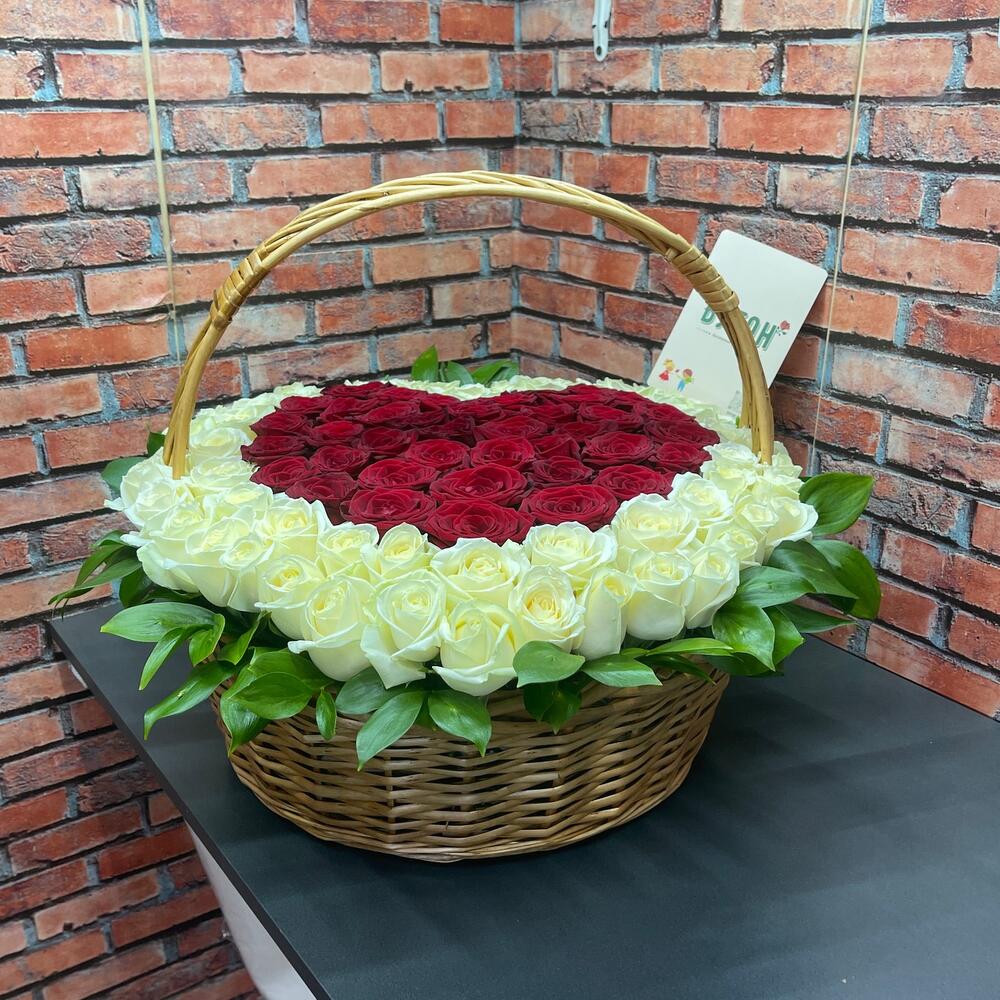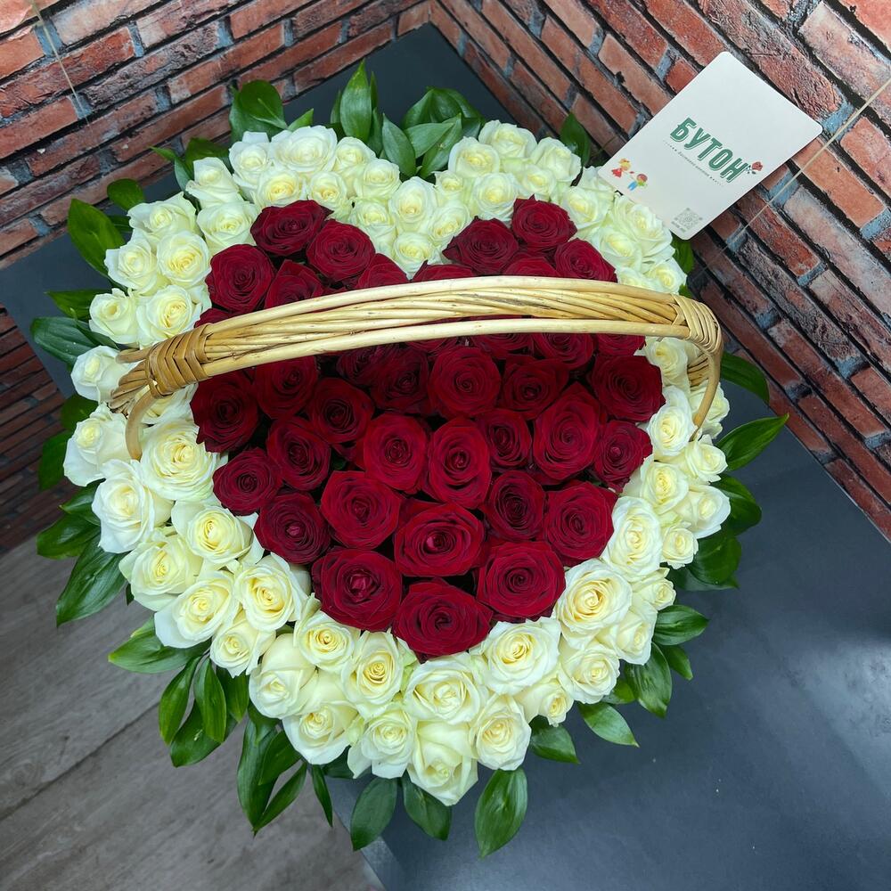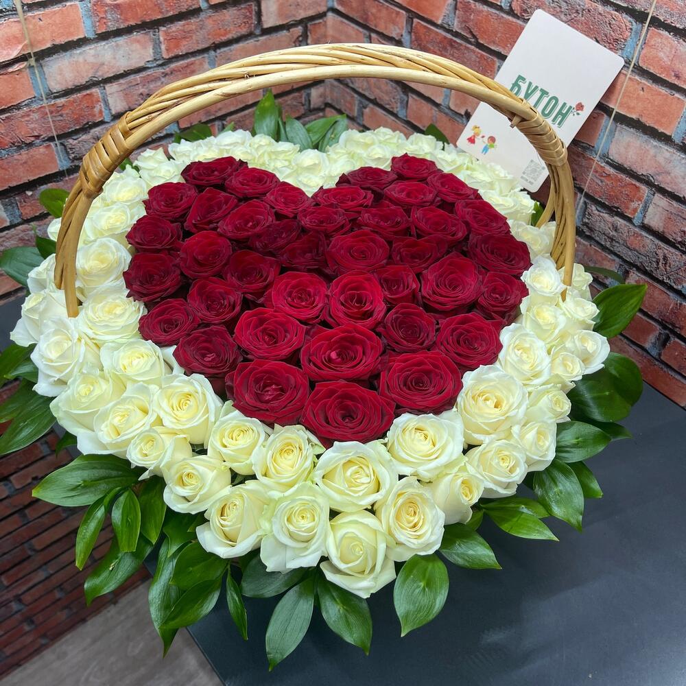 Рускус - 1 шт. Роза - 101 шт. Корзина плетеная - 1 шт. Губка флористическая - 1 шт.