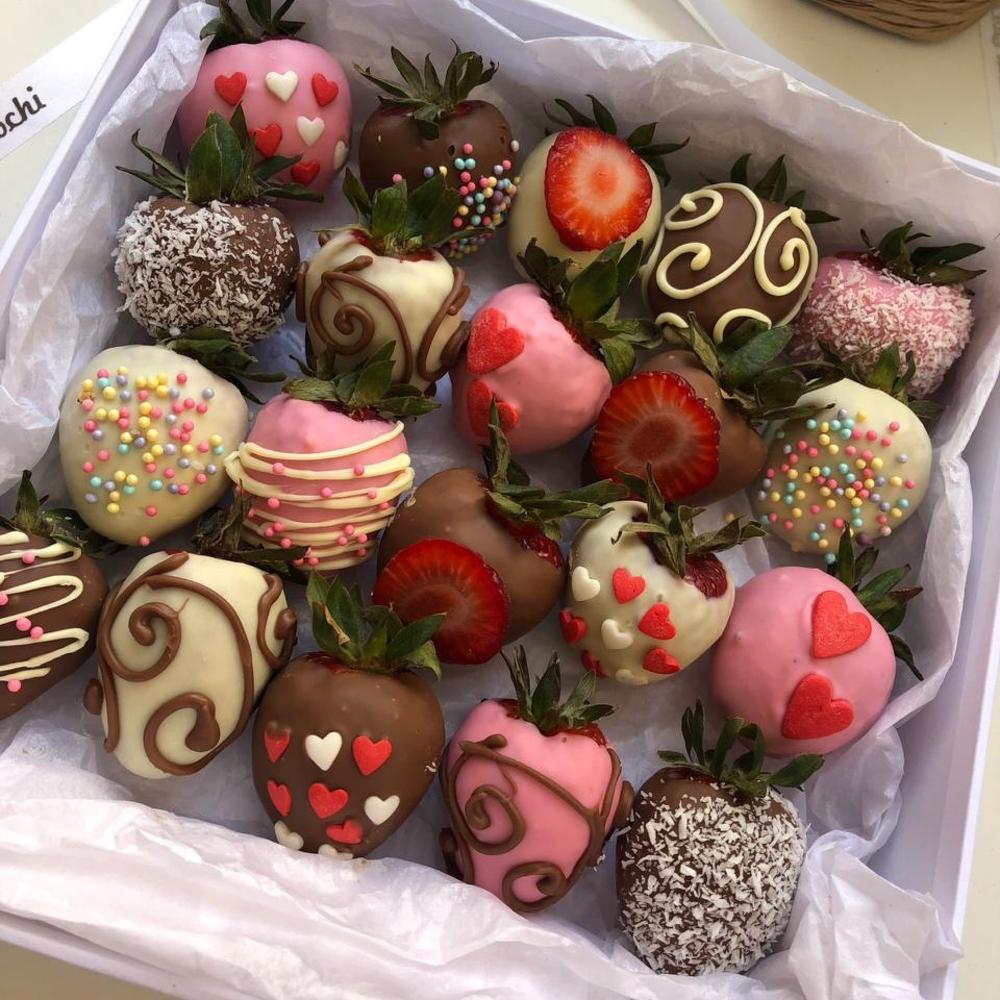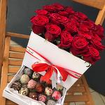 Роза - 25 шт. Лента атласная - 1 шт. Шкатулка - 1 шт. Клубника в шоколаде callebaut (бельгия) - 20 шт.