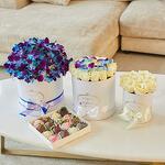 Орхидея Дендробиум - 56 шт. Роза - 28 шт. Атласная лента - 3 шт. Коробка ручной работы - 3 шт. Флористическая губка - 5 шт. клубника в шоколаде 16-20 шт - 1 шт.