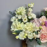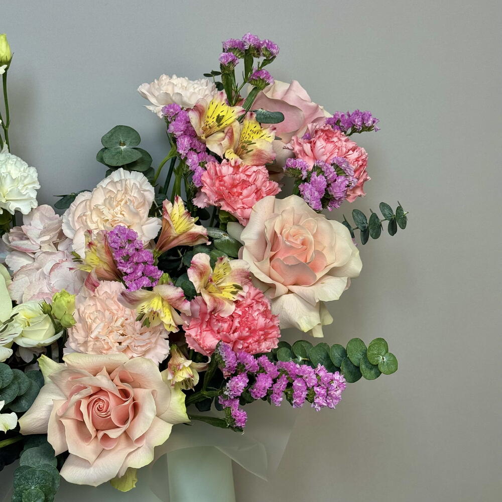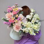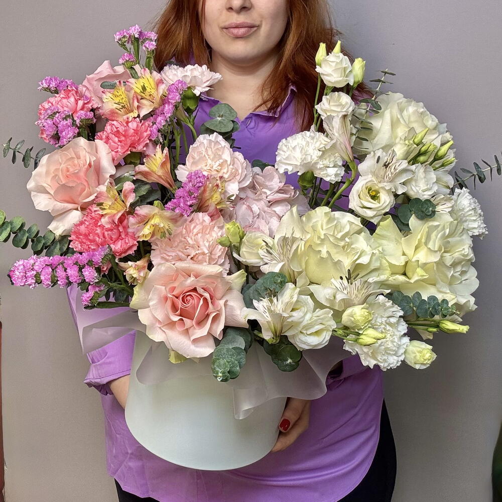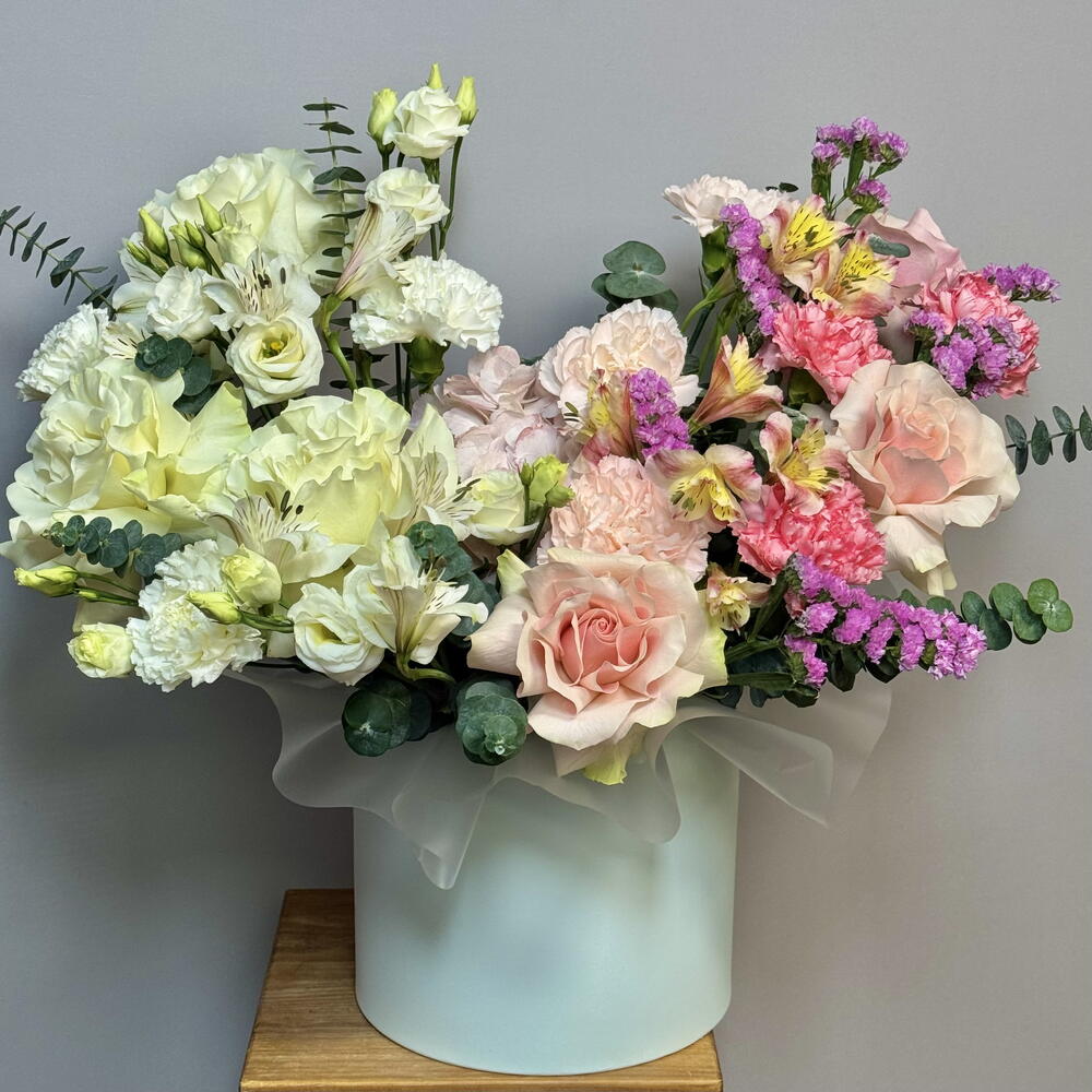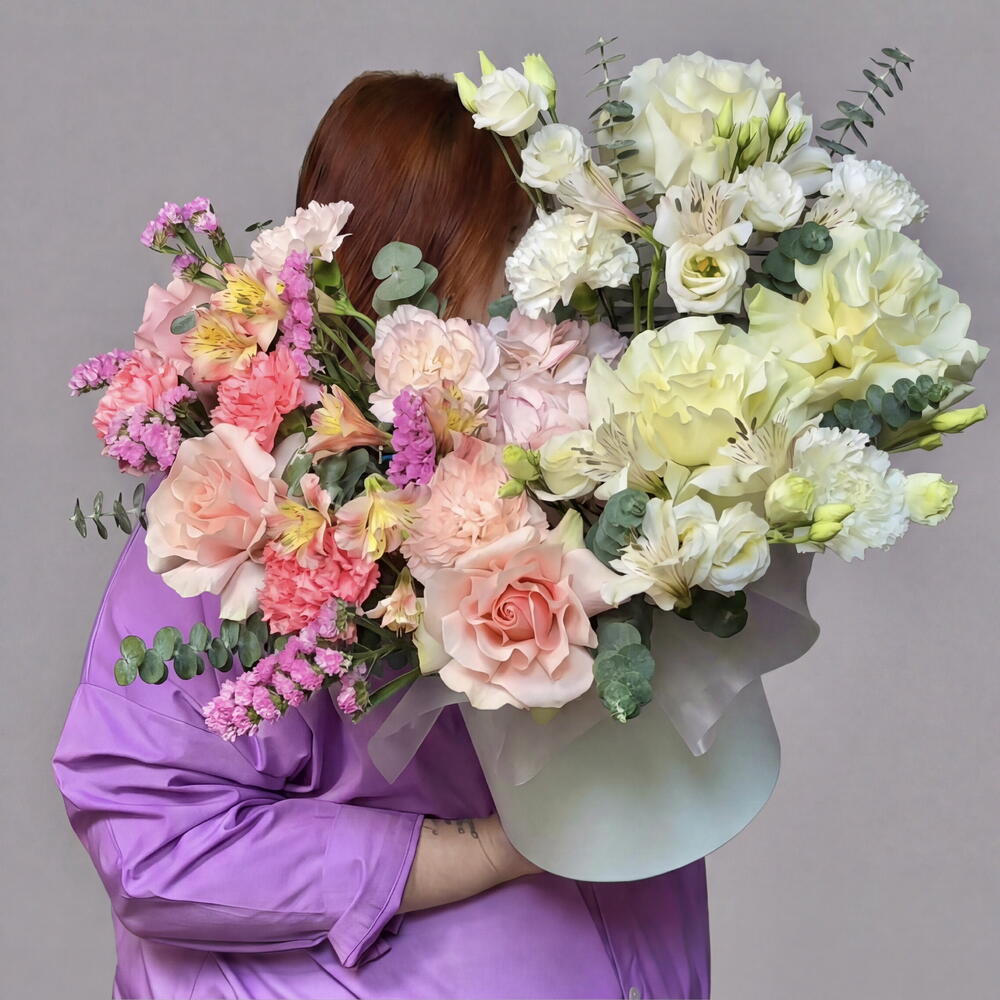 Альстромерия - 4 шт. Гортензия - 1 шт. Статица - 3 шт. Эвкалипт - 5 шт. Гвоздика - 9 шт. Эустома - 2 шт. Коробка - 1 шт. Роза французская розовая - 3 шт. Губка флористическая - 1 шт. роза французская белая - 3 шт.