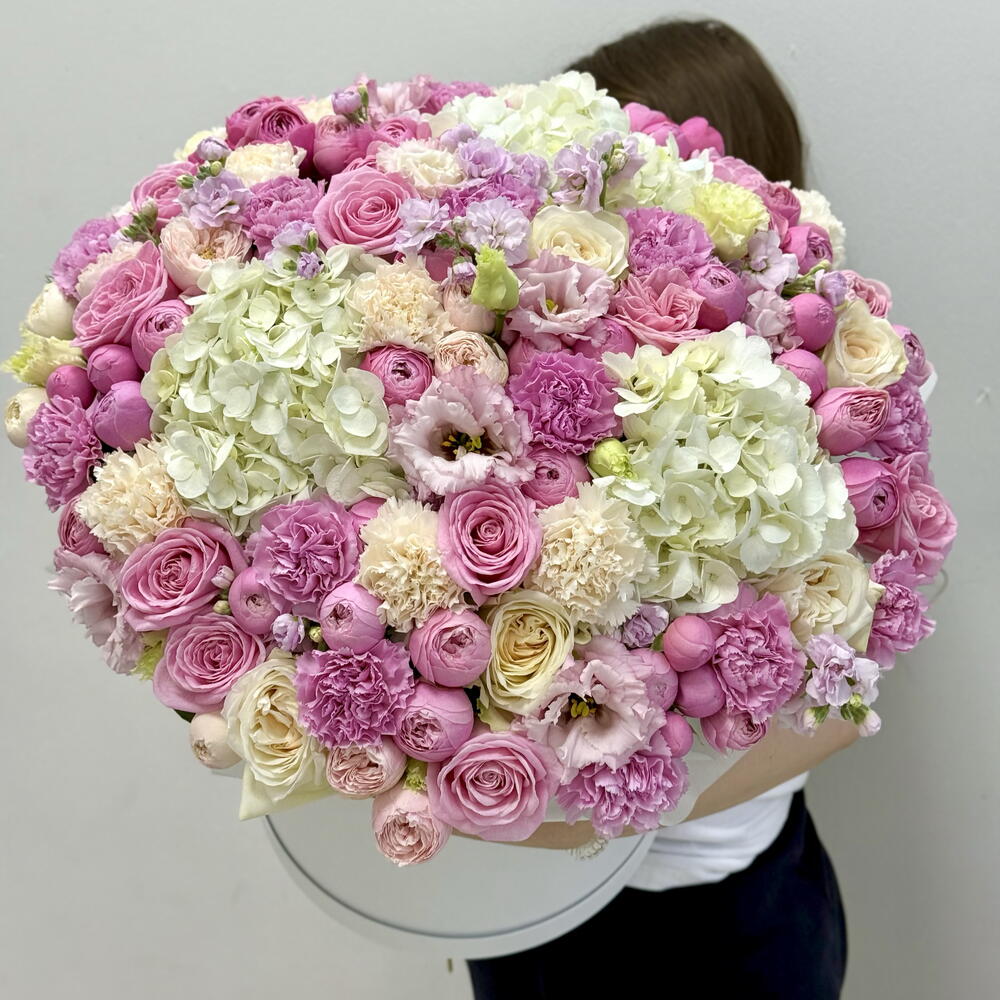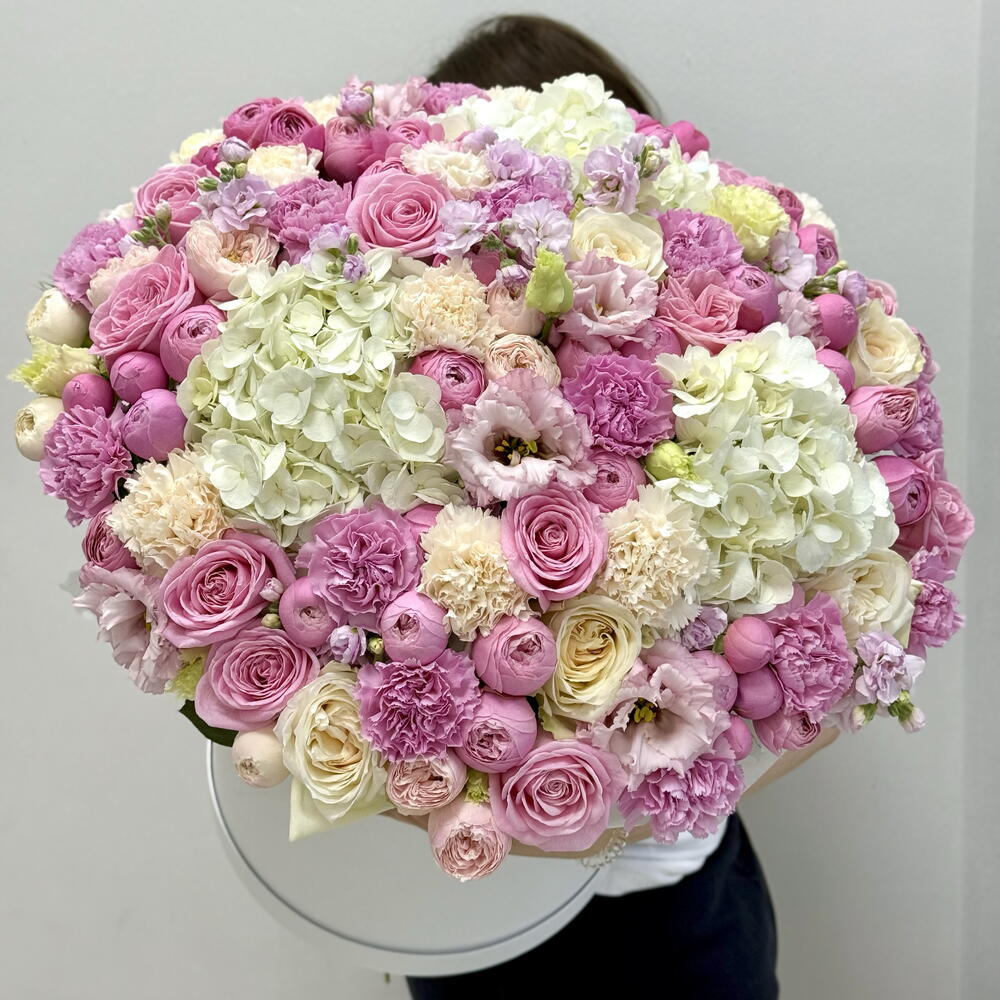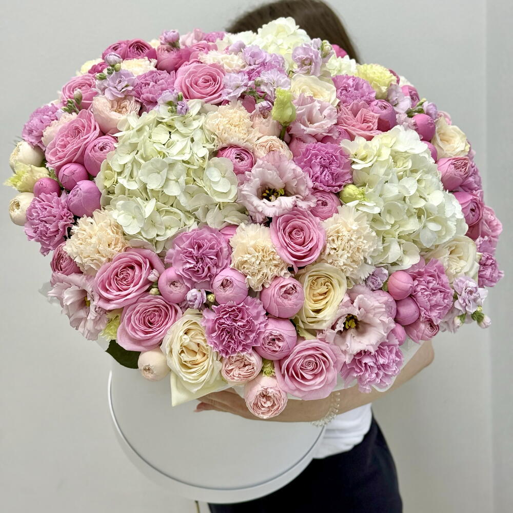 Маттиола - 5 шт. Эустома - 4 шт. Коробка шляпная - 1 шт. Кустовая пионовидная роза - 11 шт. Гортензия белая - 3 шт. Роза одноголовая пионовидная - 15 шт. Диантус сортовой - 21 шт. открытка с вашими пожеланиями - 1 шт. памятка по уходу - 1 шт.