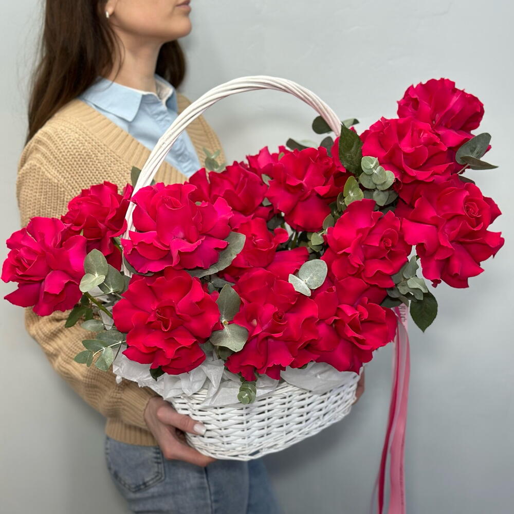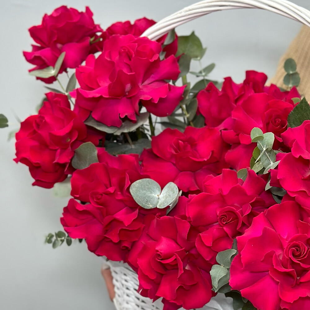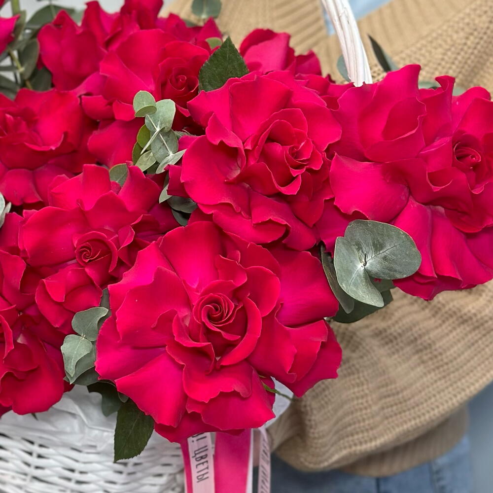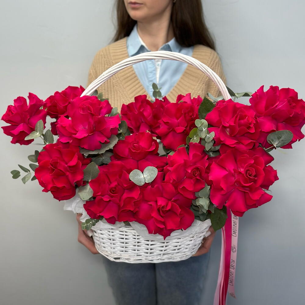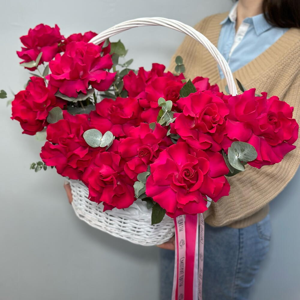 Шикарная корзина с малиновыми Французскими розами и зеленью эвкалипта