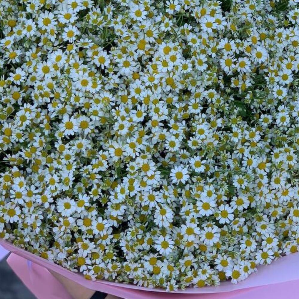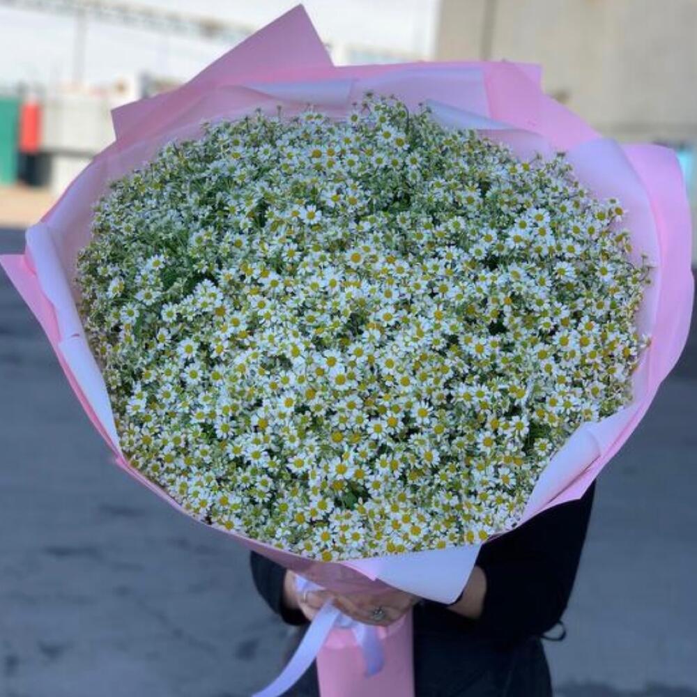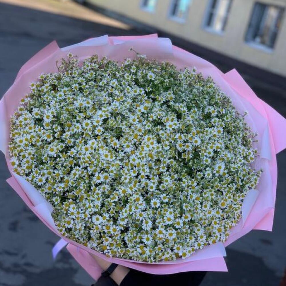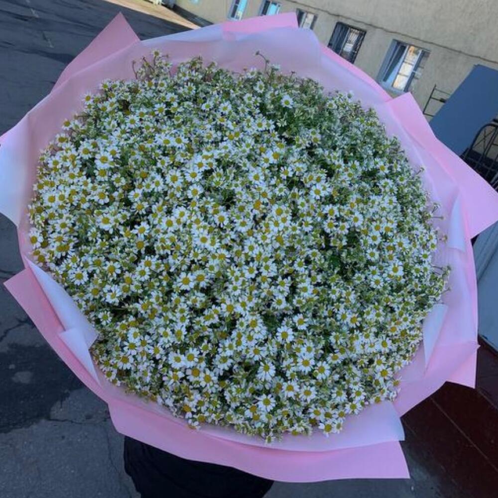 Лента атласная - 2 шт. Упаковка дизайнерская - 4 шт. Ромашка танацетум - 101 шт.