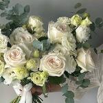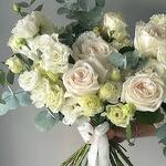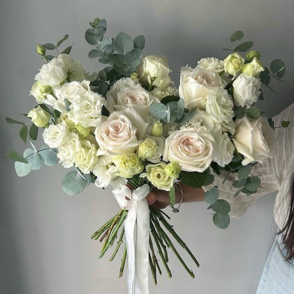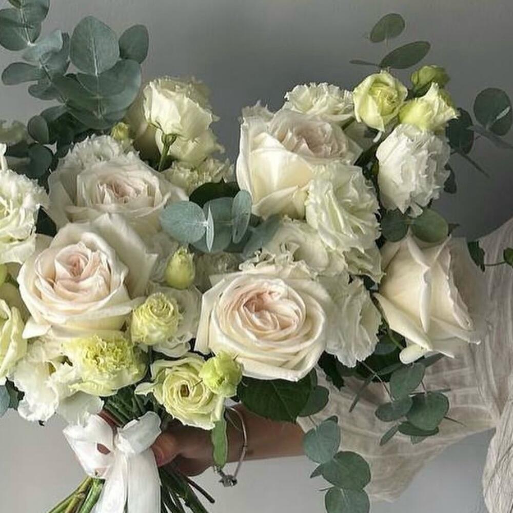 Эвкалипт - 5 шт. Эустома - 8 шт. Лента атласная - 2 шт. роза white ohara ароматная - 9 шт.