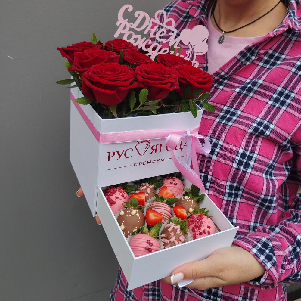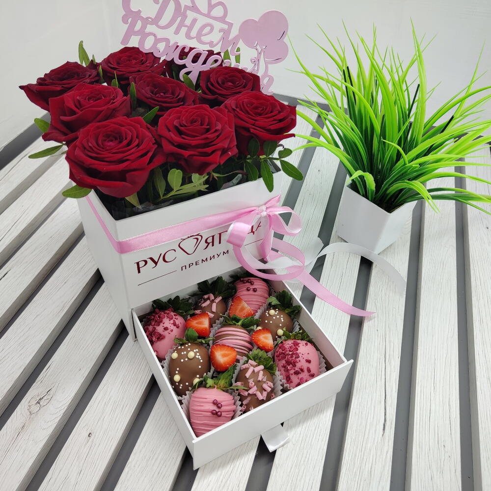 Роскошная,элегантная шкатулка с секретом ,ароматными розовыми розами,сочная и сладкая клубника в настоящем бельгийском шоколаде точно порадует ваших близких и будет отличным подарком по любому поводу. Открытка бесплатно, распечатаем Ваш текст. Стоимость деревянной таблички оплачивается отдельно.