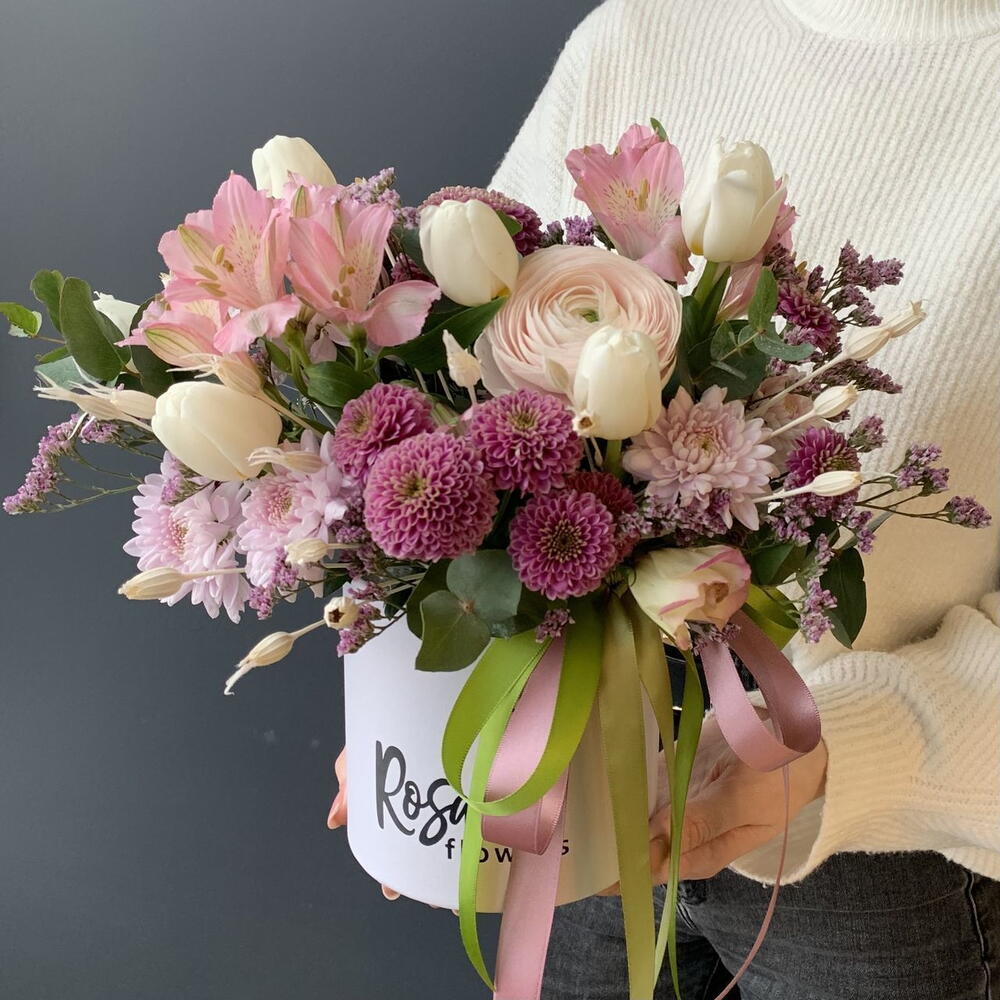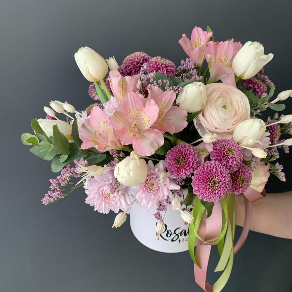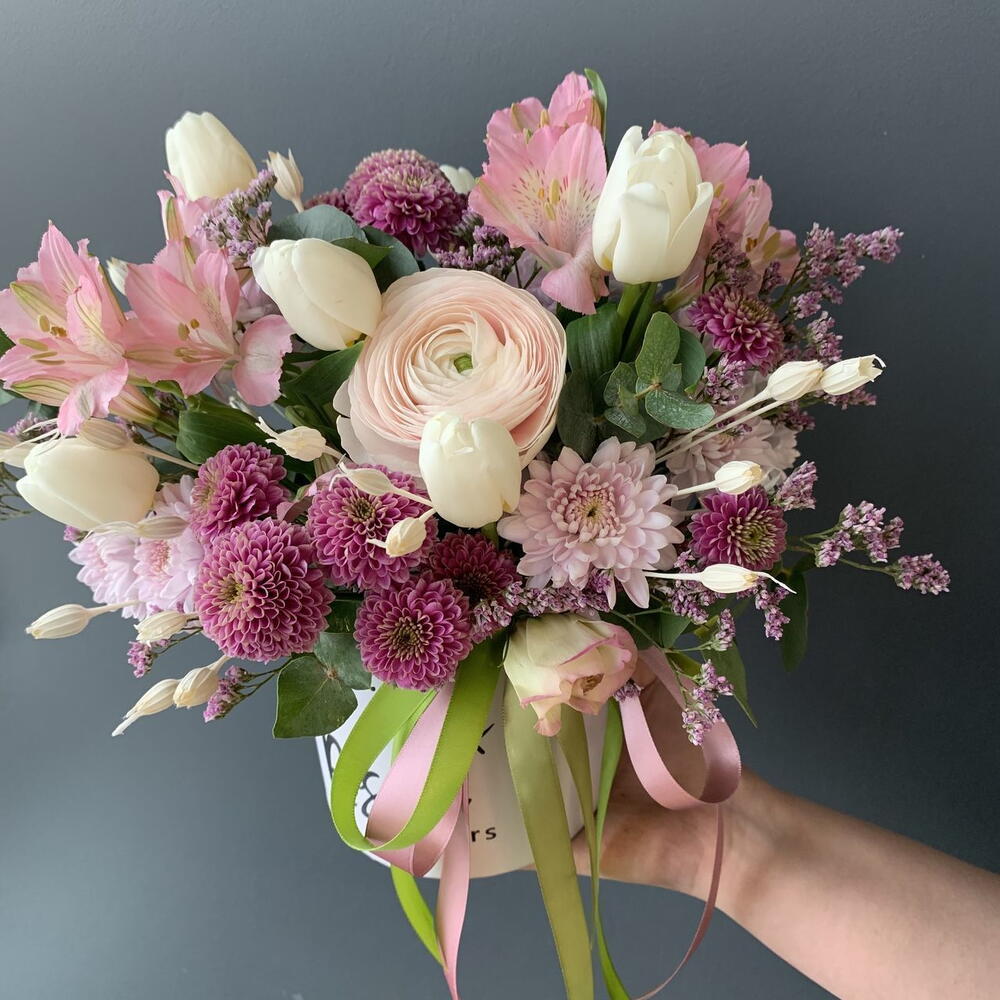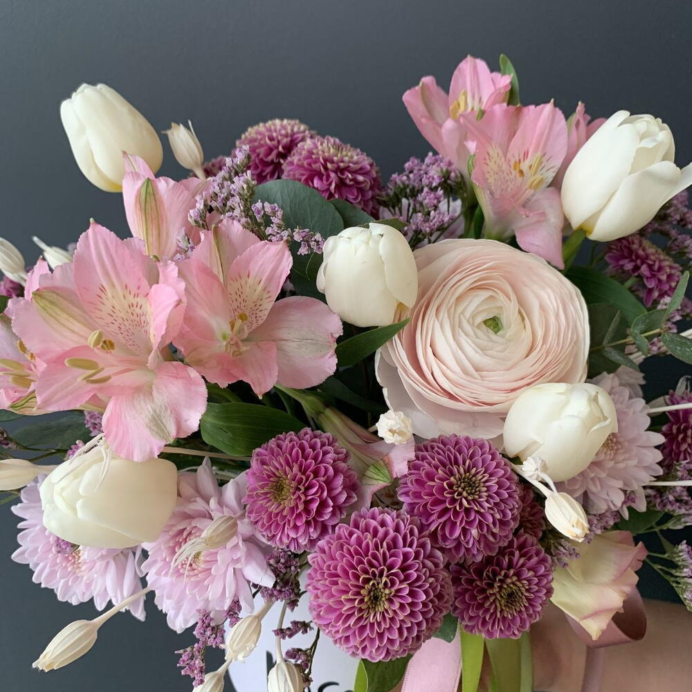 Альстромерия - 2 шт. Лимониум - 2 шт. Эвкалипт - 1 шт. Оазис - 1 шт. Ранункулюс - 1 шт. Тюльпан дабл - 7 шт. Хризантема кустовая mix - 2 шт. открытка фирменная - 1 шт. сантини mix - 2 шт. упаковка пленка прозрачная 1 м - 1 шт. фирменная коробка 11 см серый - 1 шт.