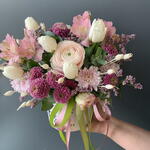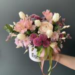 Сиреневое настроение Доставляется в транспортировочной коробке Состав: оазис, ранункулюс, хризантема, сантини, альстрамерия, лимониум, эвкалипт, тюльпаны Ширина, см: 25 Длина, см: 25 Высота, см: 25 Вес: 0.9 кг..