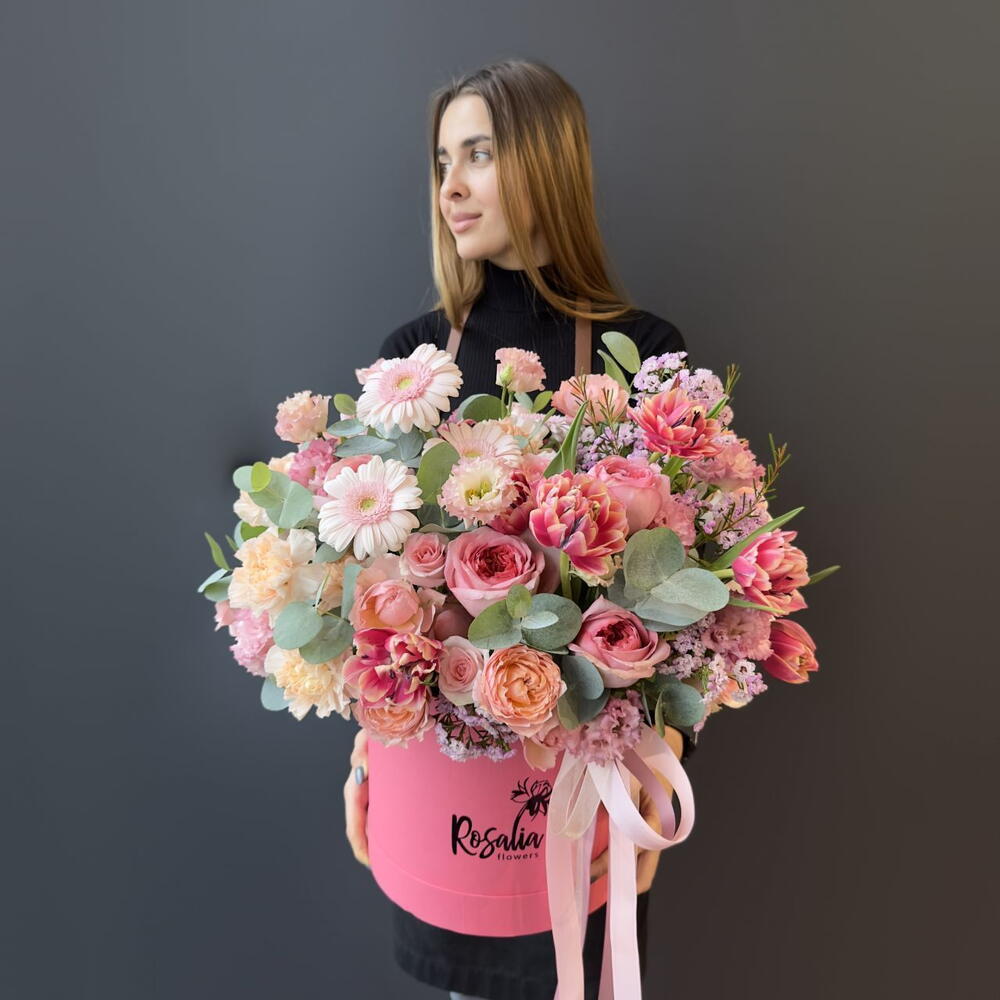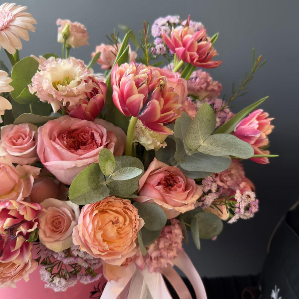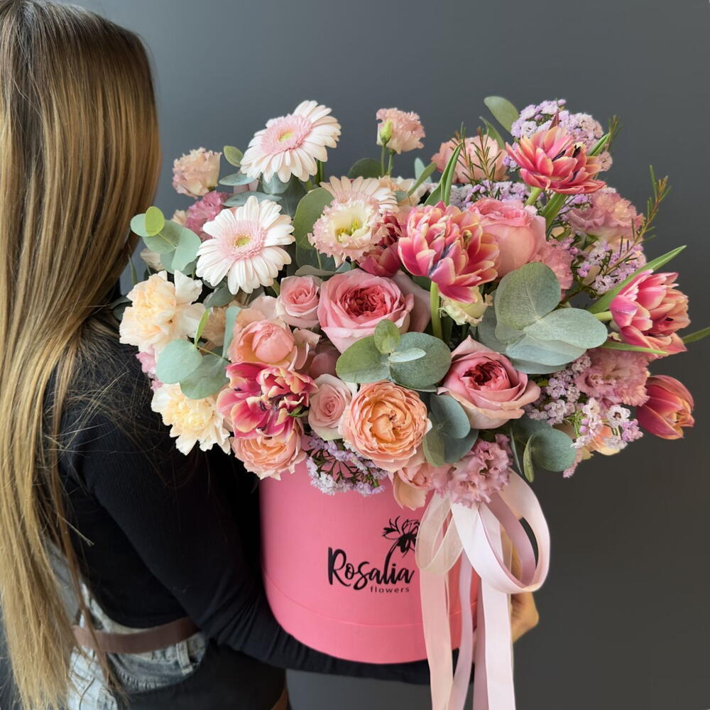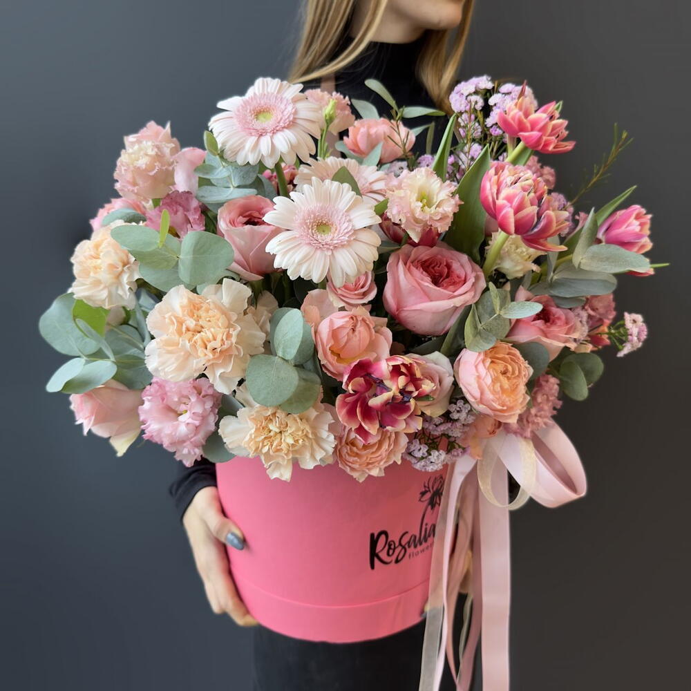 Нежная композиция в шляпной коробке с тюльпанами! Состав: роза кустовая пионовидная, гербера мини, шимилациум, эвкалипт, оазис, роза кения, гвоздика, лизиантус, роза эквадор, тюльпаны Ширина, см: 50 Длина, см: 50 Высота, см: 50 Вес: 0.9 кг..