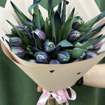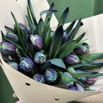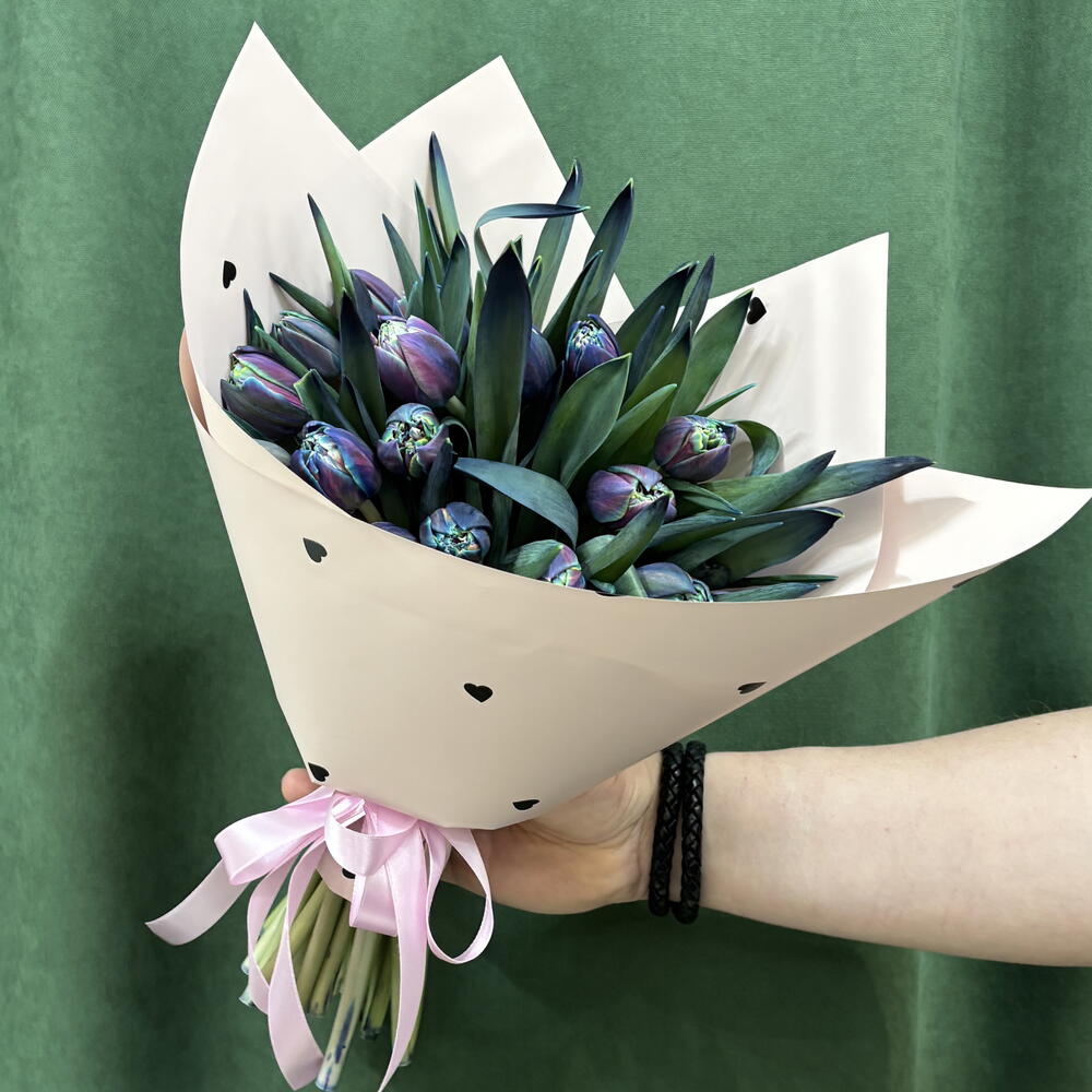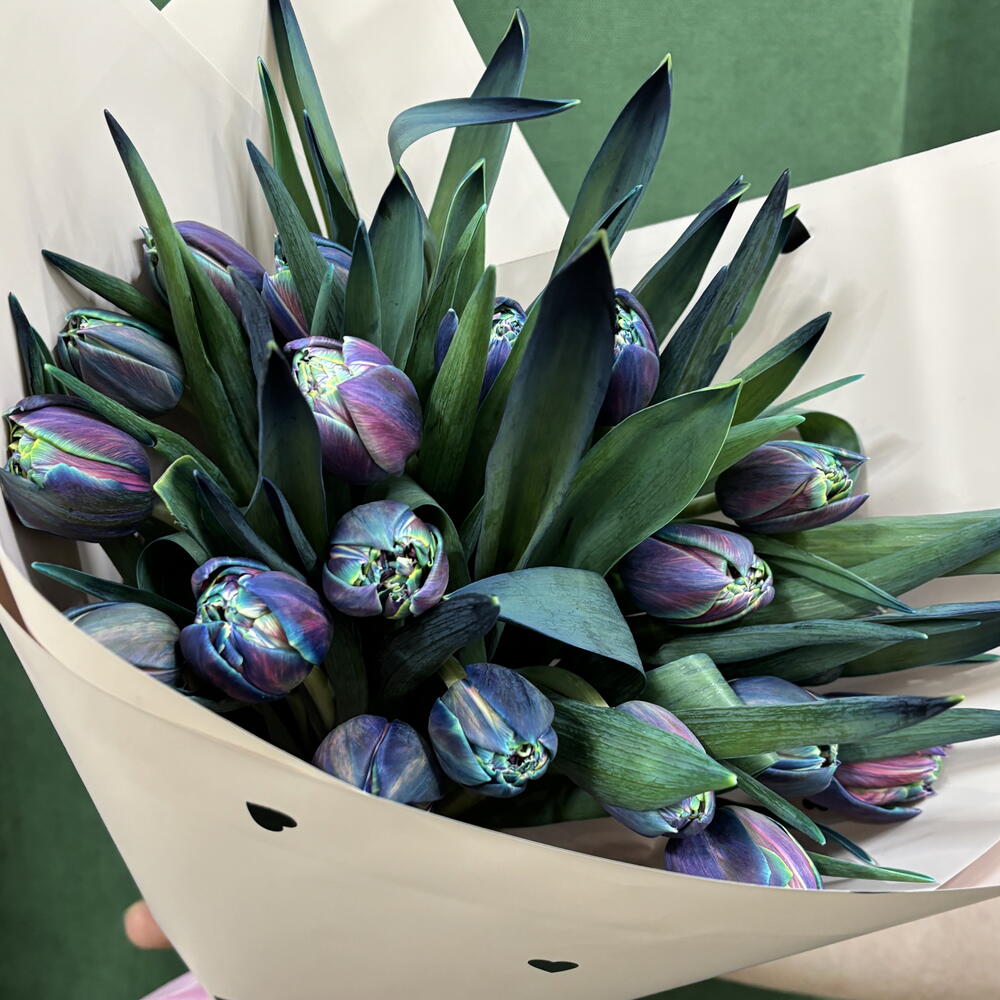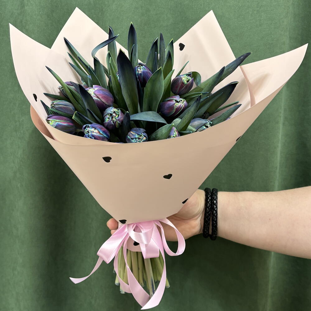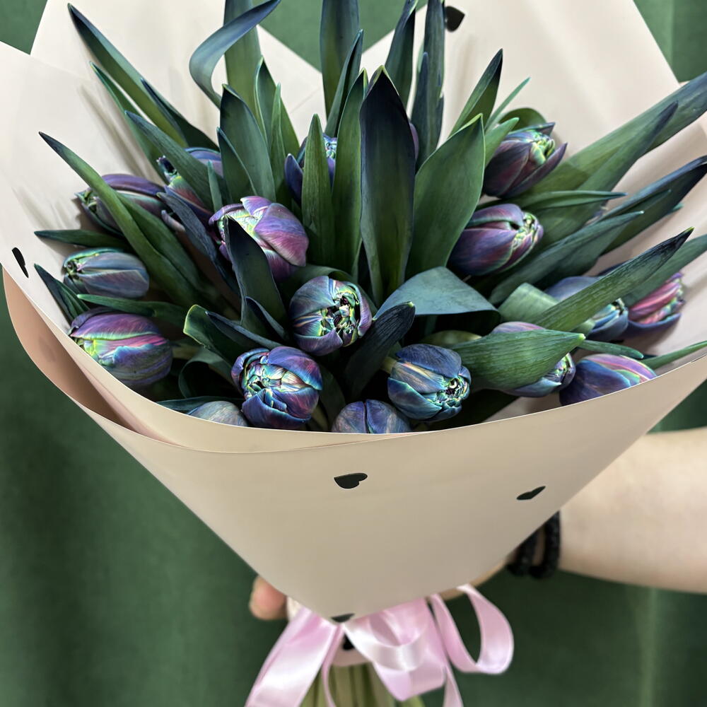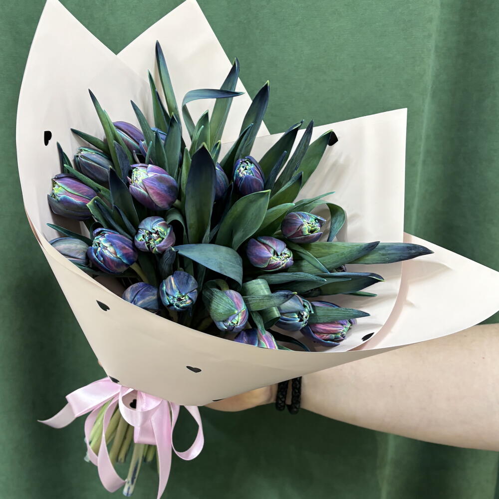 Пионовидные тюльпаны сине фиолетового оттенка «Лунная соната» в дизайнерской упаковке. Цвет упаковки может быть изменен по согласованию