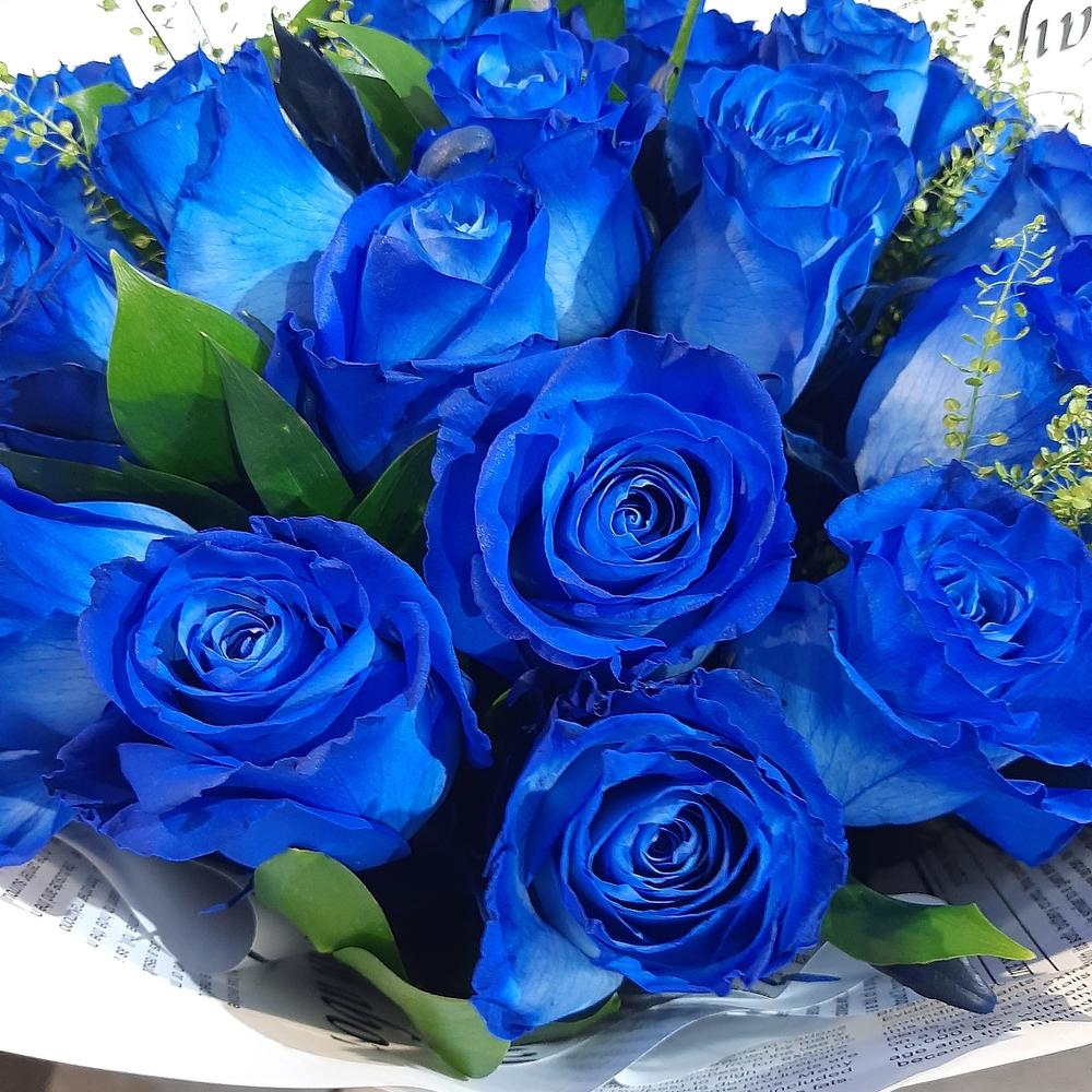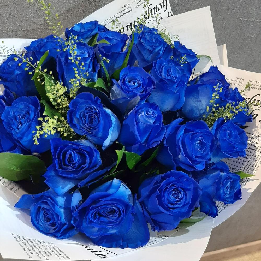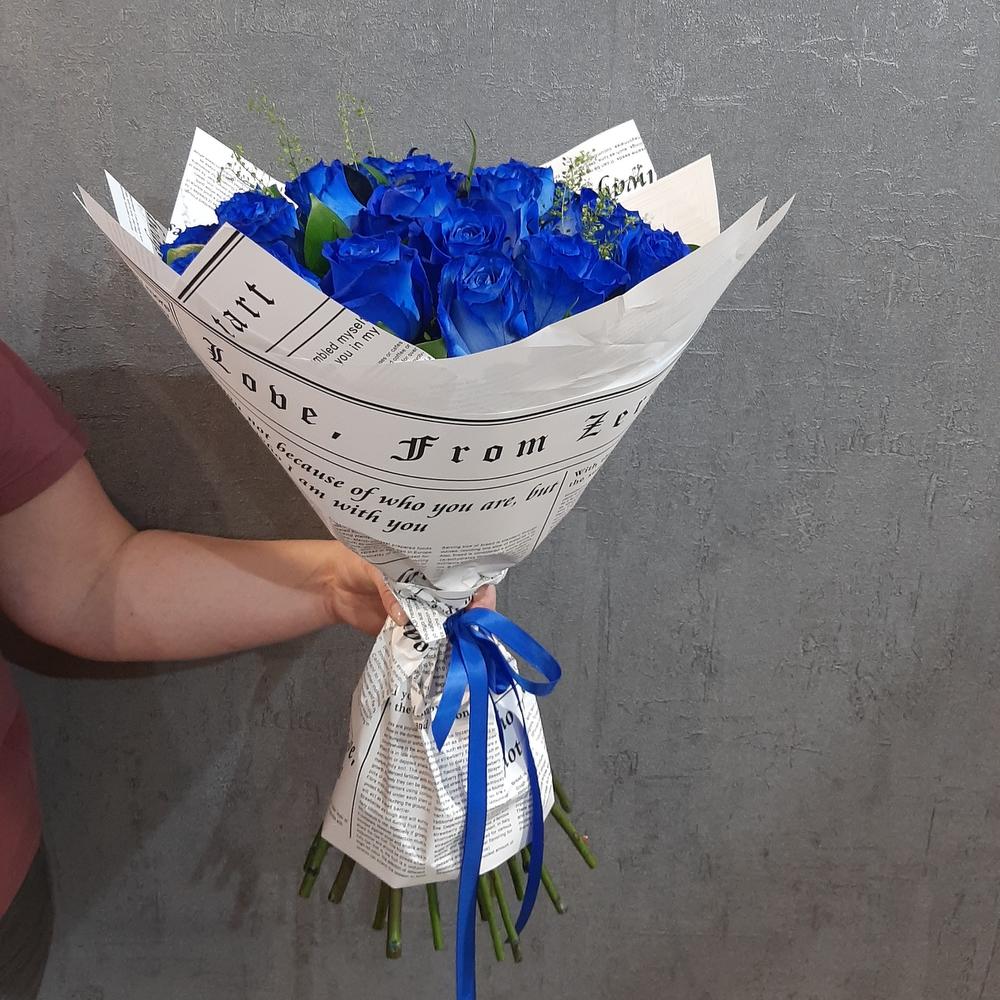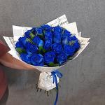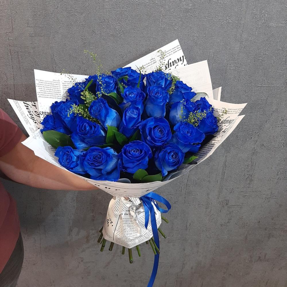 Рускус - 13 шт. Тласпи - 5 шт. Лента атласная - 1 шт. Упаковка дизайнерская - 1 шт. розы эквадор синие - 25 шт.